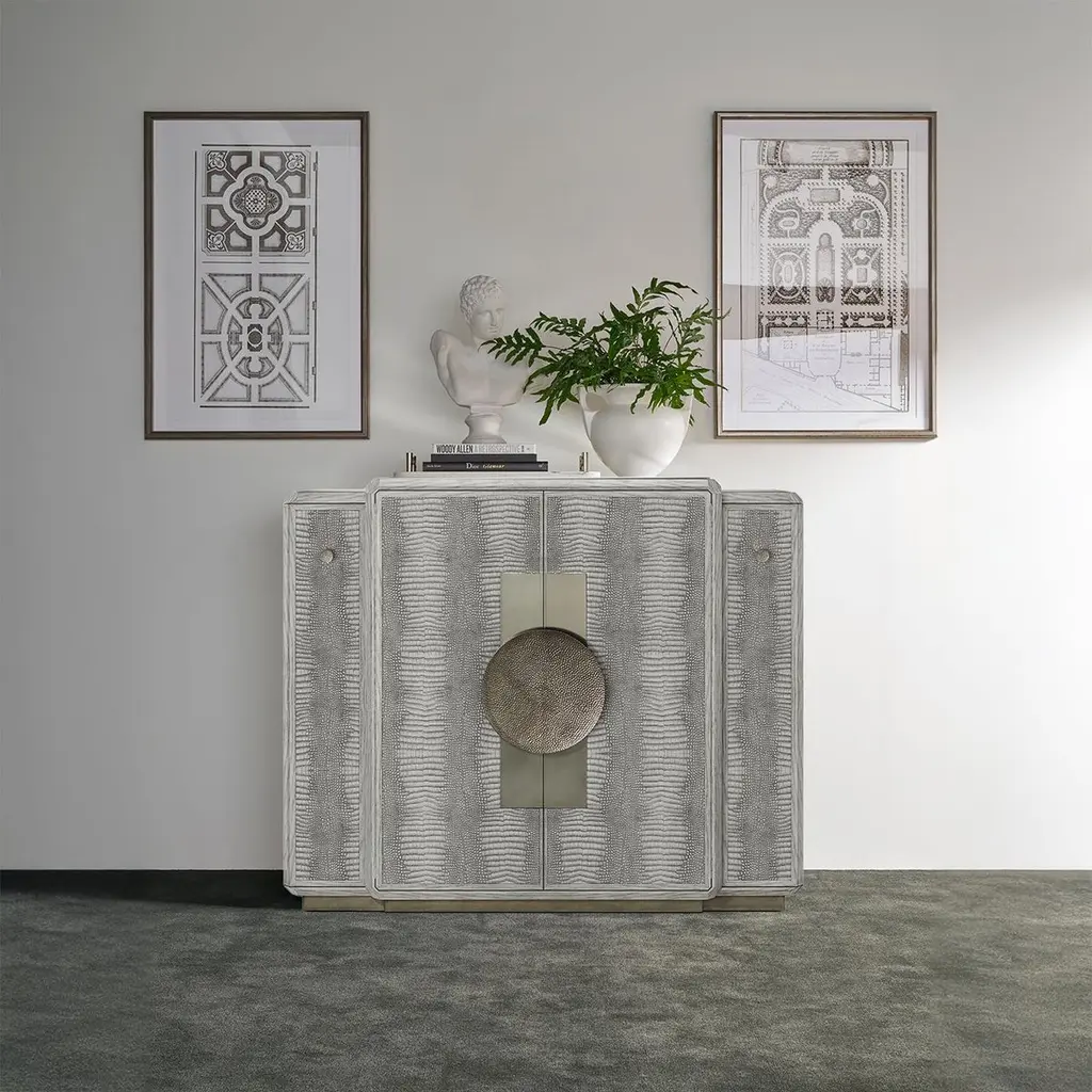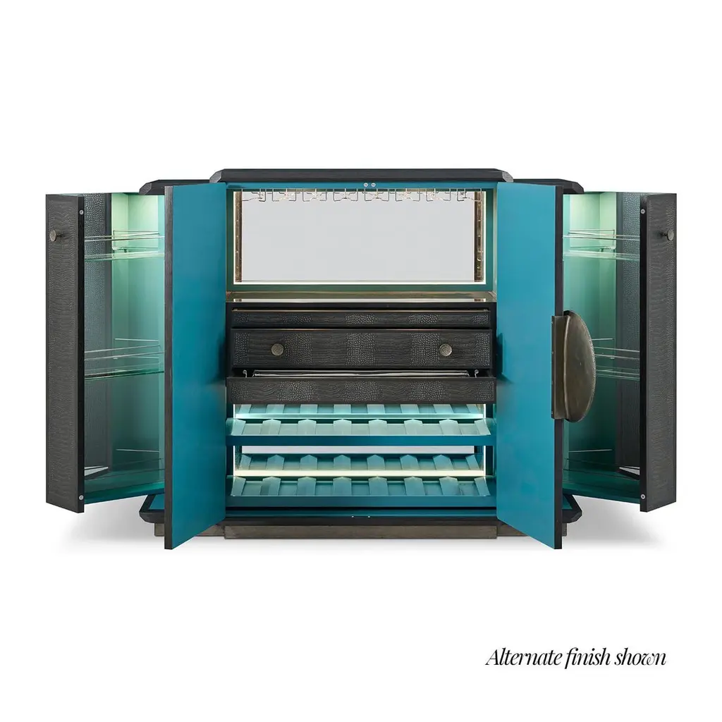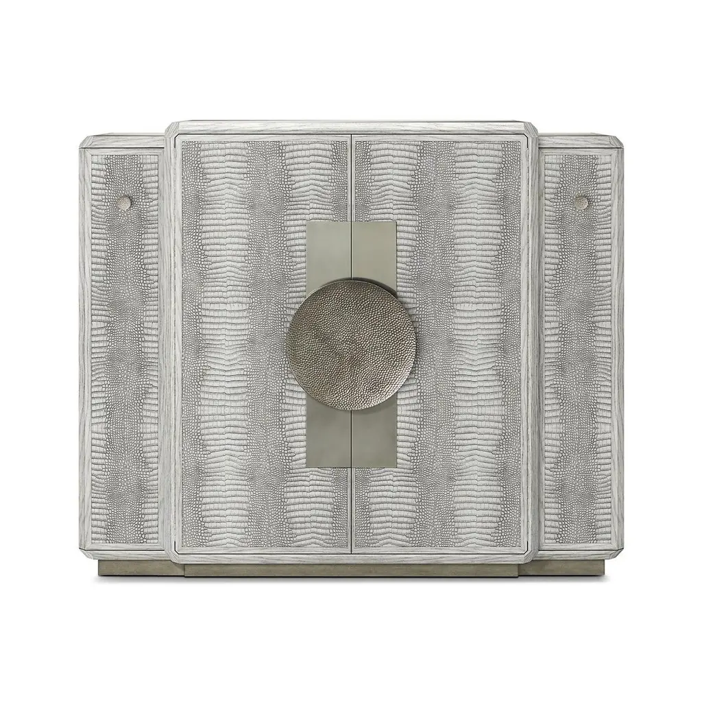 Crafted from oak and finished in a rich Gray Argento tone, this striking cabinet is adorned with crocodile-embossed leather and sculptural hammered metal hardware, creating a highly tactile and visually captivating presence.The faceted design, dramatic textures, and geometric influence make it a standout addition to any sophisticated interior. Perfect for entertaining, this bar cabinet offers ample storage for bottles, glassware, and bar essentials while serving as a centerpiece in both modern and Art Deco-inspired spaces.Dimensions: 59.5" W x 20" D x 54" H