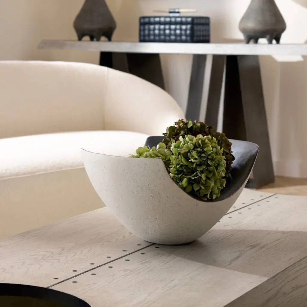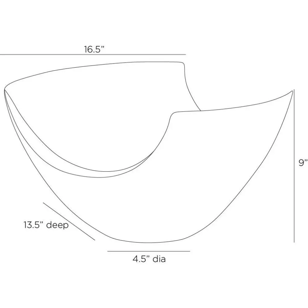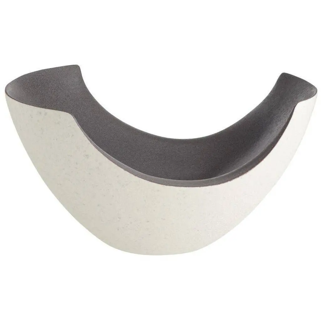 Hollowed for lightness, this swooping form of our open bowl draws the eye with its architectural lines. Glazed in our new sparrow reactive finish with a gunmetal reactive interior, this porcelain centerpiece features subtle oxblood tones on each seam to highlight the wave-like shape. Finish will vary.