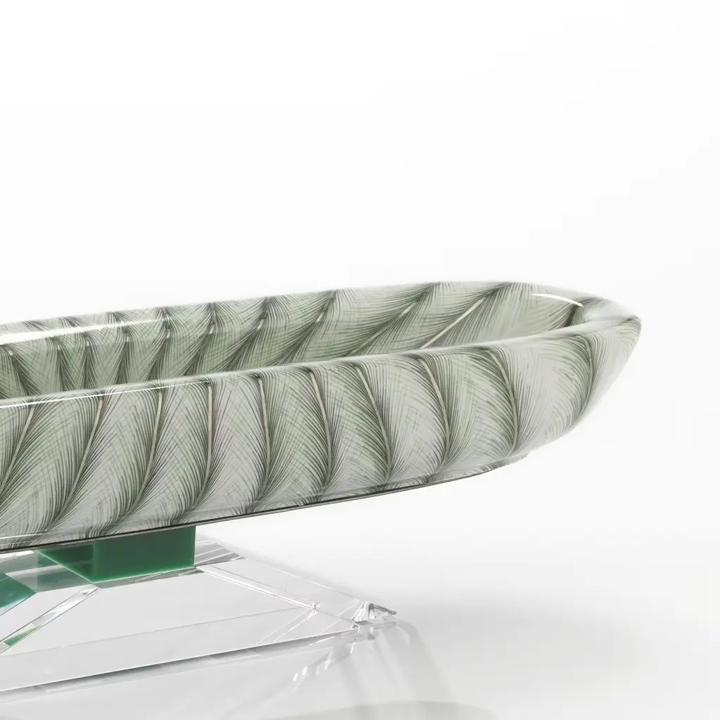 This striking centerpiece is comprised of an acrylic glass base and a porcelain elongated bowl elegantly adorned with green and 98% pure platinum decorations finely rendering elegant featherlike leaves.