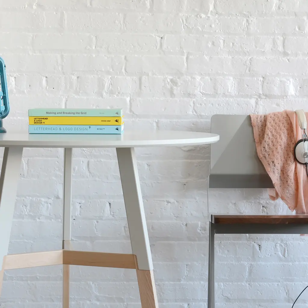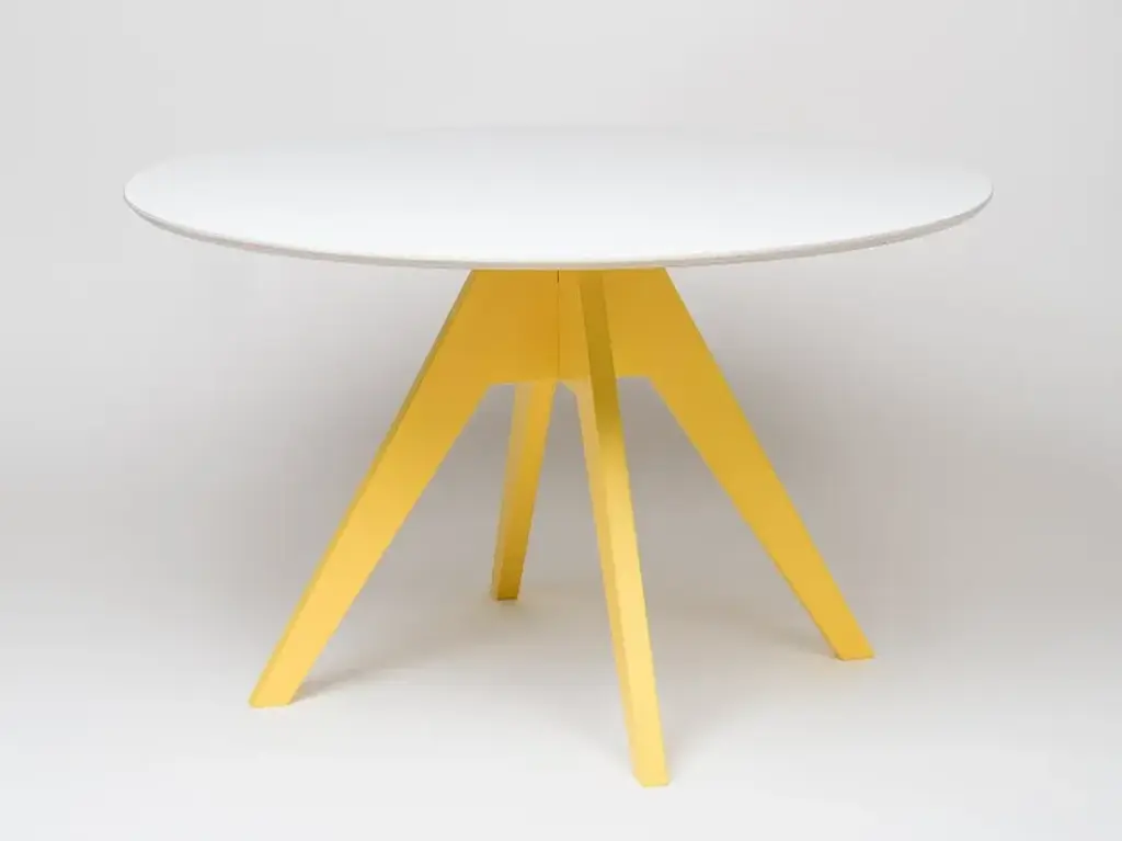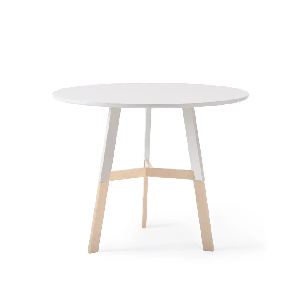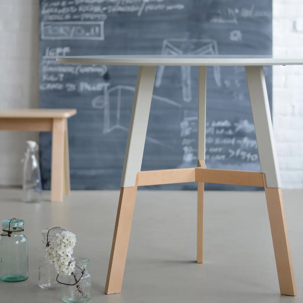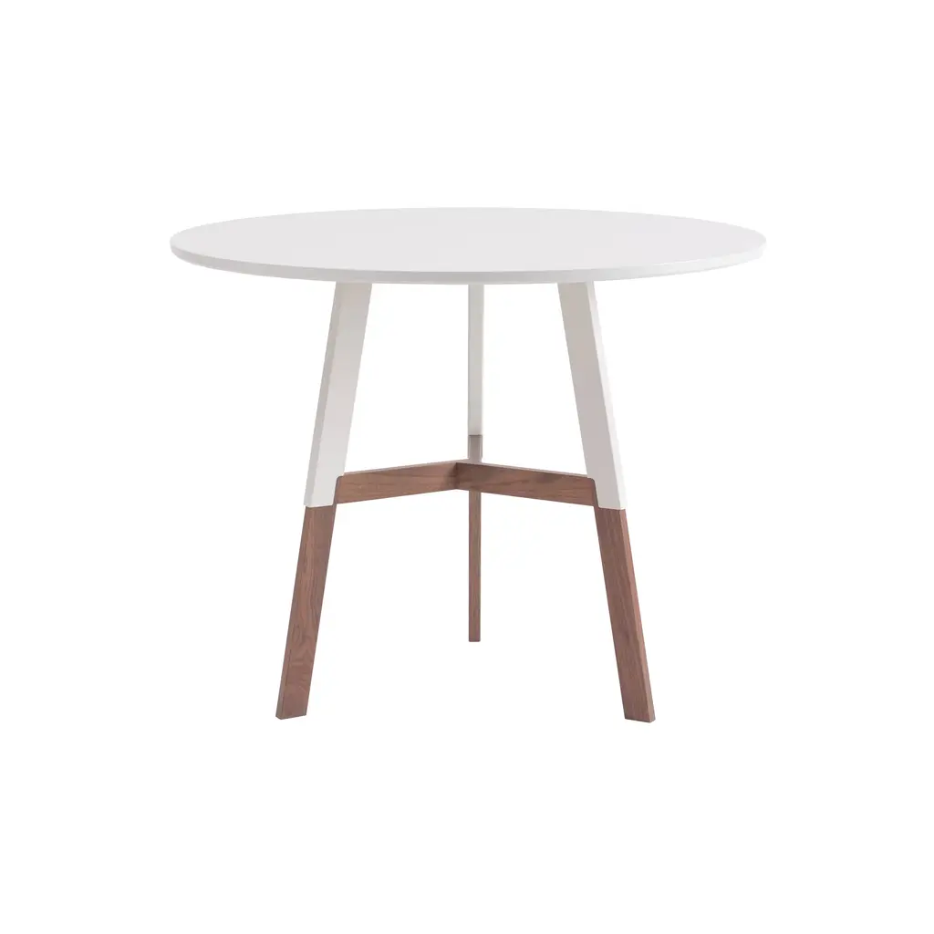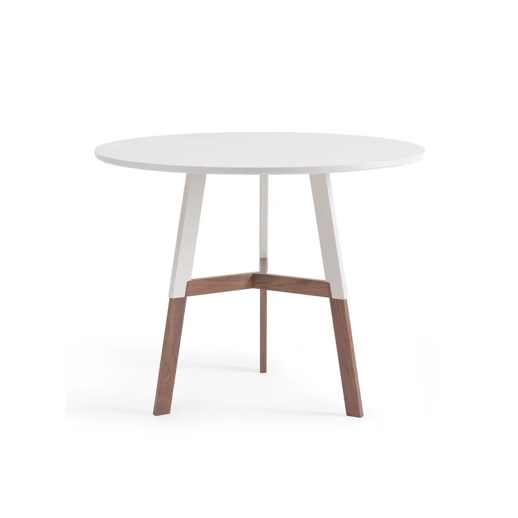 Designed with two-toned legs connected with a pinwheel joint, the Misewell Nelson Cafe Table can easily become the centerpiece of a living room. Additionally, the quality craftsmanship makes this table perfect for public settings, including coffee shops or restaurants. The design maximizes visual impact with a combination of solid wood and metal. While the wood boasts a natural color and grain textures, the metal sections feature a smooth and bright white powder-coated finish. The Misewell Nelson Cafe Table comes with maple or walnut wood legs – each option enhances the contemporary design in subtly different ways.