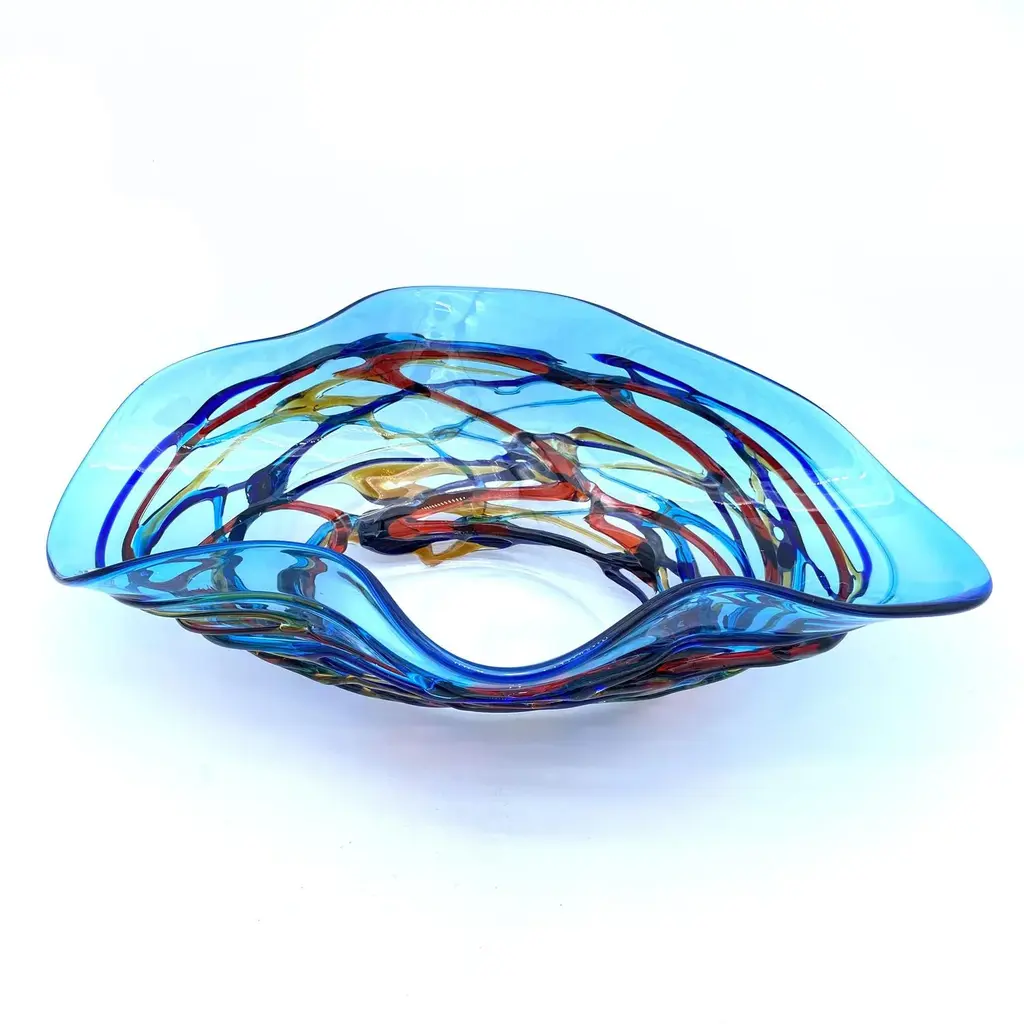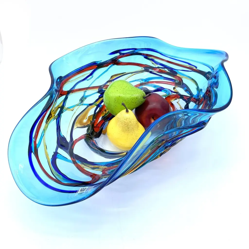 Centerpiece in light blue Murano glass, embellished with multicolored filaments that give a touch of freshness and elegance to your furniture. Handcrafted, this unique blown glass piece is perfect for any occasion and adds unique value to any setting. Labeled by Maker