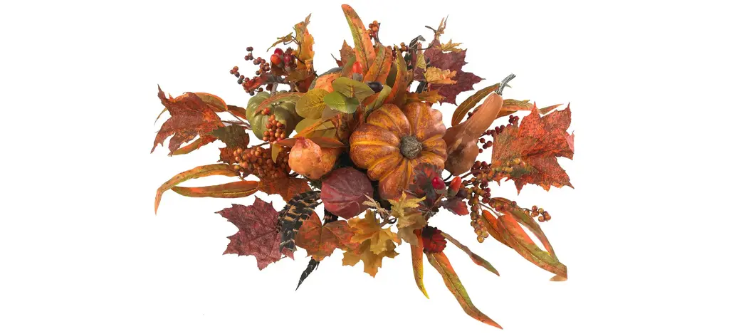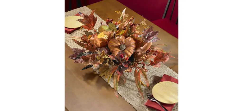 Add a burst of fall color to your holiday table with this stunning Harvest centerpiece. A full 26" in length, this wonderful holiday accent is filled with the "fruits of fall", wispy leaves, and colored berries. Plus, it will never wilt or spoil, making it an annual guest at all of your holiday dinners.