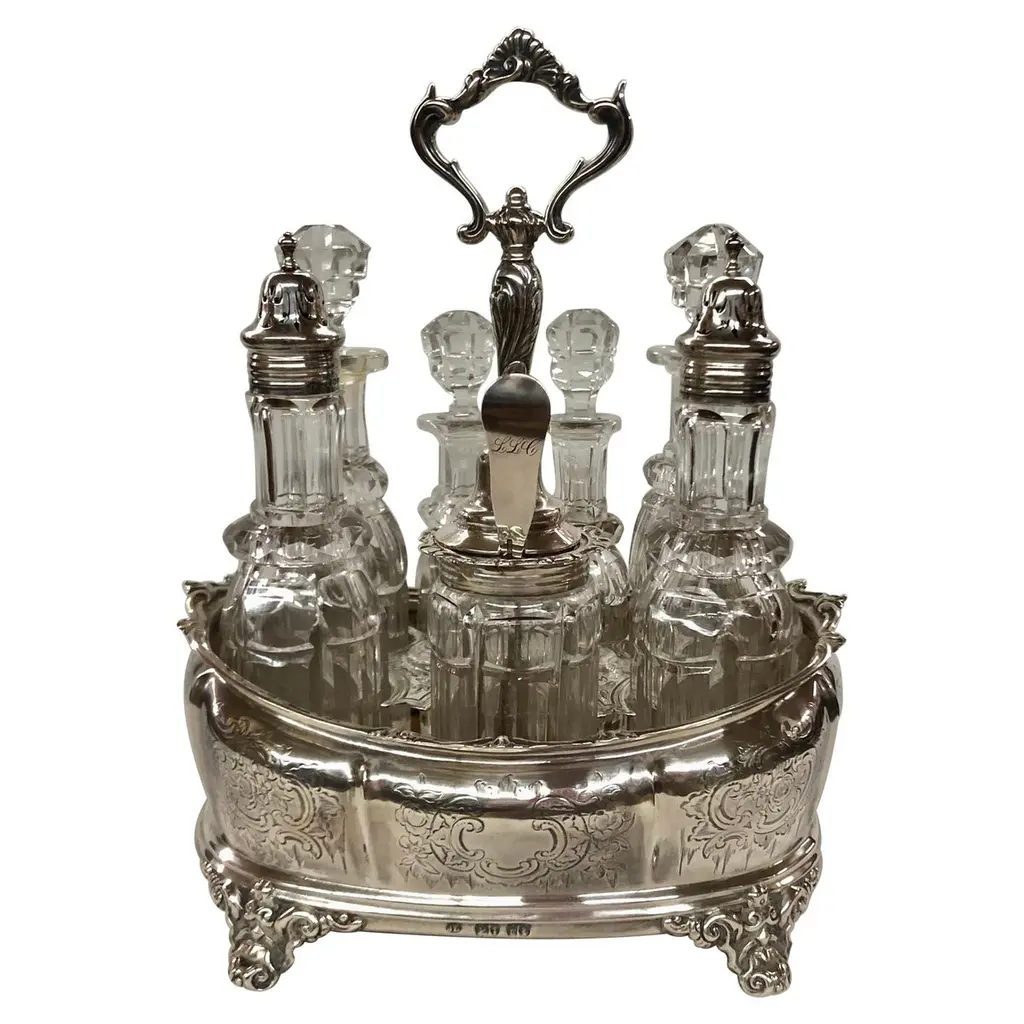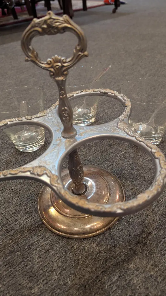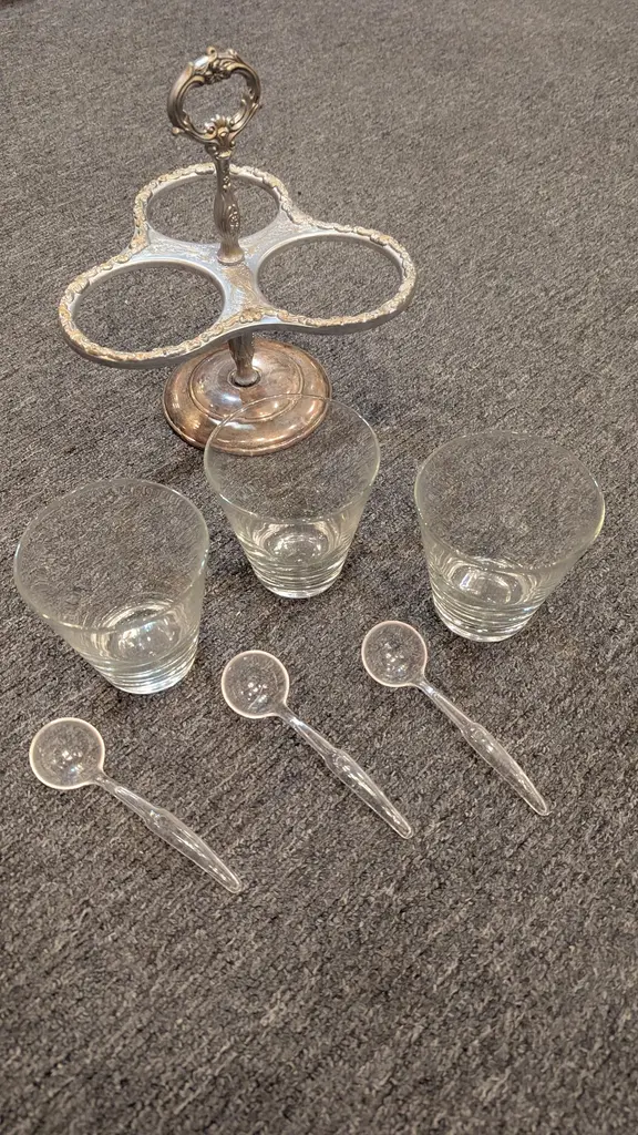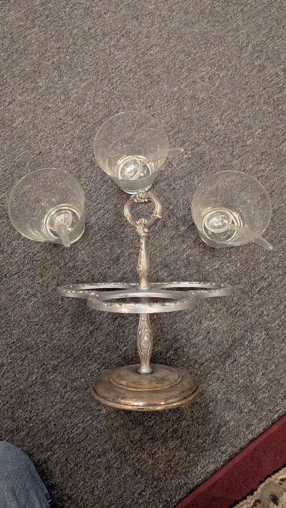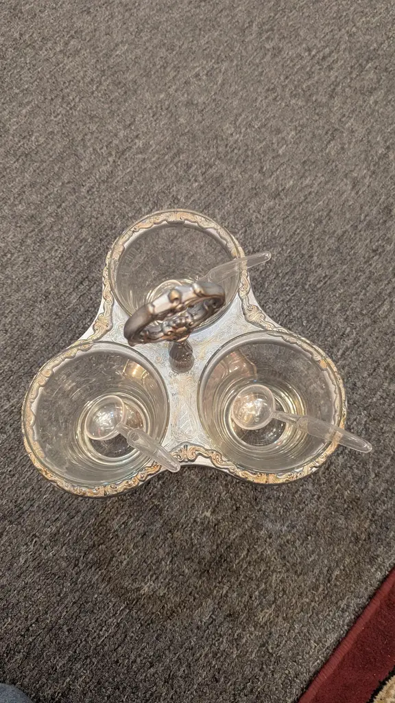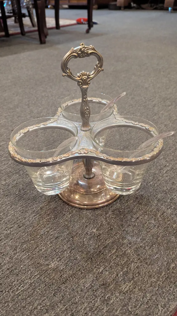 Hollywood Regency Sauce server, silver plate condiment holder with three suspended glass sauce holders, each with original spoon server. Beautiful 1950's centerpiece for your party.