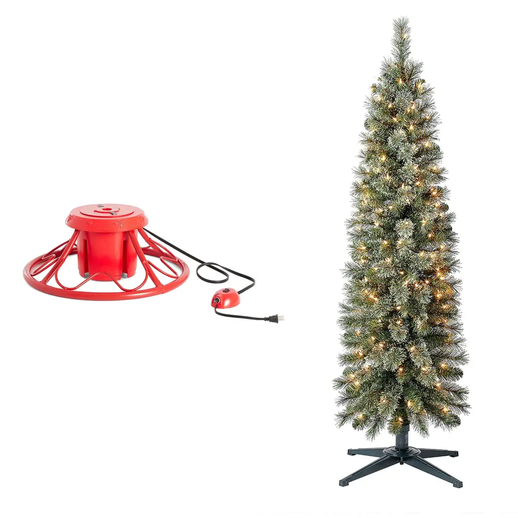 Create an unforgettable holiday display with the Home Heritage Rotating Tree Stand Base and Snowdrift Quick Set Pre-Lit Artificial Christmas Tree. This dynamic duo brings convenience and elegance, ensuring your tree stands tall and beautifully illuminated. The 22-inch rotating base supports artificial trees up to 9 feet tall, securely holding poles from 1 to 1.75 inches in diameter. Designed for full 360-degree rotation, this stand lets every angle of your decorated tree shine, adding festive cheer from every side. Crafted from durable metal, it's reliable for seasonal enjoyment and effortless storage. The Stanley Pencil Pine Pre-Lit Artificial Christmas Tree, standing 5 feet tall and 16 inches wide, brings festive charm to any space. Ideal for compact areas or group displays, this slim tree offers 186 lush foliage tips with a snowy finish, creating a winter wonderland look without the hassle of shedding needles. With 150 white incandescent lights and a sturdy metal stand, it's easy to set up and dismantle, adding a warm glow to holiday gatherings and lasting memories. Ideal for cozy apartments or grand foyers, this tree embodies holiday cheer and simplicity in design. Together, the Home Heritage Rotating Tree Stand Base and Snowdrift 6.5 Ft Pre-Lit Artificial Christmas Holiday Tree elevate holiday traditions, providing a memorable centerpiece that's easy to assemble and store. Experience easy holiday decorating, showcasing a beautiful and well-supported tree for gatherings and cherished memories, all in one delightful setup. This holiday bundle includes a high-quality rotating Christmas tree stand and the Home Heritage Stanley Skinny Pencil Pine Pre-Lit Christmas Tree Durable rotating artificial Christmas tree stand supports trees up to 9 feet tall or weighing up to 120 pounds Includes 3 adapters which make it compatible with 1-inch, 1.25-inch, and 1.75-inch diameter tree poles for exact fit Elevate your holiday decor with the Home Heritage Snowdrift Christmas Tree, standing 6.5 feet tall and adorned with 777 foliage tips Pre-lit with 500 warm white LED lights to illuminate your home and add an enchanting glow that enhances the holiday atmosphere Home Heritage 1-1.75" Artificial Christmas Tree Base Rotating Metal Stand Easily control tree functions with a base on/off switch and long power cord Durable base supports your tree while rotating smoothly to enhance holiday cheer Unique 360-degree rotation showcases every side of your tree Simple setup: plug the tree cord into the base, then the base into the outlet Color: Red Dimensions (L x W x H): 22 x 22 x 9 inches Weight: 15 pounds Home Heritage Stanley 5 Foot Skinny Pencil Pine Pre-Lit Artificial Christmas Tree Holiday Decor Crafted with durability in mind, including a sturdy metal stand to provide a simple assembly process when the season occurs Tip count: 335 tips Light count: 350 lights Material: PVC Color: Green Dimensions (W x H): 16 x 60 inches Weight: 12.18 pounds