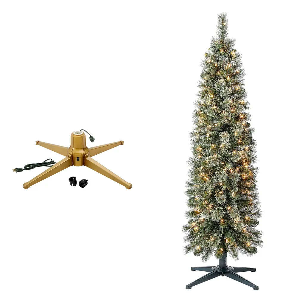 Create an unforgettable holiday display with the Home Heritage Rotating Tree Stand Base and Stanley Skinny Pencil Pre-Lit Artificial Christmas Tree. This dynamic duo brings convenience and elegance, ensuring your tree stands tall and beautifully illuminated. The 31-inch rotating base supports artificial trees up to 7.5 feet tall, securely holding poles from 1 to 1.5 inches in diameter. Designed for full 360-degree rotation, this stand lets every angle of your decorated tree shine, adding festive cheer from every side. Crafted from durable metal, it's reliable for seasonal enjoyment and effortless storage. The Stanley Pencil Pine Pre-Lit Artificial Christmas Tree, standing 5 feet tall and 16 inches wide, brings festive charm to any space. Ideal for compact areas or group displays, this slim tree offers 186 lush foliage tips with a snowy finish, creating a winter wonderland look without the hassle of shedding needles. With 150 white incandescent lights and a sturdy metal stand, it's easy to set up and dismantle, adding a warm glow to holiday gatherings and lasting memories. Ideal for cozy apartments or grand foyers, this tree embodies holiday cheer and simplicity in design. Together, the Home Heritage Rotating Tree Stand Base and Stanley Skinny Pencil Pre-Lit Artificial Christmas Tree elevate holiday traditions, providing a memorable centerpiece that's easy to assemble and store. Experience easy holiday decorating, showcasing a beautiful and well-supported tree for gatherings and cherished memories, all in one delightful setup. This holiday bundle includes a high-quality rotating Christmas tree stand and the Home Heritage Stanley Skinny Pencil Pine Pre-Lit Artificial Christmas Tree Durable rotating artificial Christmas tree stand supports trees up to 7.5 feet tall or weighing up to 90 pounds Includes 3 adapters which make it compatible with 1-inch, 1.25-inch, and 1.5-inch diameter tree poles for exact fit Elevate your holiday decor with the Home Heritage Cascade Christmas Tree, standing 7 feet tall and adorned with 186 foliage tips Pre-lit with 450 color-changing LED lights and 8 lighting effect functions to illuminate your home and add an enchanting glow Home Heritage 1-1.5" Artificial Christmas Tree Base Rotating Metal Stand Easily control tree functions with a base on/off switch and long power cord Durable base supports your tree while rotating smoothly to enhance holiday cheer Unique 360-degree rotation showcases every side of your tree Simple setup: plug the tree cord into the base, then the base into the outlet Color: Gold Dimensions (W x H): 31 x 2.50 inches Weight: 4.85 pounds Part number: GX1624U31511 Home Heritage Stanley 5 Foot Skinny Pencil Pine Pre-Lit Artificial Christmas Tree Holiday Decor Crafted with durability in mind, including a sturdy metal stand to provide a simple assembly process when the season occurs Tip count: 335 tips Light count: 350 lights Material: PVC Color: Green Dimensions (W x H): 16 x 60 inches Weight: 12.18 pounds Part number: TV50M2638C00