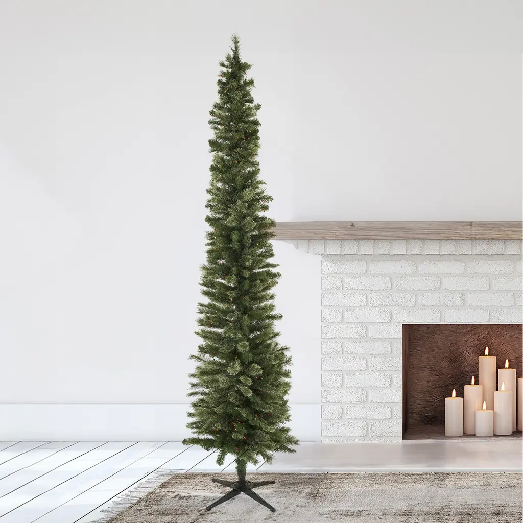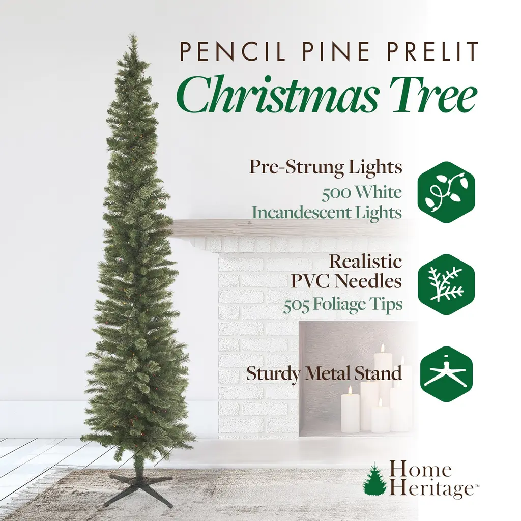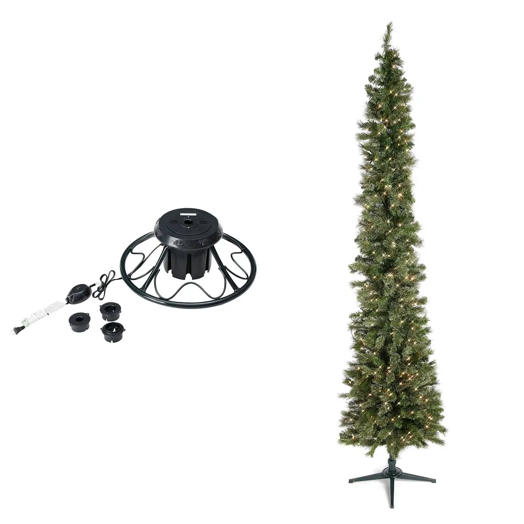 Create an unforgettable holiday display with the Home Heritage Rotating Tree Stand Base and Stanley Skinny Pencil Pre-Lit Artificial Christmas Tree. This dynamic duo brings convenience and elegance, ensuring your tree stands tall and beautifully illuminated. The 22-inch rotating base supports artificial trees up to 9 feet tall, securely holding poles from 1 to 1.75 inches in diameter. Designed for full 360-degree rotation, this stand lets every angle of your decorated tree shine, adding festive cheer from every side. Crafted from durable metal, it's reliable for seasonal enjoyment and effortless storage. The Stanley Pencil Pine Pre-Lit Artificial Christmas Tree, standing 9 feet tall and 28 inches wide, brings festive charm to any space. Ideal for compact areas or group displays, this slim tree offers 505 lush foliage tips with a snowy finish, creating a winter wonderland look without the hassle of shedding needles. With 500 white incandescent bulb lights and a sturdy metal stand, it's easy to set up and dismantle, adding a warm glow to holiday gatherings and lasting memories. Ideal for cozy apartments or grand foyers, this tree embodies holiday cheer and simplicity in design. Together, the Home Heritage Rotating Tree Stand Base and Stanley Skinny Pencil Pre-Lit Artificial Christmas Tree elevate holiday traditions, providing a memorable centerpiece that's easy to assemble and store. Experience easy holiday decorating, showcasing a beautiful and well-supported tree for gatherings and cherished memories, all in one delightful setup. This holiday bundle includes a high-quality rotating Christmas tree stand and the Home Heritage Stanley Skinny Pencil Pine Pre-Lit Christmas Tree Durable rotating artificial Christmas tree stand supports trees up to 9 feet tall or weighing up to 120 pounds Includes 3 adapters which make it compatible with 1-inch, 1.25-inch, and 1.75-inch diameter tree poles for exact fit Elevate your holiday decor with the Stanley Skinny Pencil Christmas Tree, standing 9 feet tall and adorned with 505 foliage tips Pre-lit with 500 white incandescent bulb lights to illuminate your home and add an enchanting glow that enhances the holiday atmosphere Home Heritage 1-1.75" Artificial Christmas Tree Base Rotating Metal Stand Easily control tree functions with a base on/off switch and long power cord Durable base supports your tree while rotating smoothly to enhance holiday cheer Unique 360-degree rotation showcases every side of your tree Simple setup: plug the tree cord into the base, then the base into the outlet Color: Black Dimensions (L x W x H): 22 x 22 x 9 inches Weight: 15 pounds Home Heritage Stanley 9-Foot Skinny Pencil Pine Pre-Lit Artificial Christmas Tree Holiday Decor Crafted with durability in mind, including a sturdy metal stand to provide a simple assembly process when the season occurs Tip count: 505 tips Light count: 500 lights Material: PVC Color: Green Dimensions (W x H): 28 x 108 inches Weight: 22.37 pounds