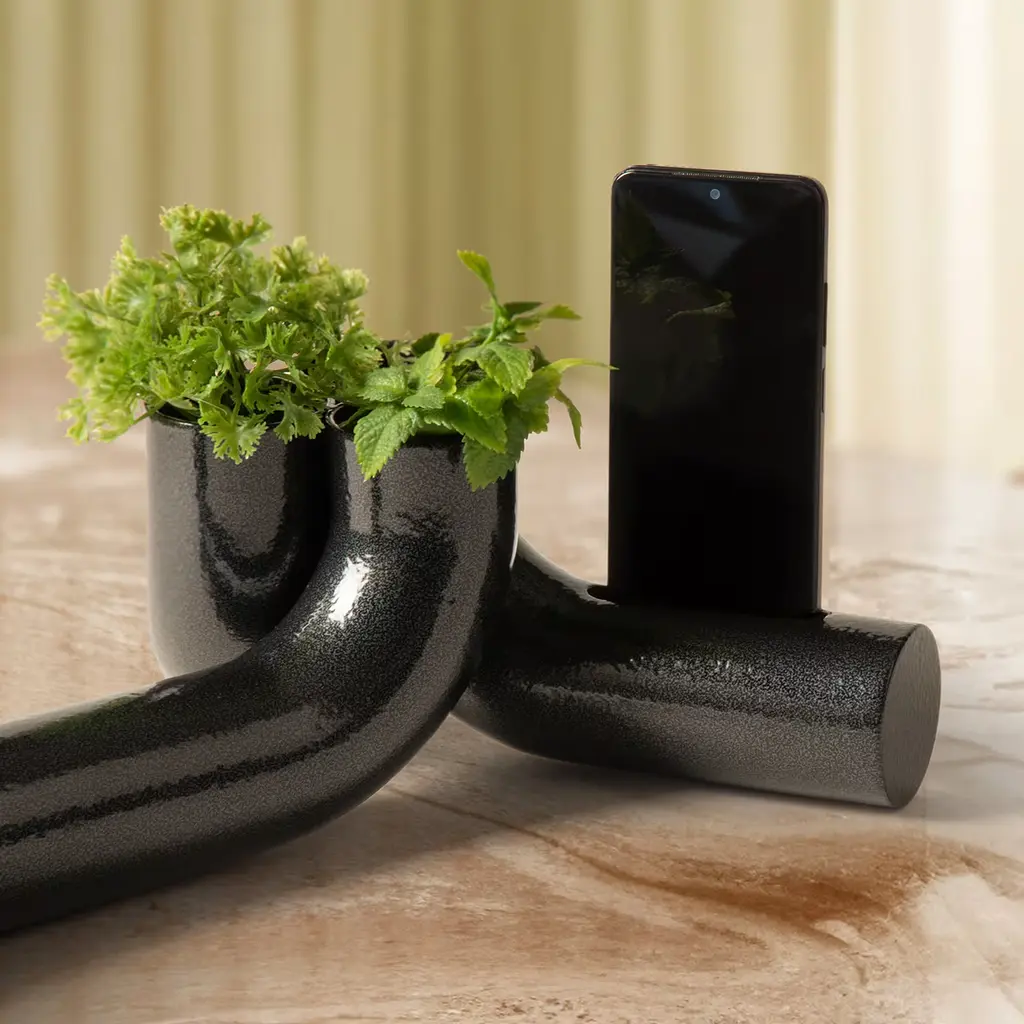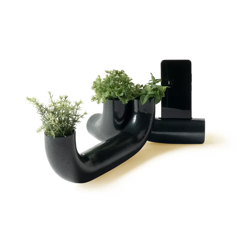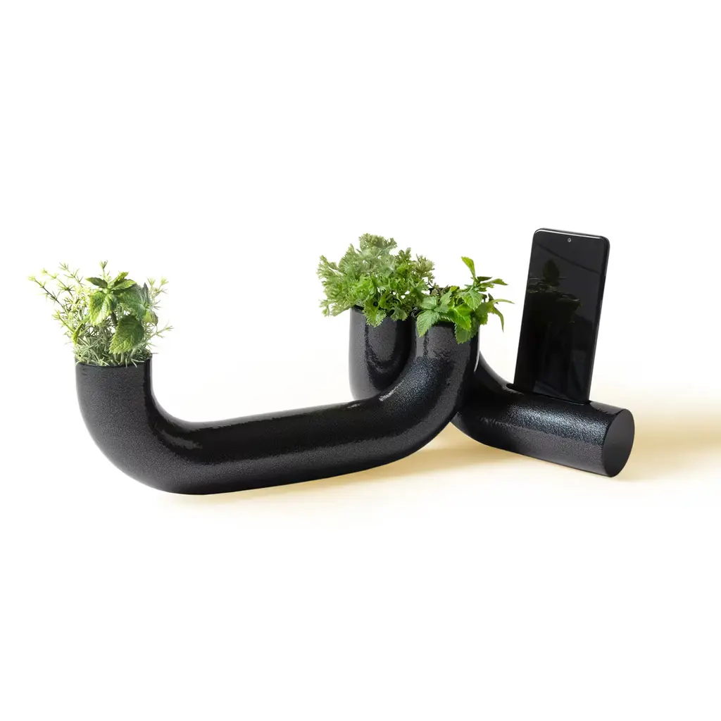 Imagine being able to garnish dishes with fresh herbs right from your table, an age-old practice now revitalized. "Impianto" is a centerpiece that houses edible herbs and visually pleasing plants. It's made from prefabricated tubular elements intricately woven like plant roots, creating a linear yet complex form. This design accommodates both herbs and a cellphone, seamlessly blending aesthetic appeal with modern functionality for everyday life.