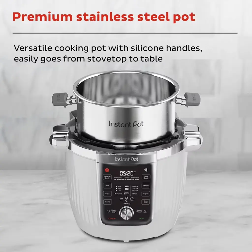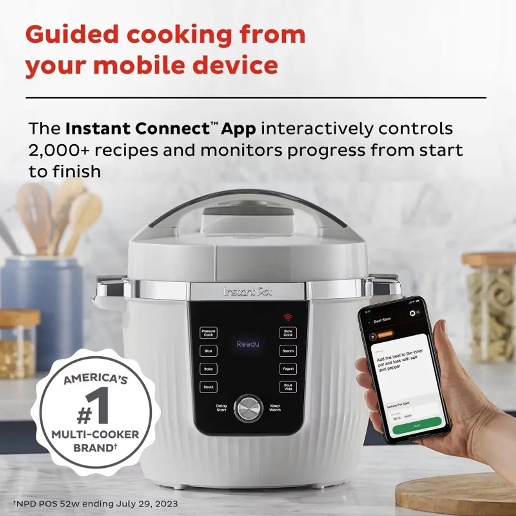 The Instant Pot® Pro Max makes cooking effortless—and a little futuristic. With built-in Wi-Fi connectivity, you can control and monitor your cooking straight from the Instant Connect™ App, following over 2,000 interactive recipes with step-by-step guidance. The pearl-white fluted design is a countertop showstopper, while 20% more power* means faster preheating and golden browning. A tri-ply stainless-steel pot ensures even heating, and Nutriboost™ pulses bring your rice, soups, and risottos to perfection. With WhisperQuiet™ steam release and real-time status updates, cooking has never looked—or felt—this good.*Compared to our Instant Pot® Duo® and Instant Pot® RIO™ models.