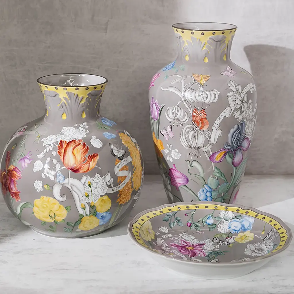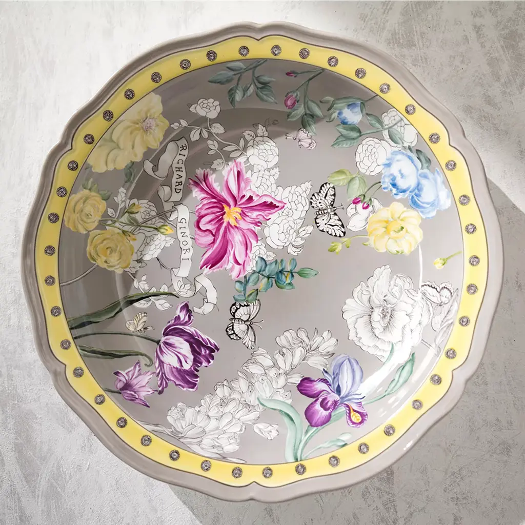 An exquisite combination of elegant lines and hues, this centerpiece will make a refined statement in a sophisticated decor. Part of a series of porcelain objects named after the Iris Garden of Florence, it features a hand painted decoration inspired by German naturalist and painter Maria Sibylla Merian. This piece is not suitable for food use.
