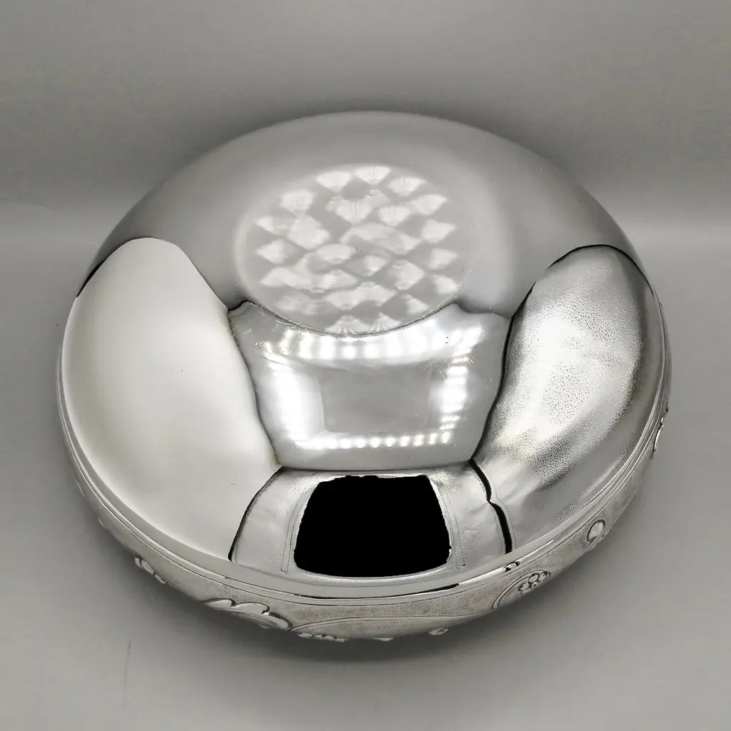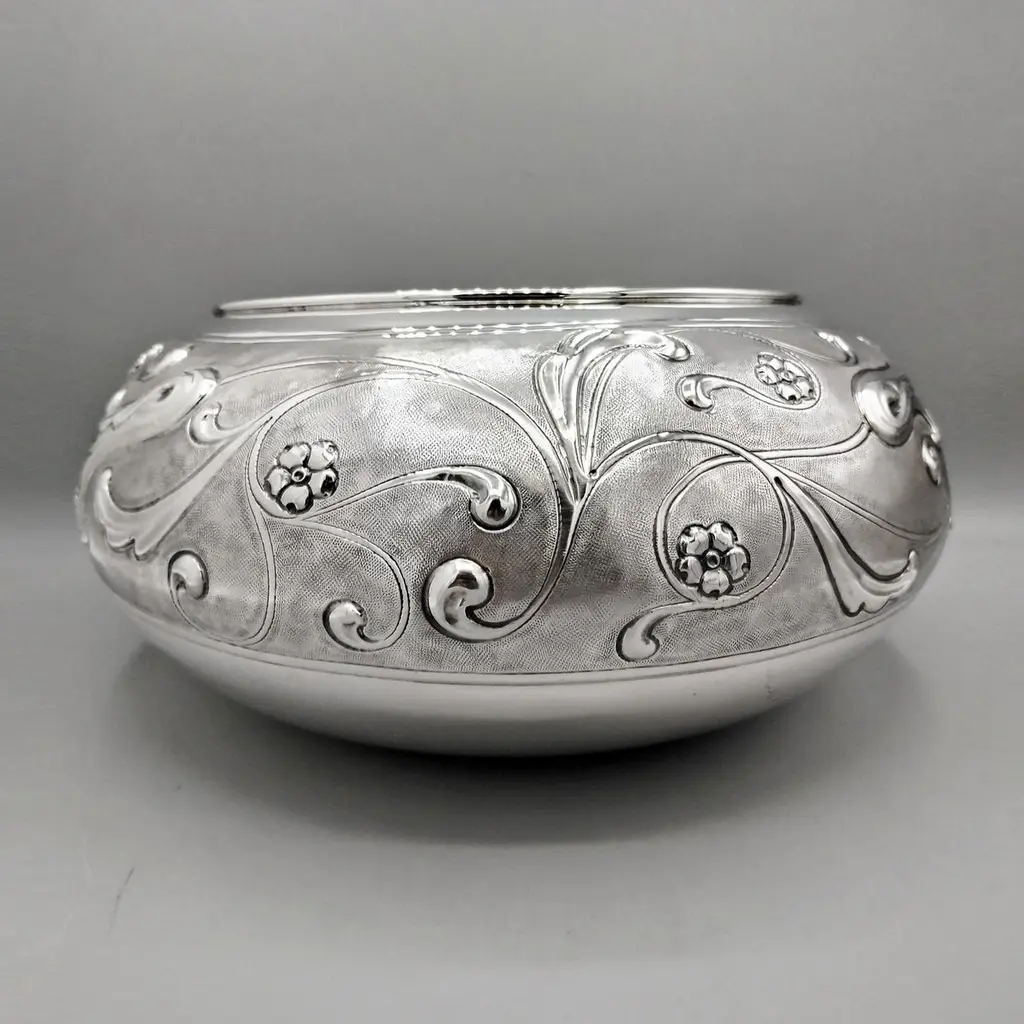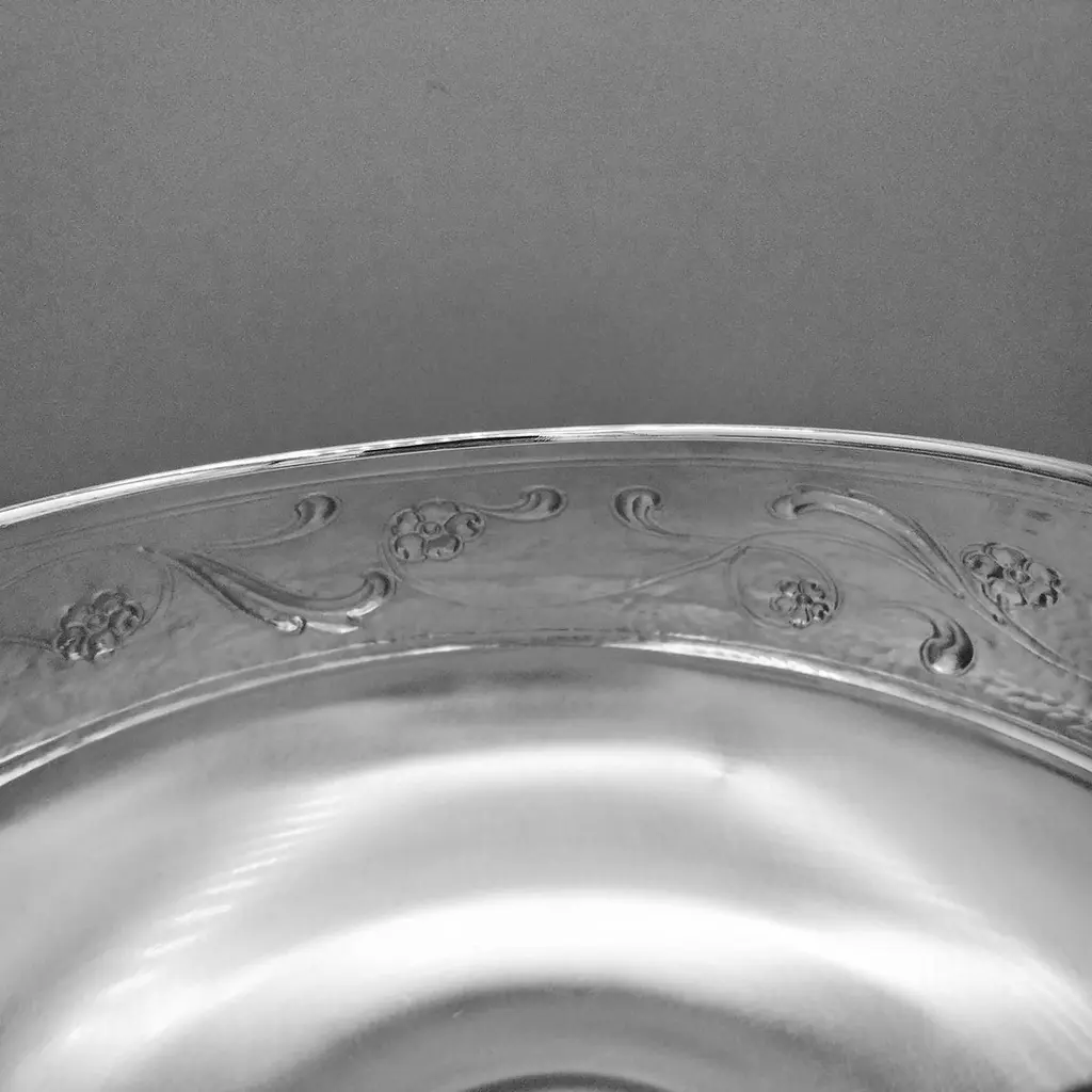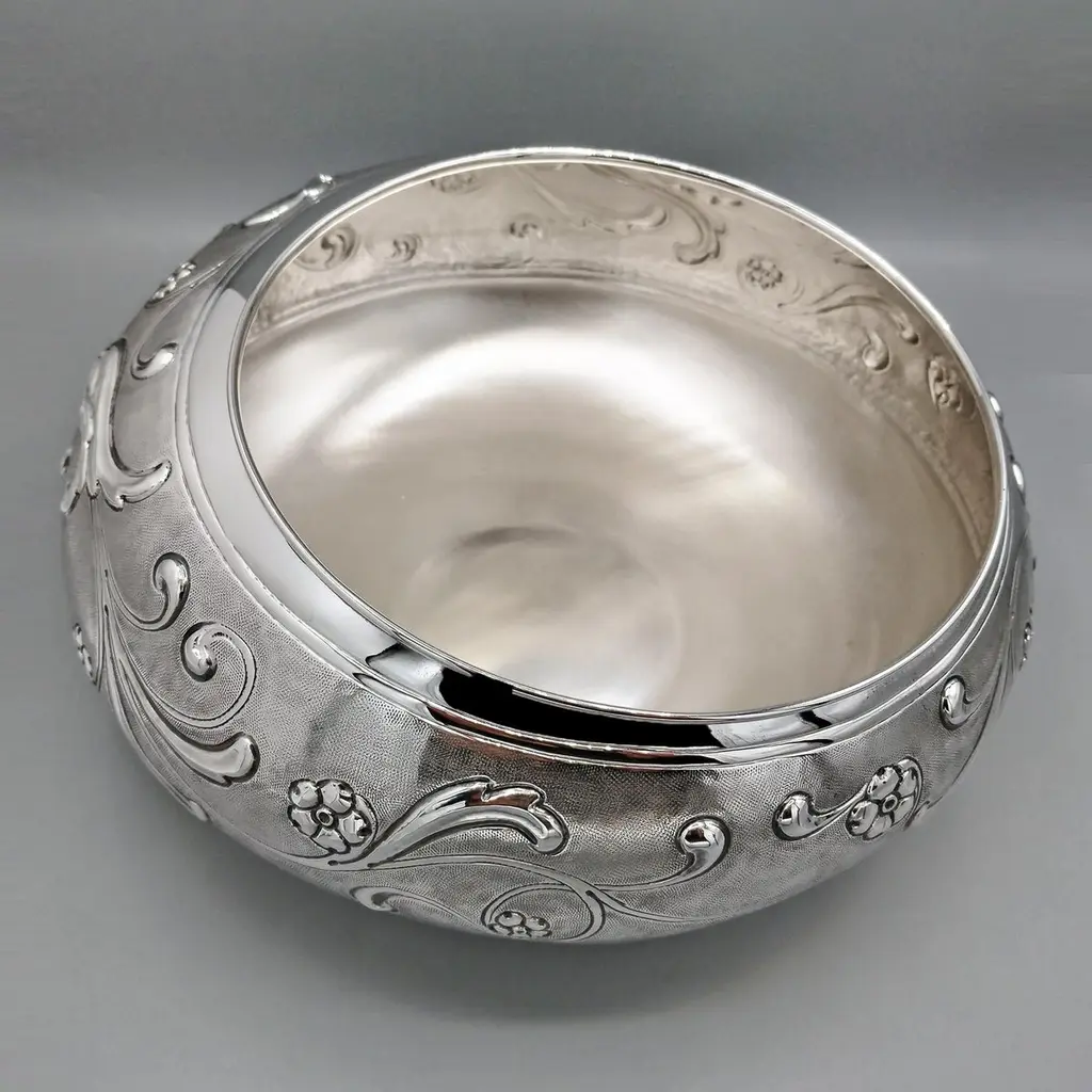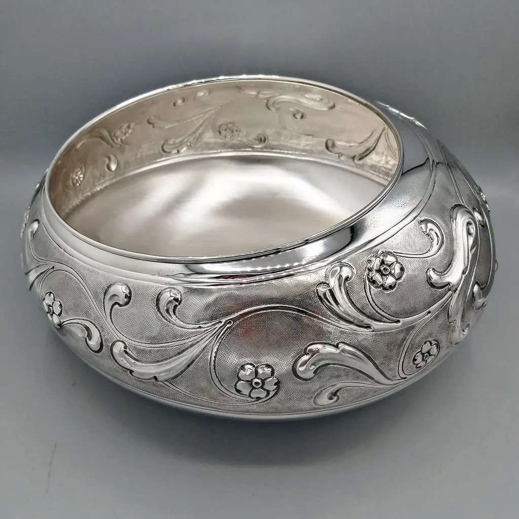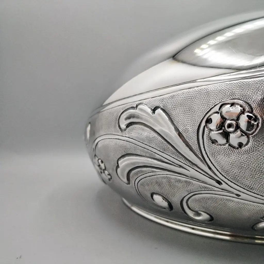 Sterling silver centerpiece made entirely by hand with scrolls and flowers"Off-center" sterling silver centerpiece.The upper part of the body features embossed and chiseled designs depicting flowers and scrolls.A knurling, a small, dense hammering, was applied between the chisels to highlight the decorations.The lower part of the centerpiece's body has been left smooth.The distinctive feature of this centerpiece is that the "mouth" has been deliberately off-center and its height decreases.These details make it unique and highlight the workmanship, which is entirely handmade in Milan, Italy, in the artisanal workshop of Argenteria di Monti Osvaldo, designed by ARVAL ARGENTI VALENZA