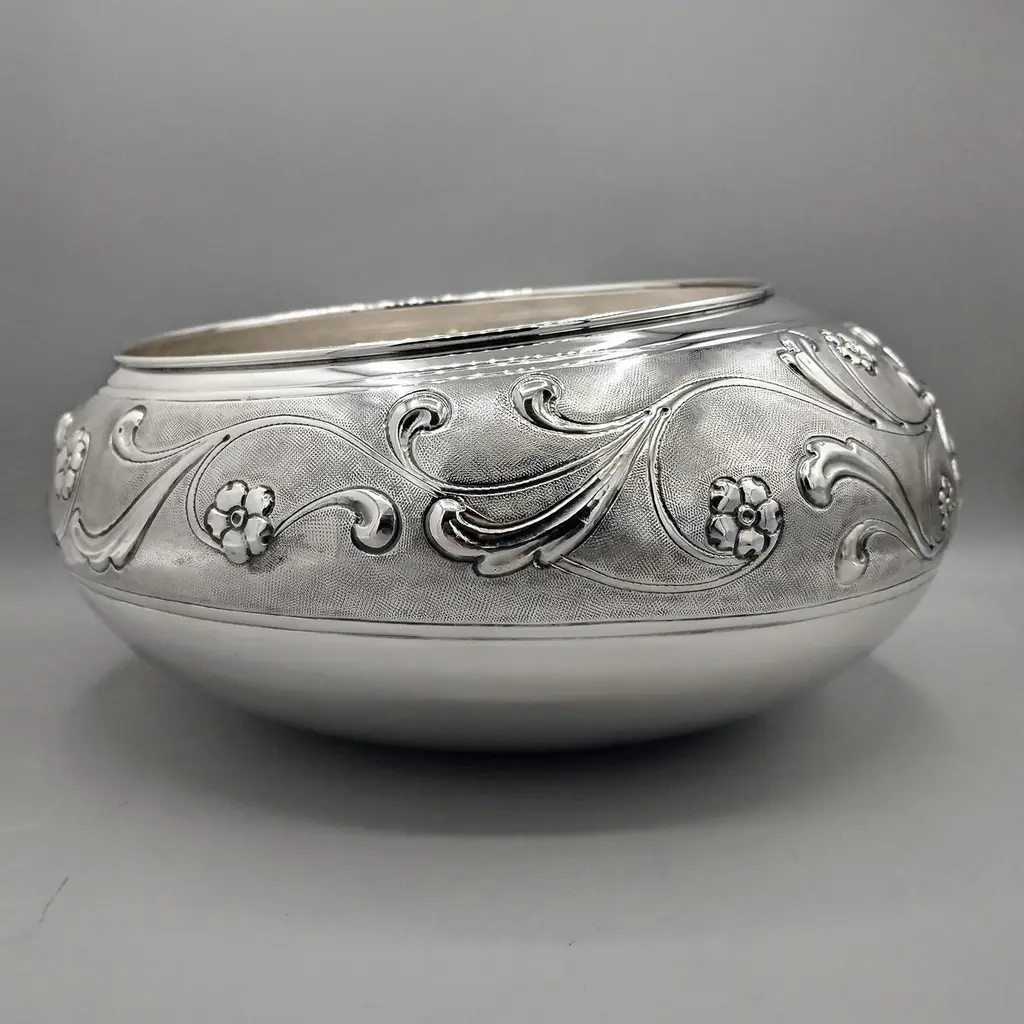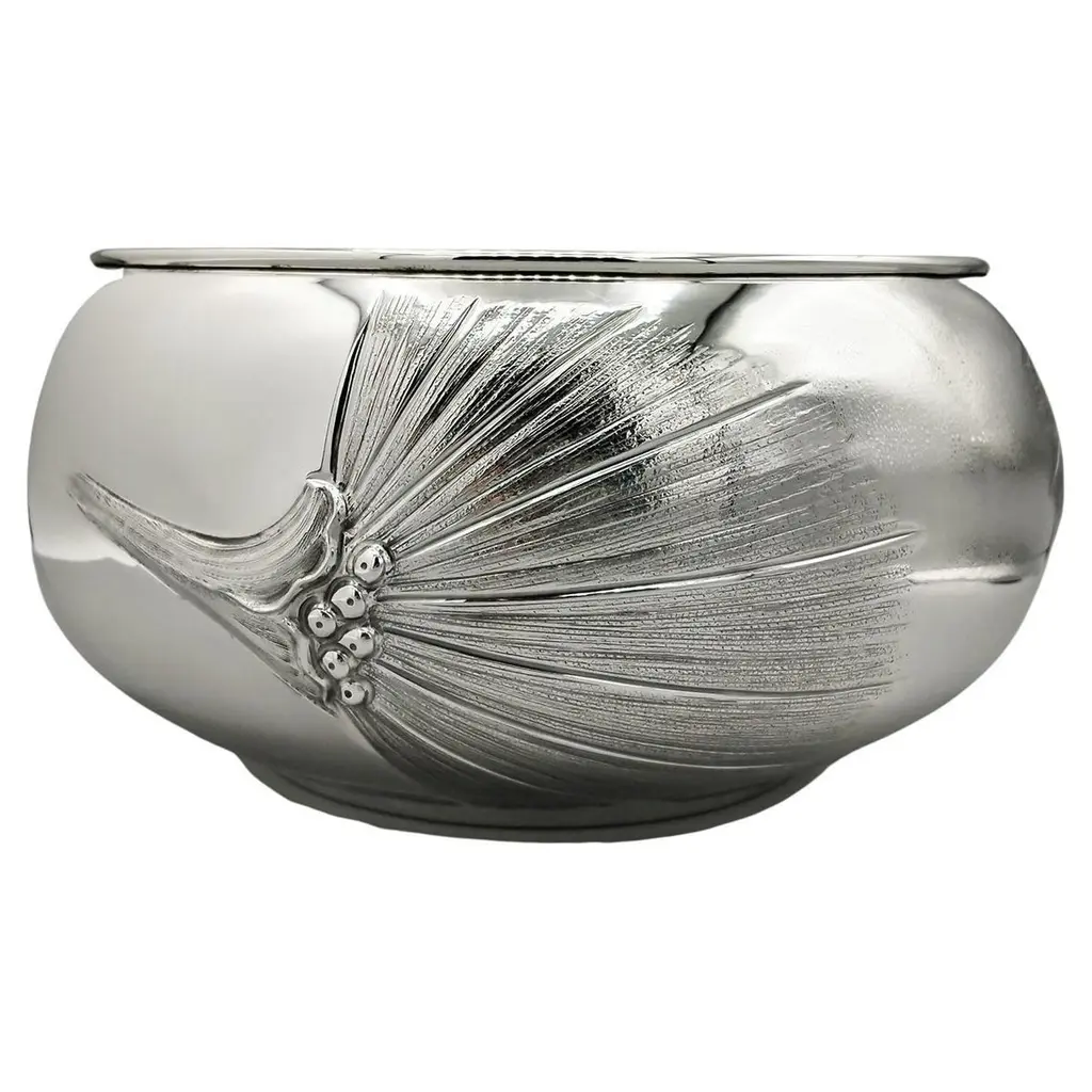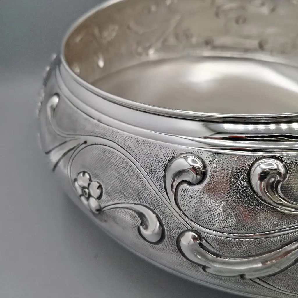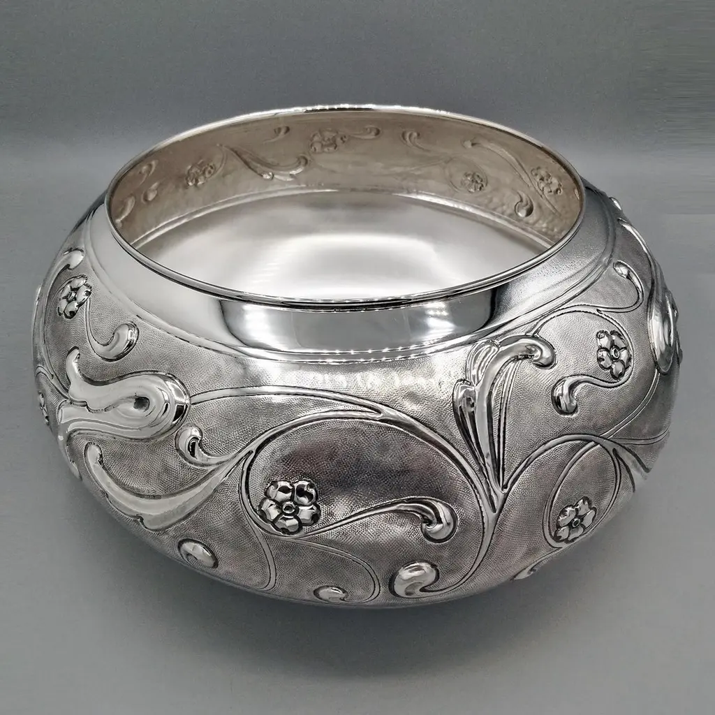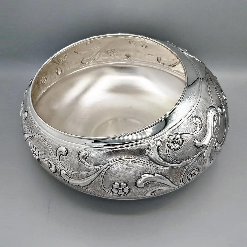 Sterling silver centerpiece made entirely by hand with scrolls and flowers"Off-center" sterling silver centerpiece.The upper part of the body features embossed and chiseled designs depicting flowers and scrolls.A knurling, a small, dense hammering, was applied between the chisels to highlight the decorations.The lower part of the centerpiece's body has been left smooth.The distinctive feature of this centerpiece is that the "mouth" has been deliberately off-center and its height decreases.These details make it unique and highlight the workmanship, which is entirely handmade in Milan, Italy, in the artisanal workshop of Argenteria di Monti Osvaldo, designed by ARVAL ARGENTI VALENZA