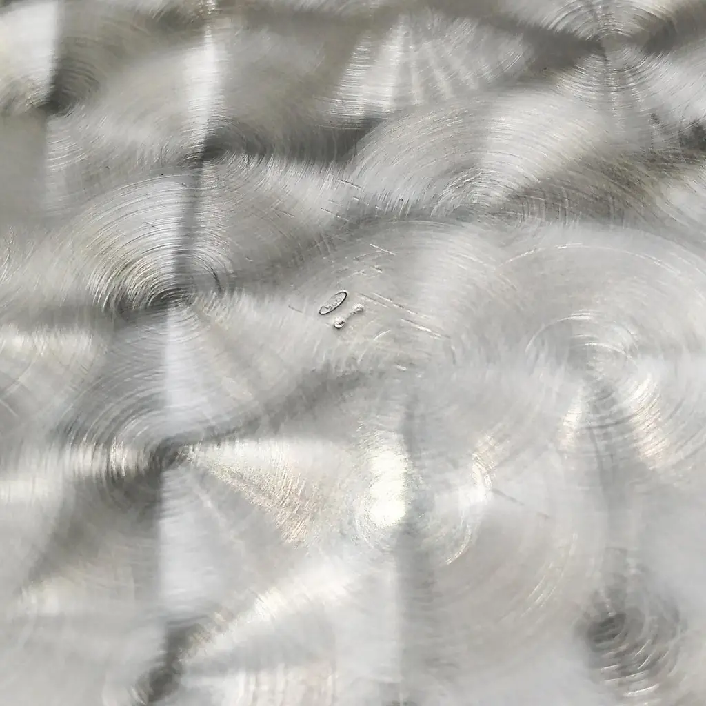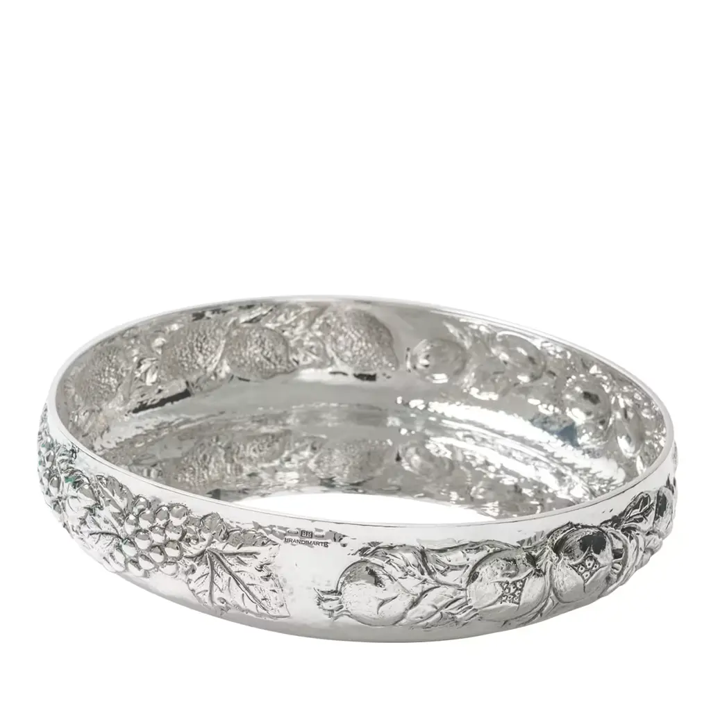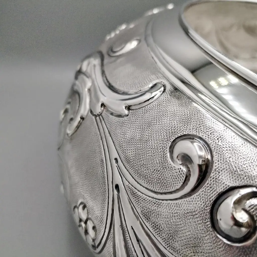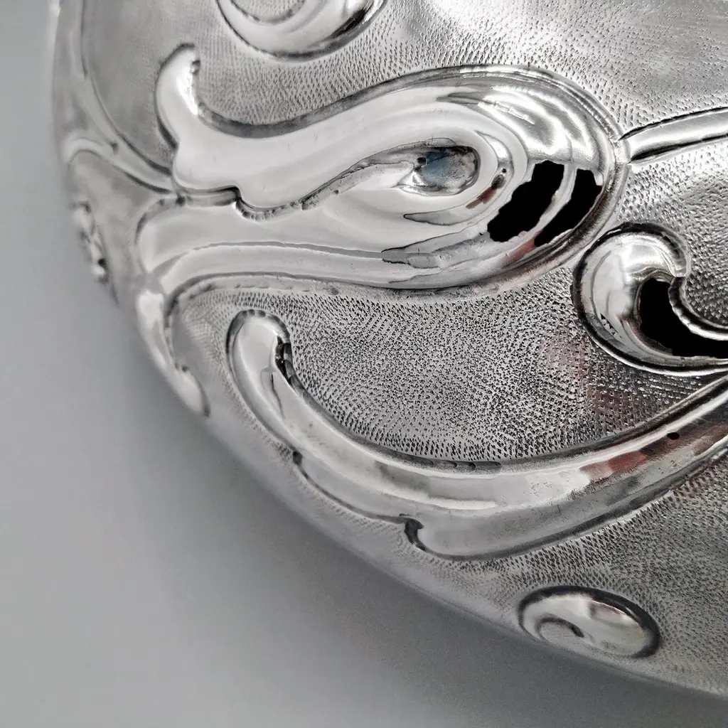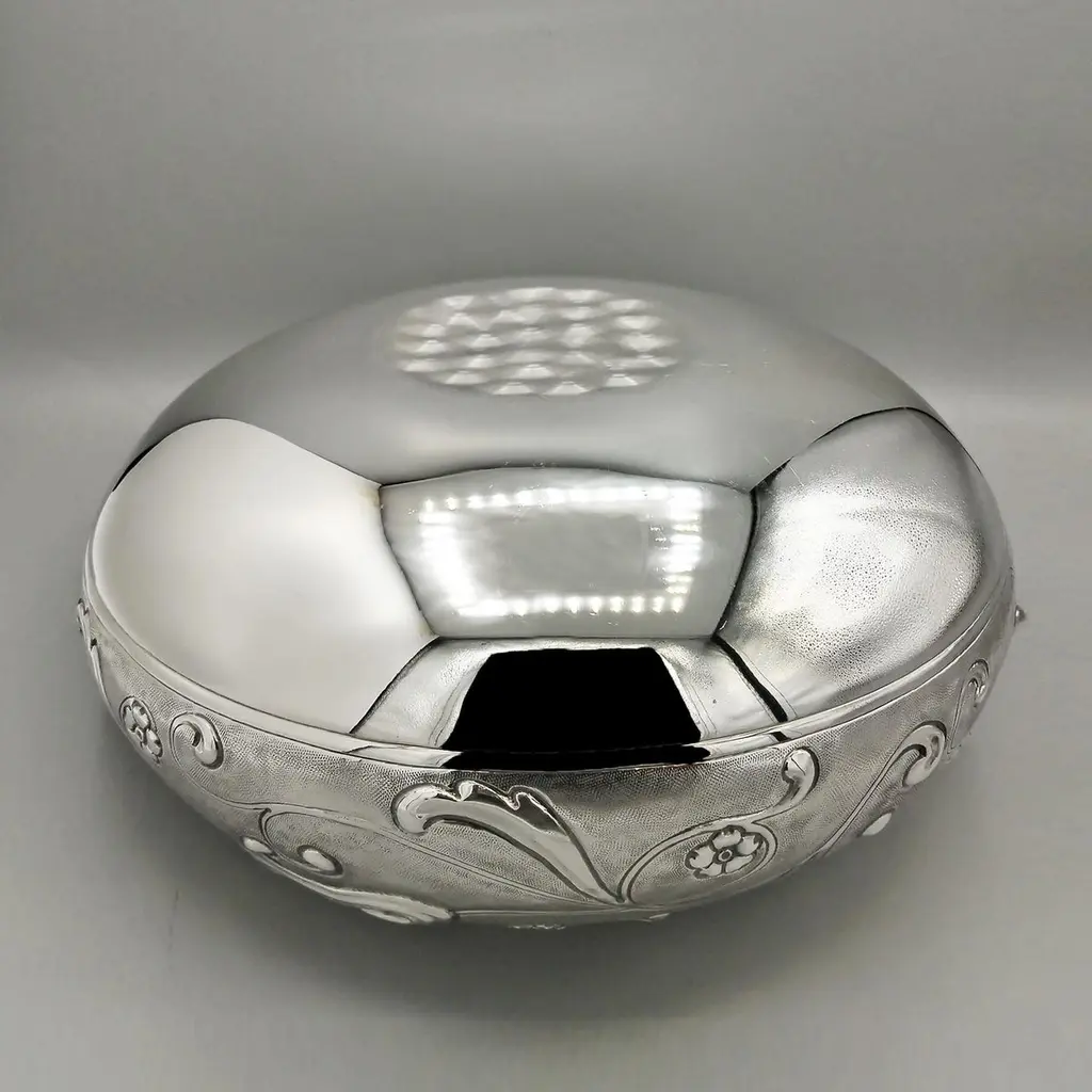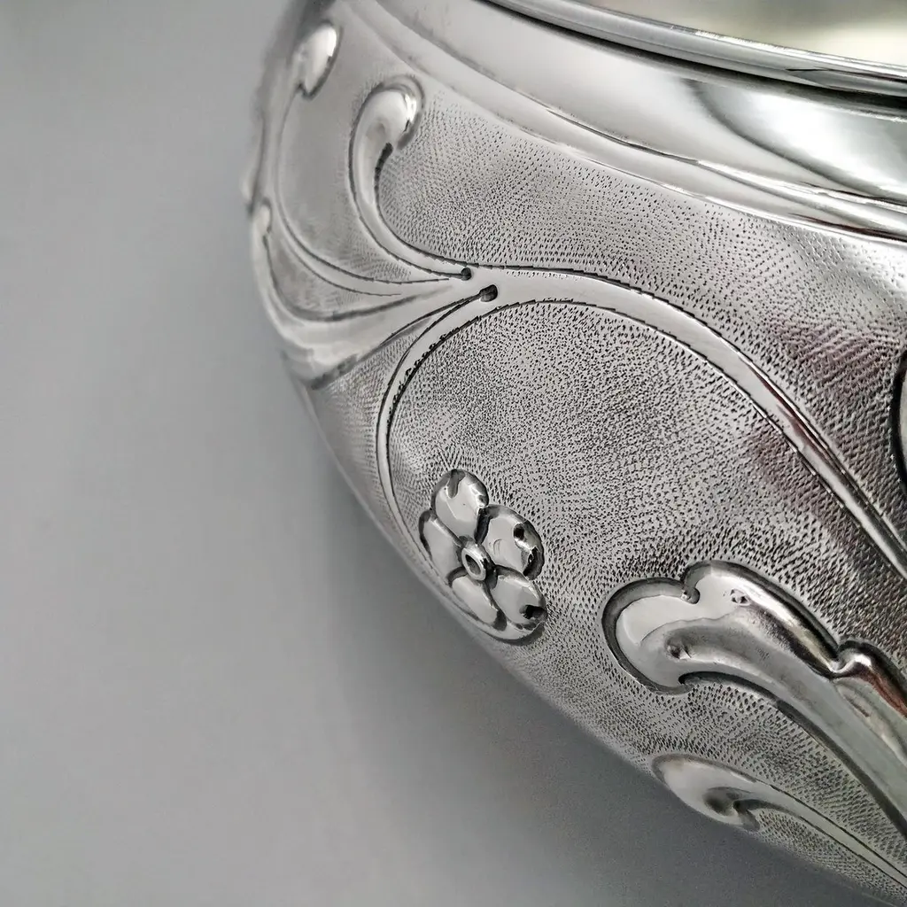 Sterling silver centerpiece made entirely by hand with scrolls and flowers"Off-center" sterling silver centerpiece.The upper part of the body features embossed and chiseled designs depicting flowers and scrolls.A knurling, a small, dense hammering, was applied between the chisels to highlight the decorations.The lower part of the centerpiece's body has been left smooth.The distinctive feature of this centerpiece is that the "mouth" has been deliberately off-center and its height decreases.These details make it unique and highlight the workmanship, which is entirely handmade in Milan, Italy, in the artisanal workshop of Argenteria di Monti Osvaldo, designed by ARVAL ARGENTI VALENZA