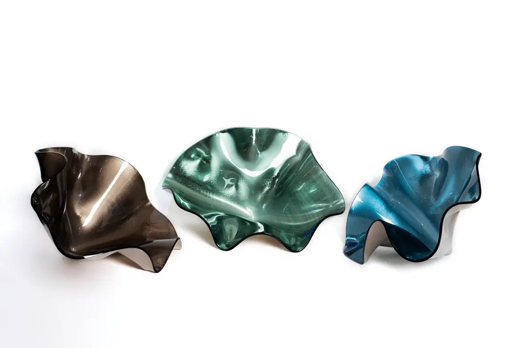 Small Lilyz created by Orfeo Quagliata from our new collection IZDATGLAZ. These shimmering glass gems create a simple modern touch for any space. Whether it’s gold, silver or one of the velour like colors they create a simple but bold statement. We have invented this new technique that involves a unique system to create the metallic, velour like feeling in the objects. It is a very artisanal process where each piece is one of a kind; handcut, polished and thermoformed. There will always be some slight love marks or details that ocurre during the creation of each piece.Dimensions and shape may vary.The colors are customizable.