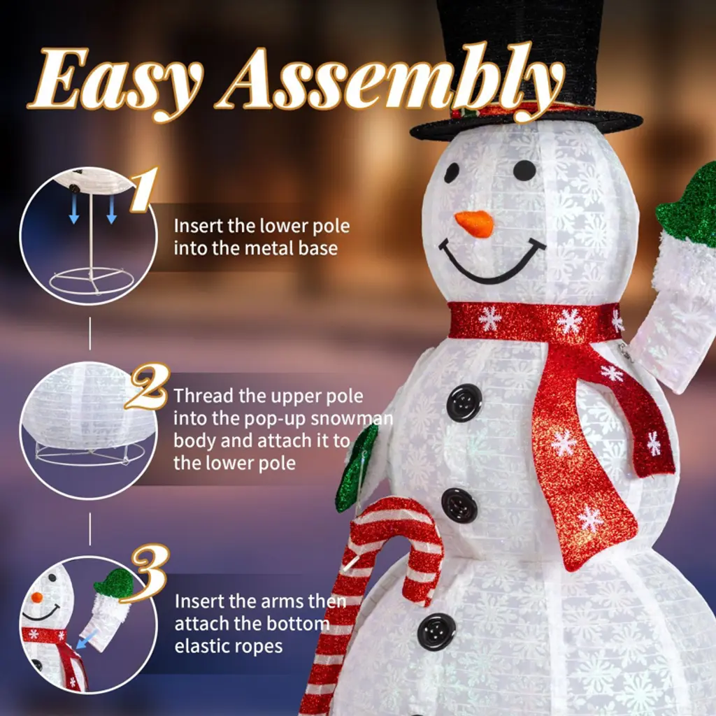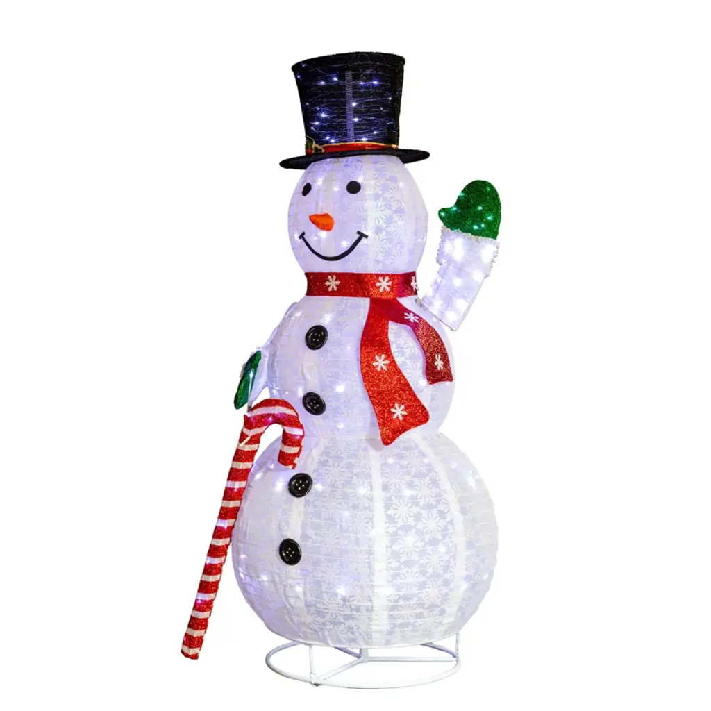 Make a grand statement this holiday season with our spectacular 5.7ft Light-Up Snowman! This majestic figure features a charming design, holding a classic candy cane and crafted from glittering snowflake-dusted fabric that sparkles beautifully by day.As night falls, transforms into a brilliant beacon of holiday cheer, illuminated by a dazzling 210 cool white LED string lights. The bright, clearglow ensures your display stands out, creating a mesmerizing winter wonderland in your front yard or living room.Engineered for ultimate convenience, this snowman features an innovative expandable frame that effortlessly telescopes to its full, impressive height with no tools required. After the festivities, it easily collapses down and folds flat for remarkably compact storage. Designed for stability both indoors and outdoors, this is the perfect centerpiece decoration for those who love a spectacular, yet hassle-free, holiday display.