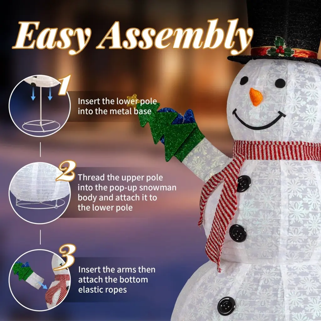 Light up your holidays with this magnificent 5.7ft Light-Up Snowman, featuring an adorable design holding a tiny Christmas tree! Crafted from sparkling snowflake glitter fabric, this snowman shimmers beautifully by day and transforms into a dazzling centerpiece by night, illuminated by 200 warm white LED string lights that radiate a cozy and inviting glow.Designed for effortless usability, its innovative telescopic frame allows you to expand it to its full impressive height in seconds—no tools or complicated setup required. After the season, it easily collapses into a compact, flat form for convenient storage. Perfect for indoor or outdoor use, this sturdy yet charming decoration combines elegance and functionality, making it an unforgettable addition to your festive decor.