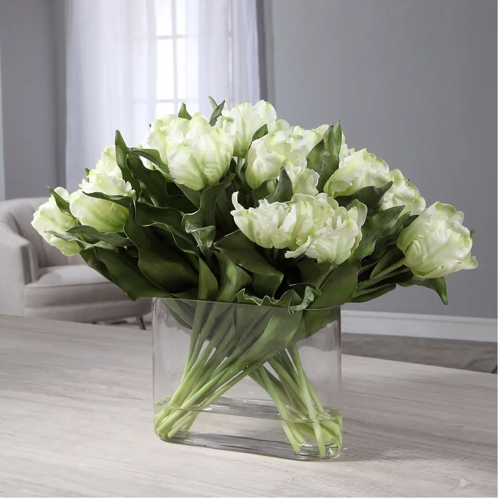 Featuring A Dramatic Spread Of White Tulips, Meticulously Placed Into An Oval Glass Vase Complete With Faux Water.