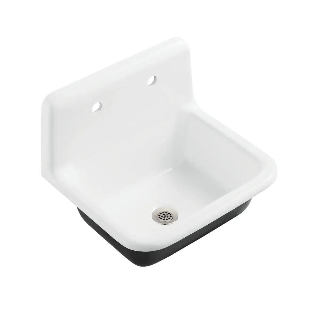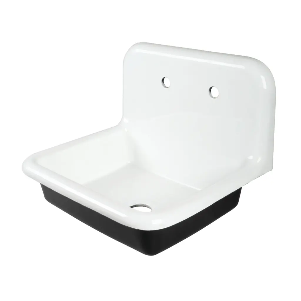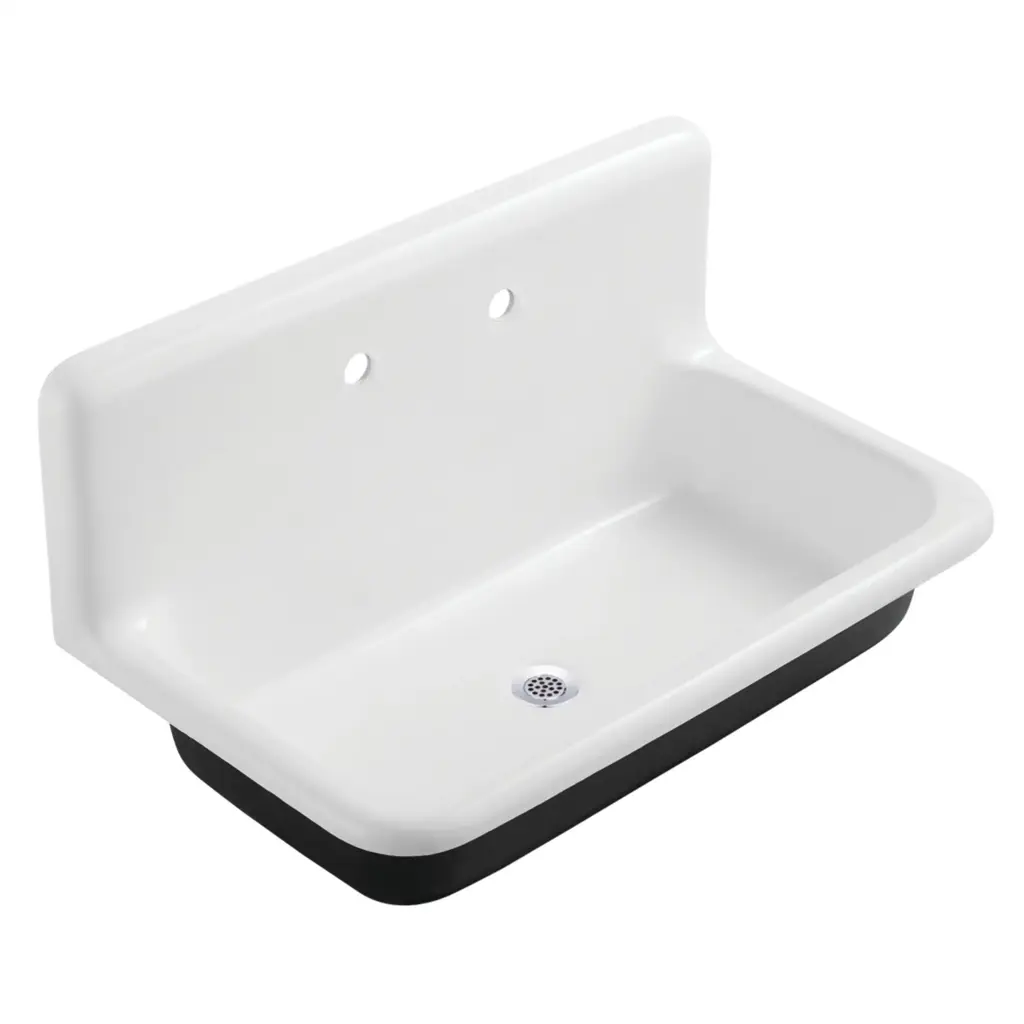 Transform your kitchen with the 36-inch wall-mounted enameled cast iron sink from the Towne Collection by Kingston. Designed to enhance your space, this sink features a stunning high-gloss enamel finish that effortlessly becomes the centerpiece of your kitchen. Crafted from durable cast iron, it offers a solid, reliable feel that inspires confidence for every kitchen task. The included backsplash comes pre-drilled with 2 holes, spaced 8" center-to-center, for seamless faucet installation.FeaturesFabricated from high gloss enameled cast iron for long lasting performanceEasy self rimming installation8" two-hole wall mount faucet holesOverall size: (L)36" x (W)20-3/16" x (H)18-5/16"Bowl dimensions: (L)32-1/16" x (W)16-1/4" x (D)6-3/4"Minimum cabinet dimensions: 39"Fits standard kitchen drain basketDrain not includedIncludes integral backsplashBacksplash height: 11"Faucet hole center to sink top rim: 4-7/16"Includes mounting hardware and installation template