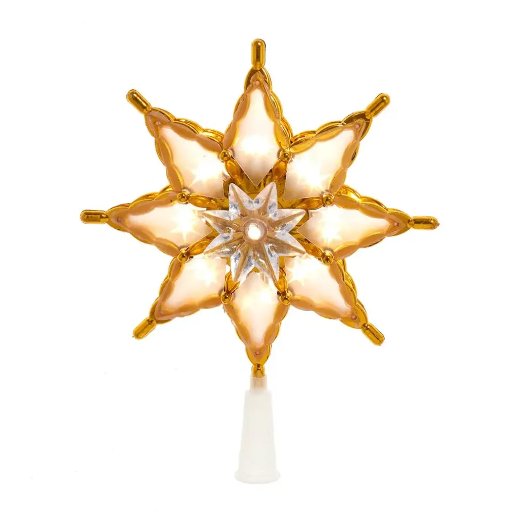 Illuminate your Christmas tree with a touch of elegance and enchantment using this 10" 18-Light LED Multifunction 8-Point Star Treetop from Kurt Adler. It is a stunning and versatile addition that crowns your tree with a radiant glow. This treetop features a beautifully designed gold eight-point star, measuring 10 inches in diameter. It is adorned with 18 LED lights that emit a warm and inviting light. These LED lights are energy-efficient and durable, ensuring a brilliant and long-lasting shine throughout the holiday season. What sets this treetop apart is its multifunctionality. It offers a variety of lighting options and effects, including waves, slow-glow and steady on. This treetop is perfect for those who want to add a touch of sophistication and modernity to their holiday decor. It embodies the spirit of celebration and brings a sense of wonder and enchantment to your tree, making it the ideal choice for both traditional and contemporary holiday themes. As you place this treetop on your Christmas tree, it becomes the crowning jewel of your holiday decorations, radiating warmth and festive cheer throughout your home. This treetop invite you to celebrate the magic and splendor of Christmas with a touch of modern elegance. Its stunning design and multifunctional lighting make it a centerpiece of your holiday traditions.