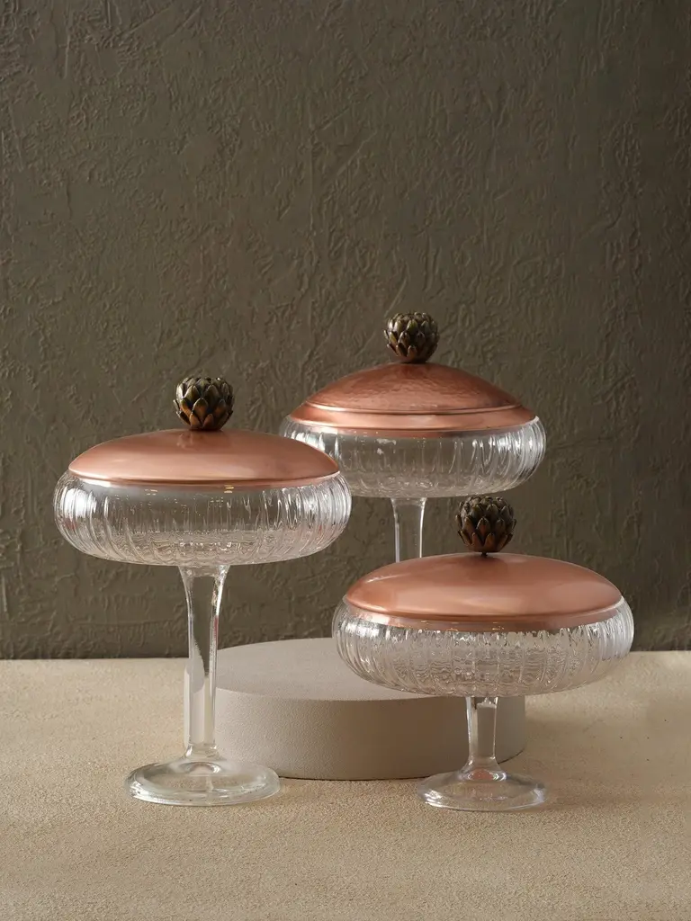 Elegant and whimsical, the Large Footed Glass Serving Stand with Copper Lid & Artichoke Handle brings timeless charm to your tabletop. Crafted from clear, ribbed glass with a high pedestal base, this piece is topped with a warm copper-toned lid, crowned by a sculptural artichoke-shaped handle. Designed to elevate your dessert presentations or special gatherings, it blends vintage inspiration with a playful yet refined twist. A stunning centerpiece for entertaining or everyday display.