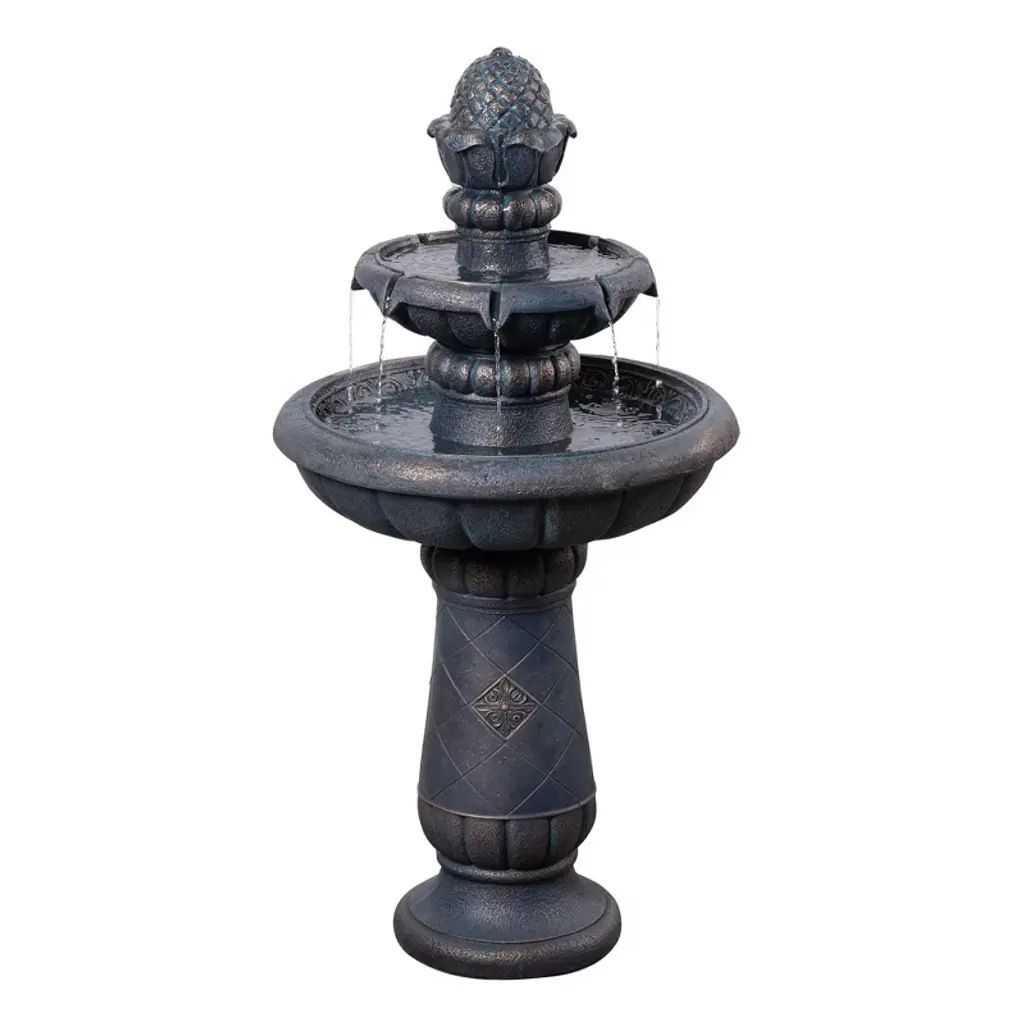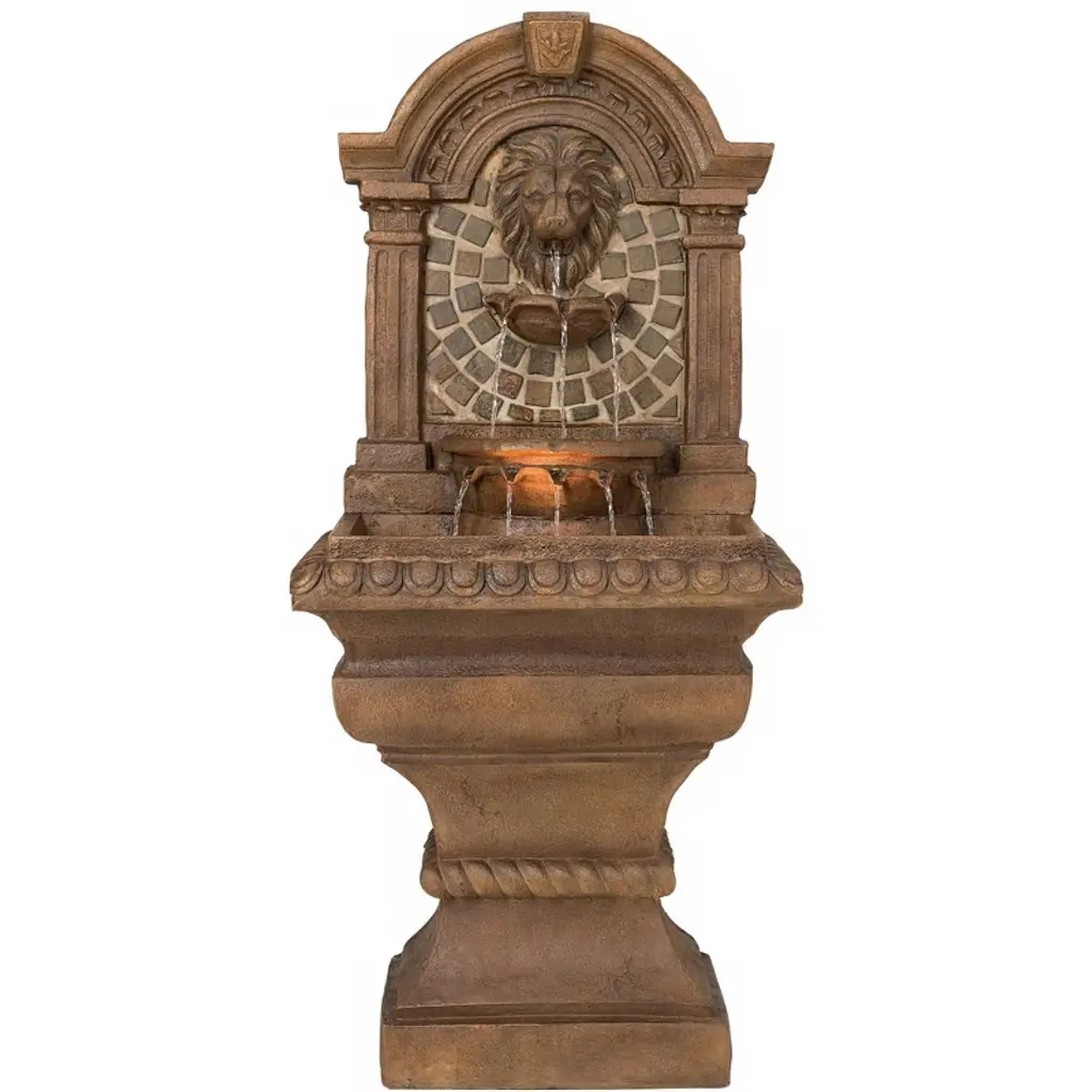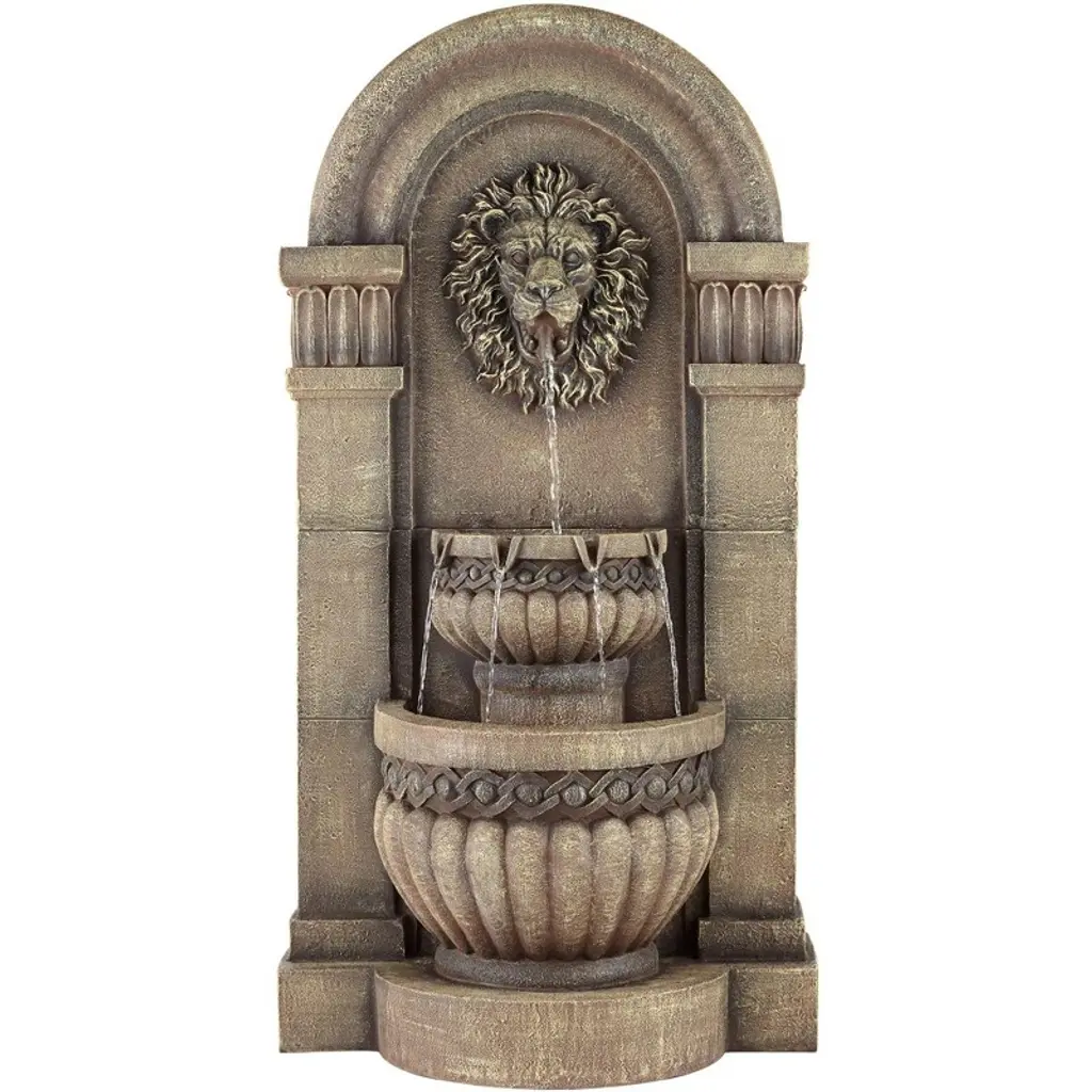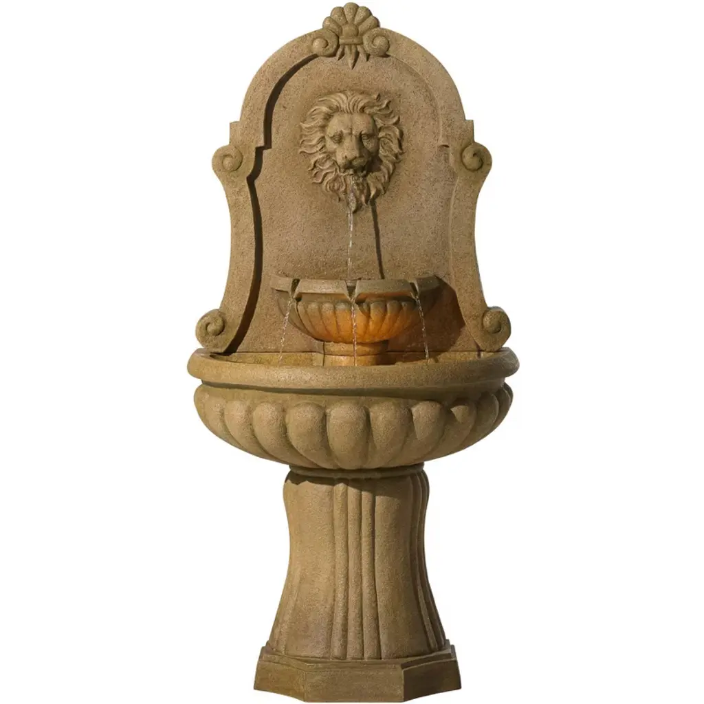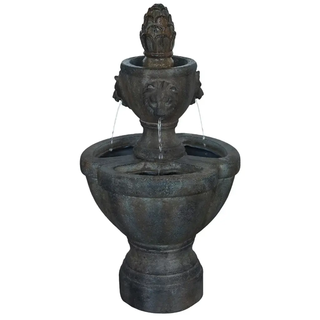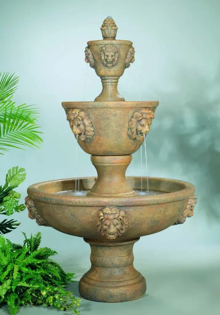 • Please Note: Our color chart is for example purposes only. Monitor settings and how the finish is applied to these outdoor water fountains can vary to what is shown in the color chart. Actual stone samples of each finish can be purchased to help you make your finish choice.The Large Three Tier Leonesco Fountain is a centerpiece of serenity and beauty of nature for your garden or outdoor space. This fountain brings tranquility through its flowing sounds and a feeling of being one with nature.The fountain is made from premium cast stone designed with urn-like bowls and basin adorned by Lion heads spouting water below them. Each fountain is individually handcrafted by the best artisans in the industry to last for generations of outdoor use. Skilled artisans using Old World techniques finish the fountain in your choice of an unparalleled selection of beautiful colors.Large Three Tier Leonesco Fountain features:Made in USA Made of cast stone to last a lifetimeIncludes one fountain pump Dimensions: 80" H x 48" D x 48" WWeight: 987 lbs.Available in 21 finishesfountain Shown in Golden MossMultiple Colors Available• The finish/stain is hand applied and can vary from what is shown in the color sample.• • Each fountain is made to order and requires about 3-4 weeks for production and delivery.