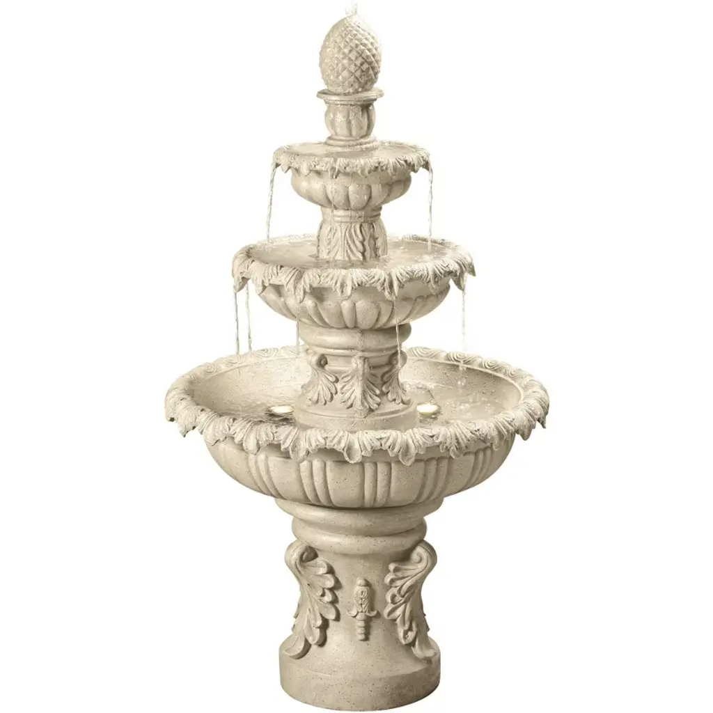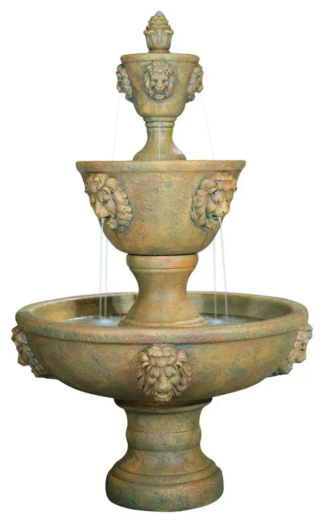 • Please Note: Our color chart is for example purposes only. Monitor settings and how the finish is applied to these outdoor water fountains can vary to what is shown in the color chart. Actual stone samples of each finish can be purchased to help you make your finish choice.The Large Three Tier Leonesco Fountain is a centerpiece of serenity and beauty of nature for your garden or outdoor space. This fountain brings tranquility through its flowing sounds and a feeling of being one with nature.The fountain is made from premium cast stone designed with urn-like bowls and basin adorned by Lion heads spouting water below them. Each fountain is individually handcrafted by the best artisans in the industry to last for generations of outdoor use. Skilled artisans using Old World techniques finish the fountain in your choice of an unparalleled selection of beautiful colors.Large Three Tier Leonesco Fountain features:Made in USA Made of cast stone to last a lifetimeIncludes one fountain pump Dimensions: 80" H x 48" D x 48" WWeight: 987 lbs.Available in 21 finishesfountain Shown in Golden MossMultiple Colors Available• The finish/stain is hand applied and can vary from what is shown in the color sample.• • Each fountain is made to order and requires about 3-4 weeks for production and delivery.