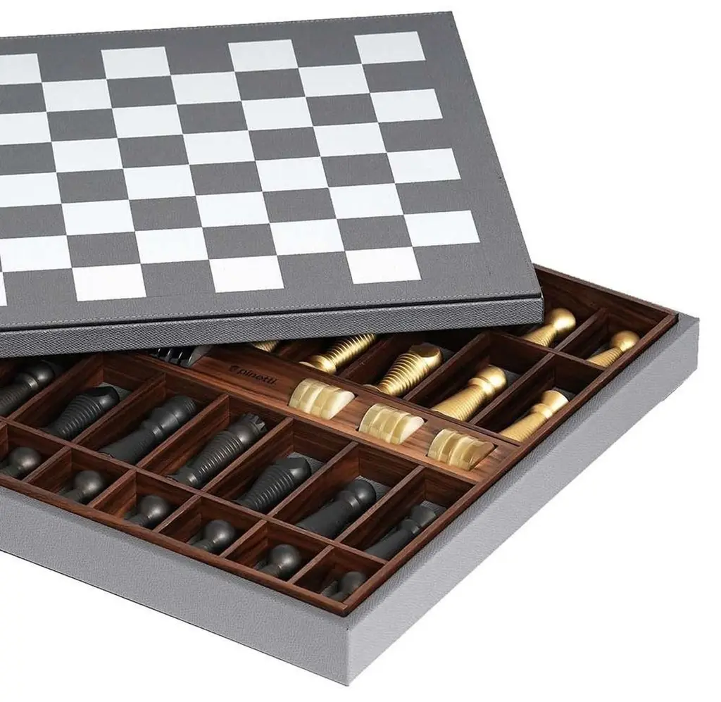This chess and checkers board game set is a stunning decorative accent piece for both classical and modern interior decors. This piece is entirely crafted of walnut upholstered in gray leather, the top completed with white squares for the chessboard. The board doubles as storage, which opens to reveal a tray for the black- and brass-finished chess and checkers pieces. The interior tray is in exposed wood and is framed with a gray leather band. Used as a bold centerpiece or as entertainment on game night, this set is the perfect gift for a board game enthusiast or collector.