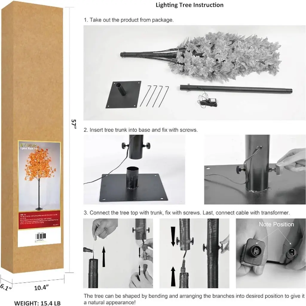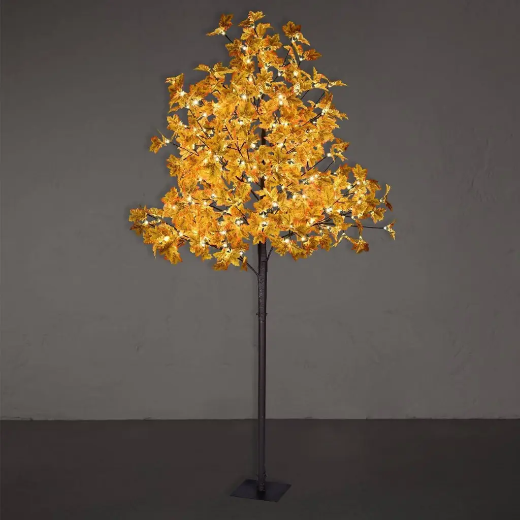 Elevate your seasonal decor with this breathtaking 8FT lighted maple tree, adorned with 264 warm white LED lights that accentuate its realistic maple leaves and natural brown trunk. Engineered with our patent-pending Consolidus base for unmatched stability (far superior to standard cross stands), this majestic tree creates a stunning focal point for any space. Simply plug in the included UL-listed power supply to instantly transform your environment. Ideal for both indoor and outdoor use, this versatile centerpiece shines for autumn festivals, holiday parties, Christmas displays, and weddings. The knock-down design ensures easy storage, while included linen/gunny bag accents add rustic charm. Whether creating a cozy autumn atmosphere or festive holiday magic, this statement tree delivers unforgettable ambiance season after season.