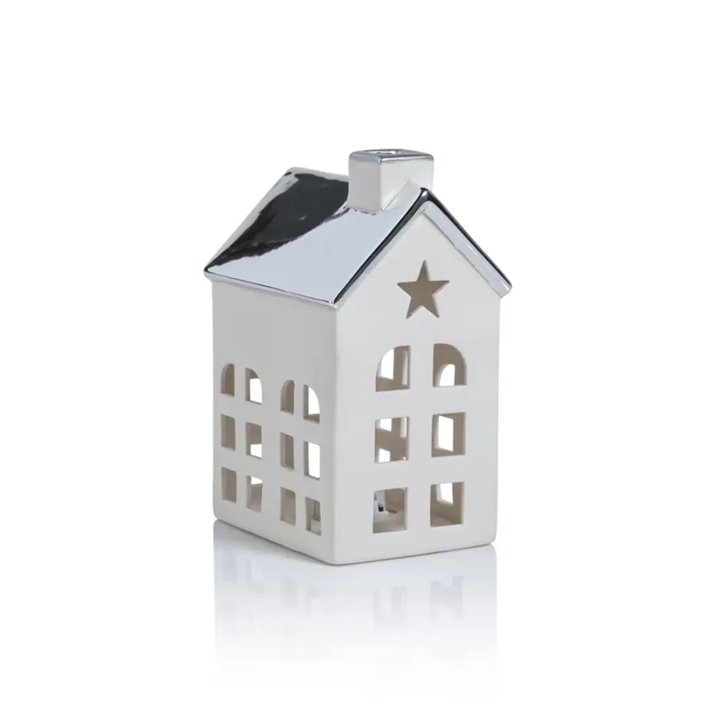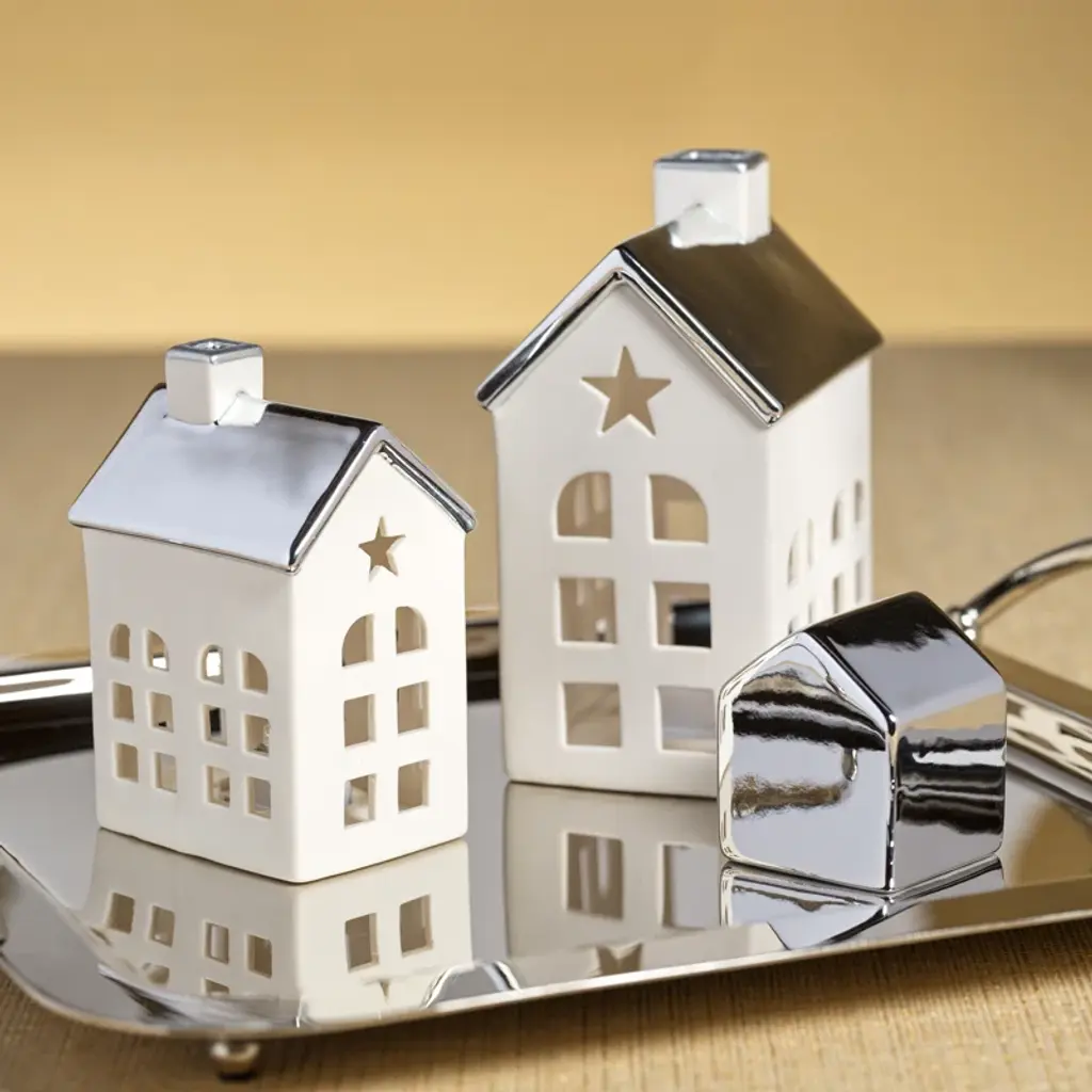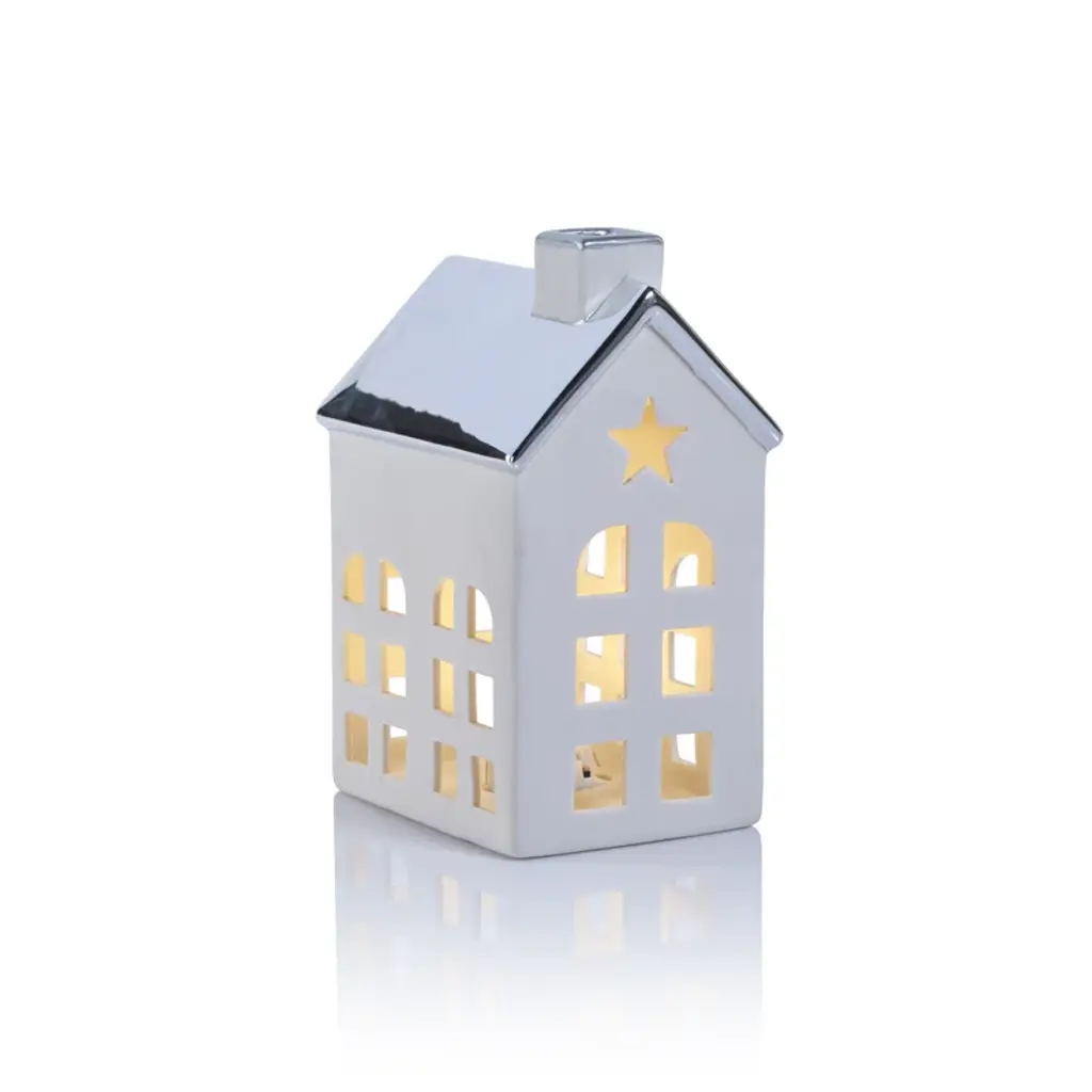Illuminate your holiday decor with the Lilou Porcelain LED Houses. Crafted from white glazed porcelain, this charming piece features an intricate openwork design, allowing light to gently shine through. The metallic-colored roof adds a festive touch, enhancing the house’s elegant appeal. Perfect for creating a warm, cozy ambiance, the Lilou LED House makes a delightful addition to your seasonal decorations and a lovely centerpiece for any festive display.
