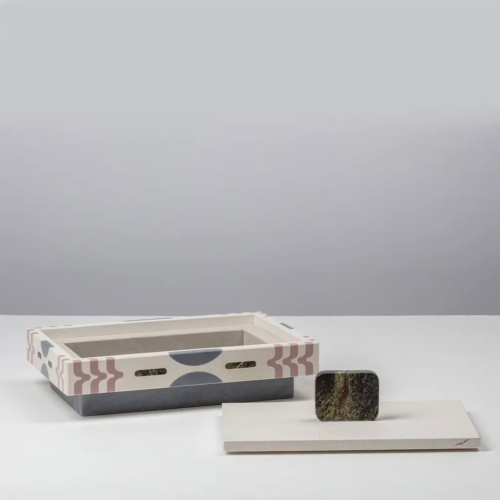 Limarsi is an exquisite centerpiece meticulously crafted from multicolored marble using the intricate inlay technique. Comprising a harmonious blend of Bianco Fenice, Bardiglio Imperiale, Pietra Pece, Rosalia, and Green Forrest, its vibrant hues and intricate patterns showcase the artistry and sophistication inherent in its design.
