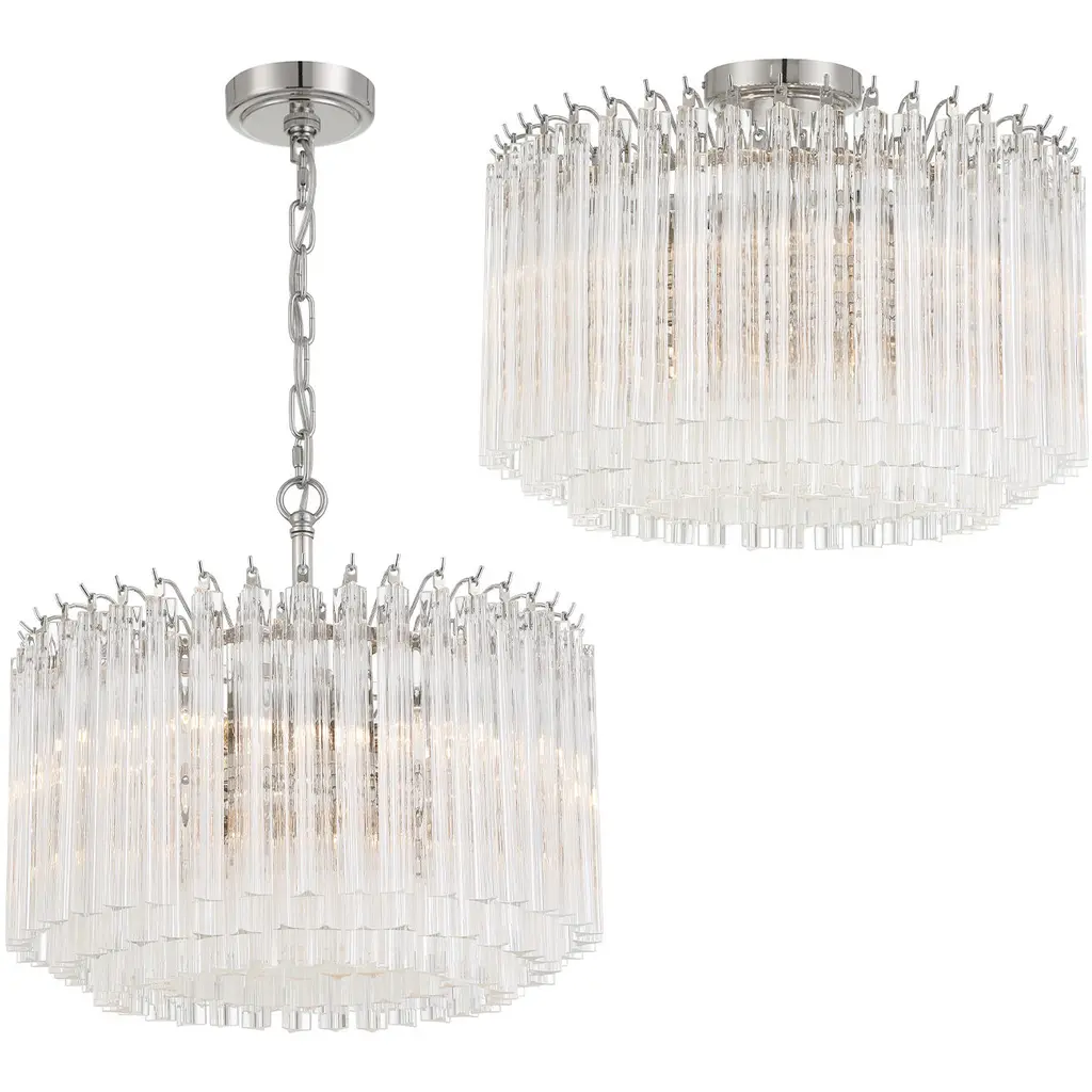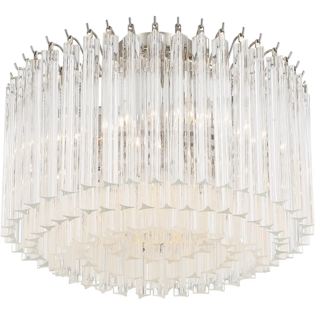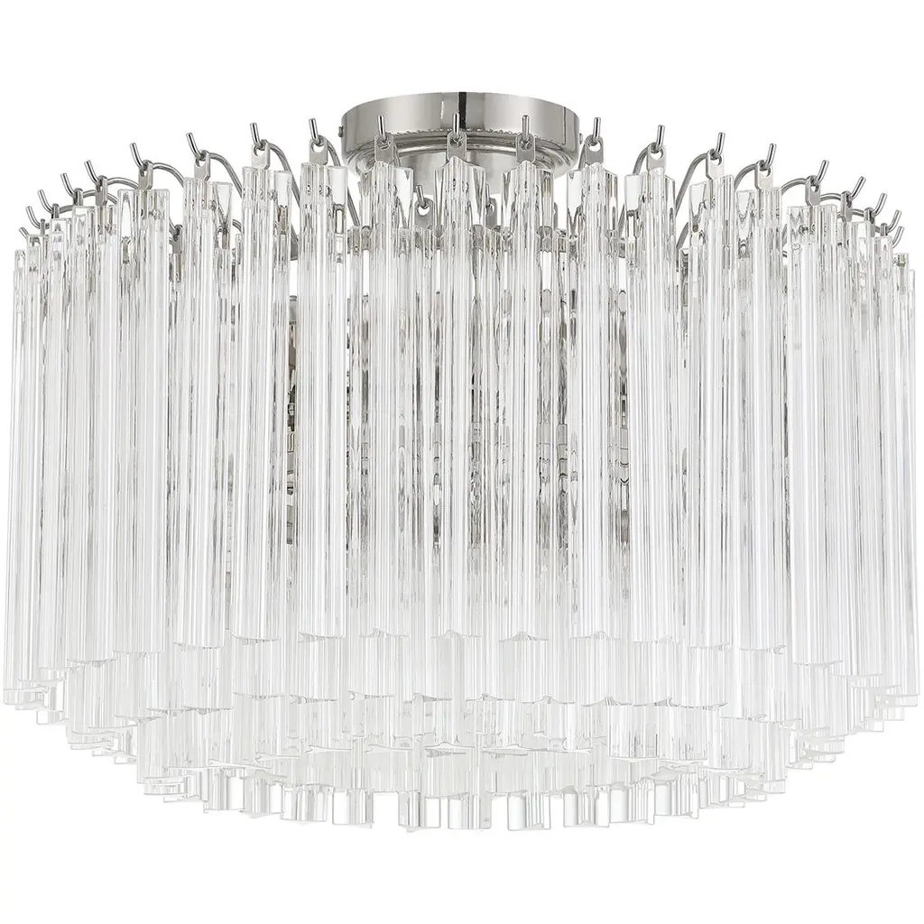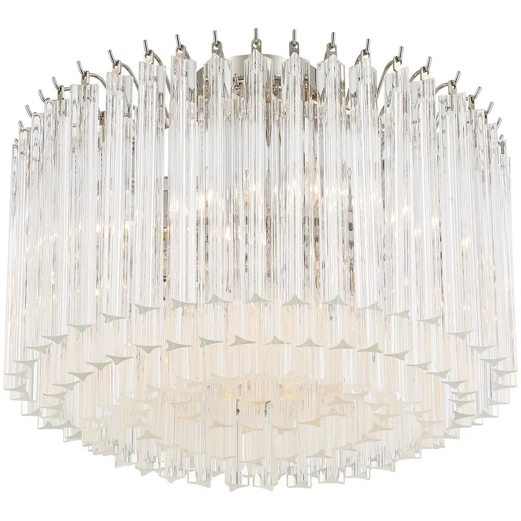 The Lofton Collection showcases mid-century sophistication with its stepped, tiered design and distinctive Triedri glass rods. Created using a technique that involves making triangular cuts on the glass, the Triedri method results in a faceted, crystal-like appearance that enhances sparkle and depth. The glass gracefully cascades downward and inward, framed in polished nickel or aged brass. This dynamic design ensures that the Lofton Collection remains a luxurious and visually striking centerpiece, with its facets reflecting light in captivating ways from any angle.
