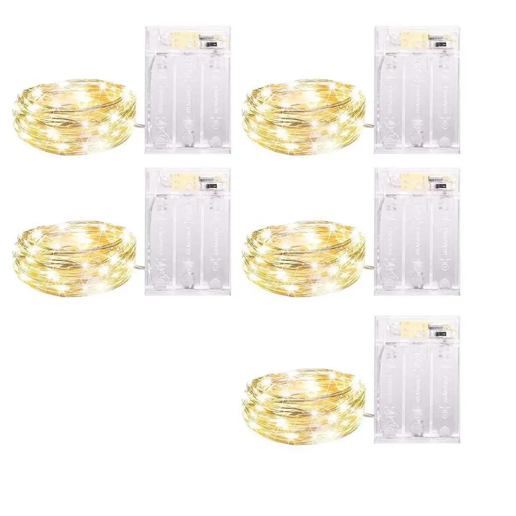 Battery-operated LED fairy string lights from LumaBase will bring a spectacular ambience to a special event, party, or celebration. Create a stunning display with this set of two bendable wire cords with glowing mini LED lights. The micro lights look like a glimmering droplet of water clinging to a shiny silver wire. These weatherproof lights are perfect for illuminating a vase, floral arrangement, centerpiece, mantel, or table setting. Each string light requires 2 CR2450 batteries (included and replaceable).