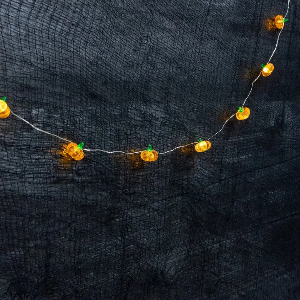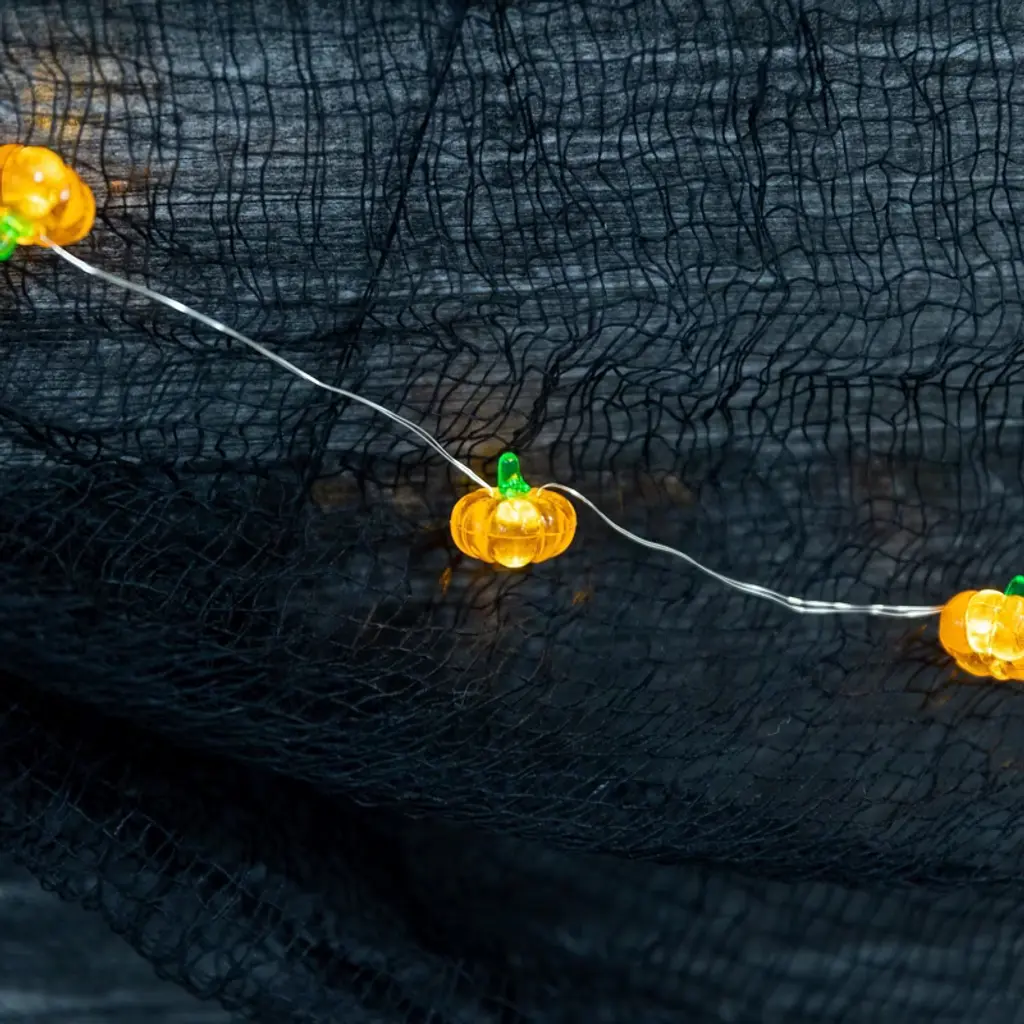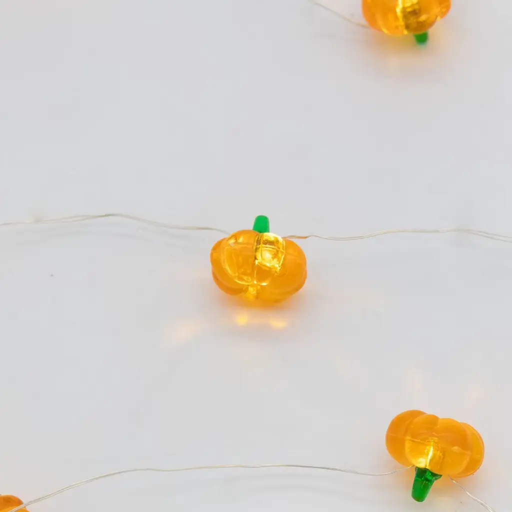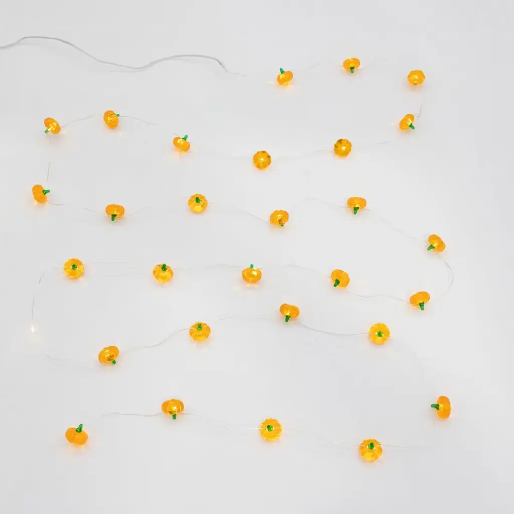 Decorate your home for Halloween with battery-operated mini pumpkin string lights. These festive string lights have 30 steady, warm white LED lights encased by translucent orange pumpkins on an ultra-thin, bendable silver wire. With the convenience of battery power, these pumpkin string lights will add a festive flare indoors or out to vases, wreaths, centerpieces, mantels, table settings, or Halloween costumes. The string light features a timer for 6 hours on and 18 hours off. String light requires 2 AA batteries (not included).