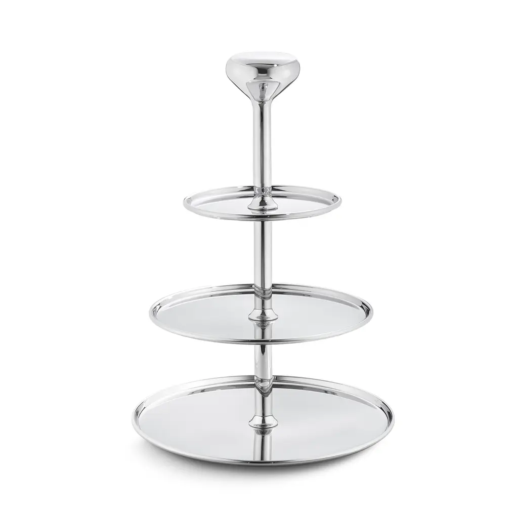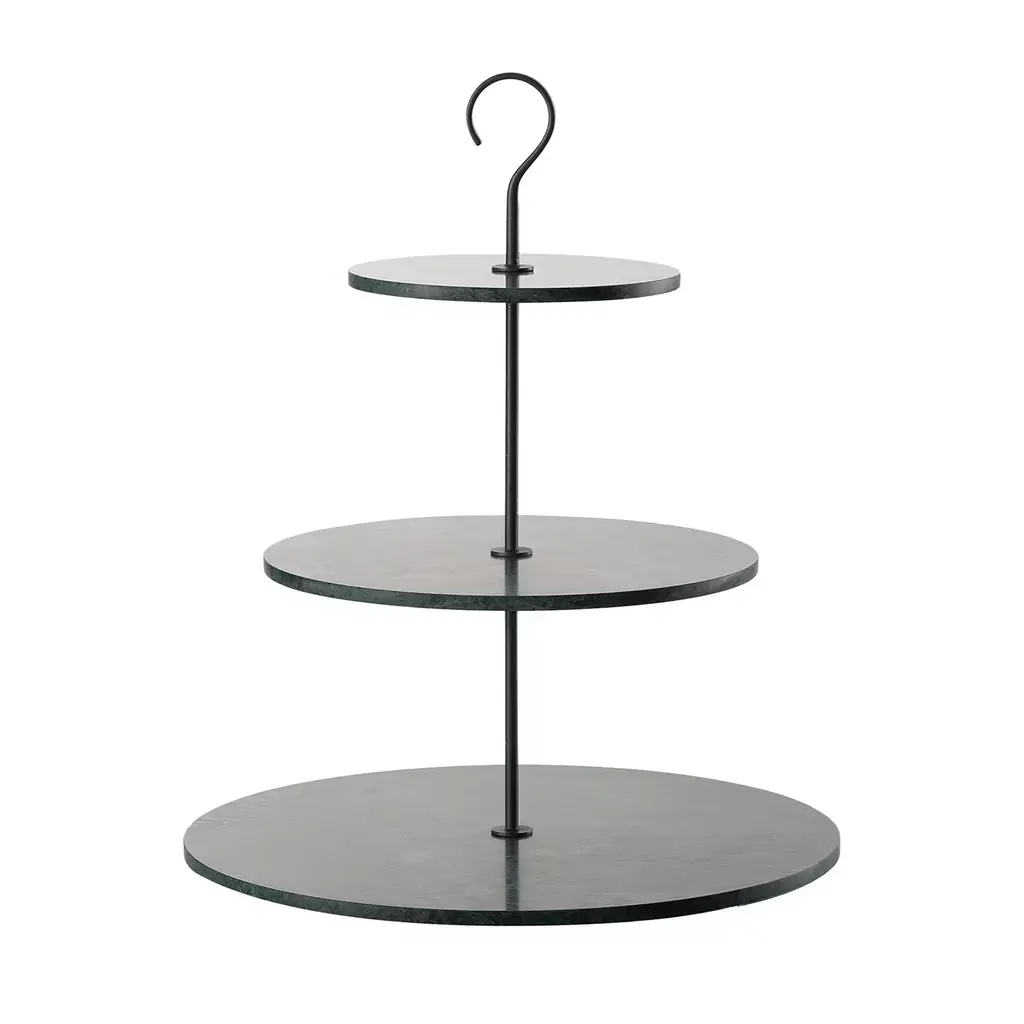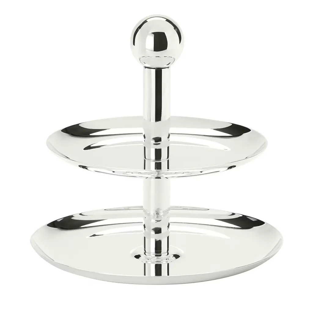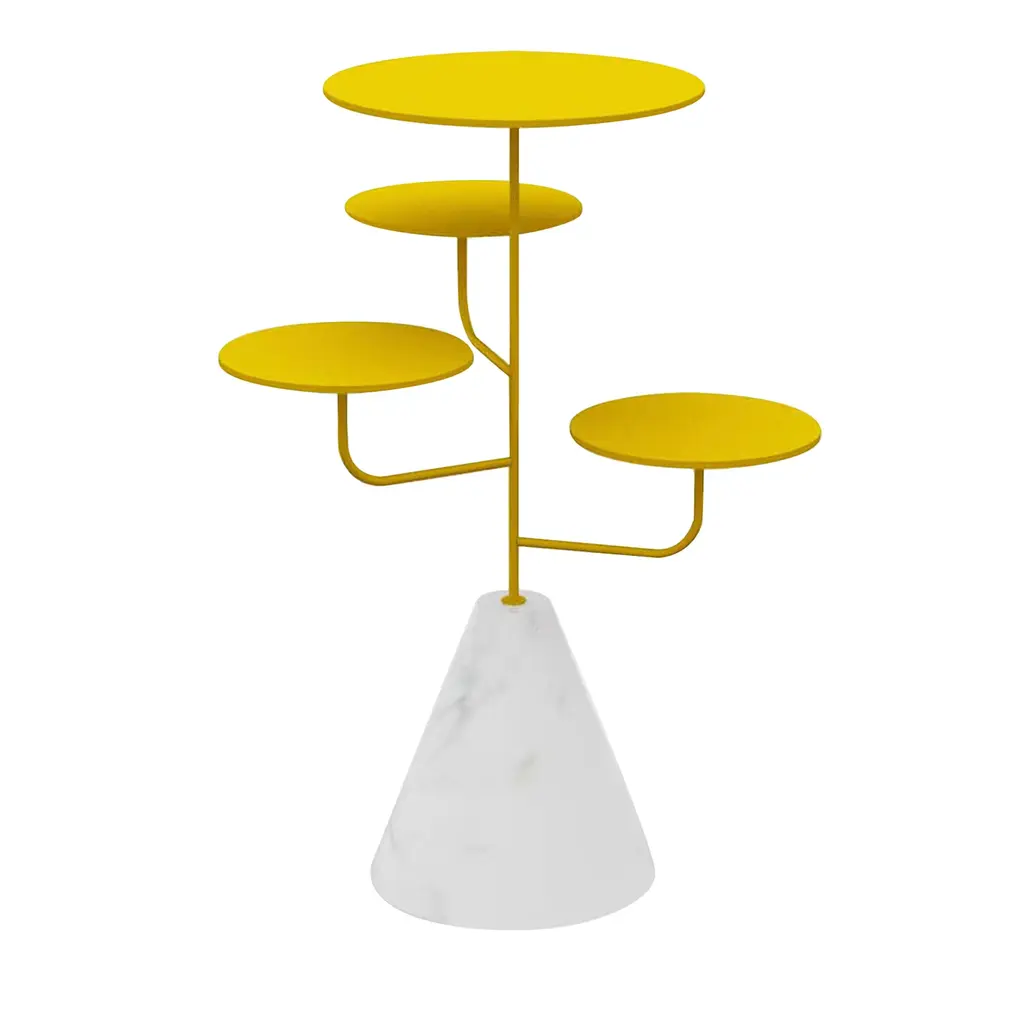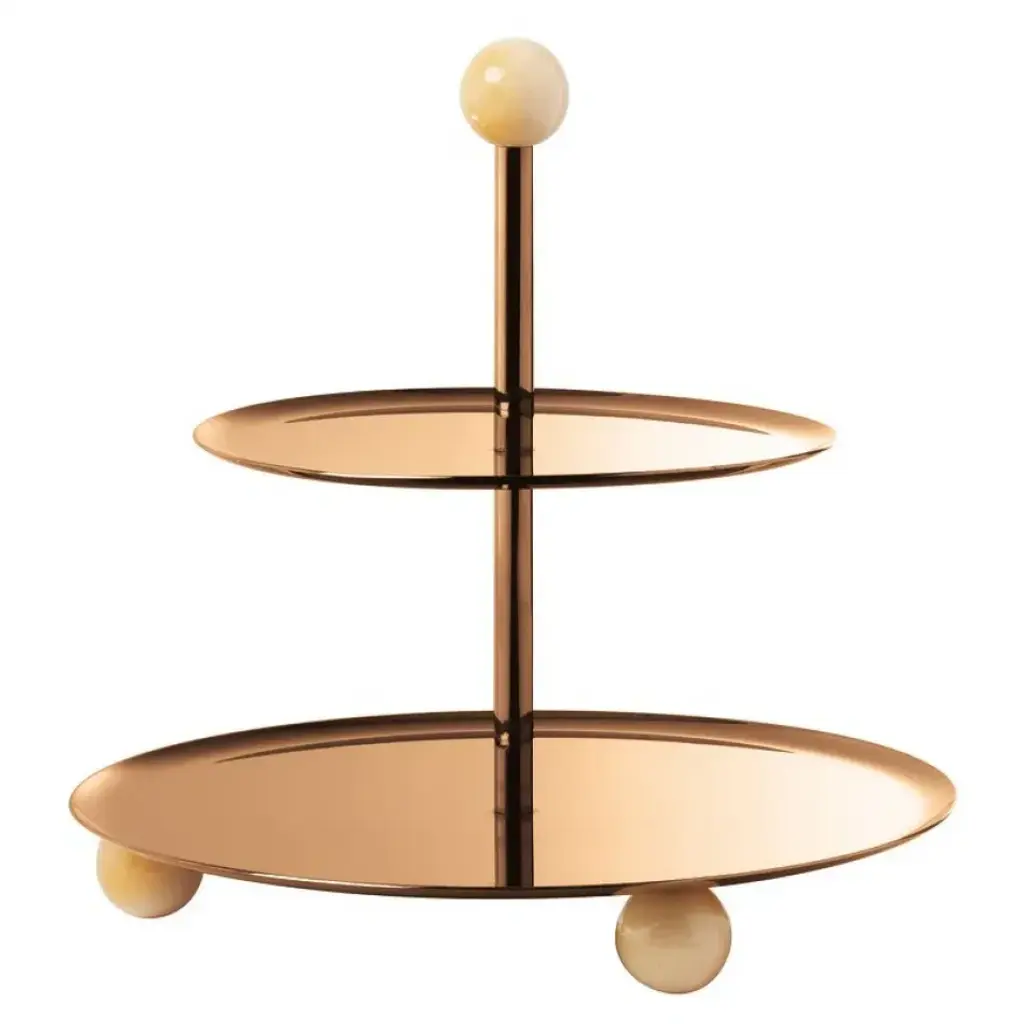 A stunning piece of functional decor, this elegant stand will be a versatile addition to a modern home, as layered centerpiece that will display finger food, fruit or pastries. Designed by Elisa Orsino and part of the Lunar Landscape, this piece is a modernist object that will enliven any occasion with its geometric rigor and the high quality of its noble materials. The two bottom disks are of grey Versilia marble, stacked one on top of the other with a vertical copper element. The vividly colored metal occurs also in the top semi-spherical bowl for a pop of elegant hue.