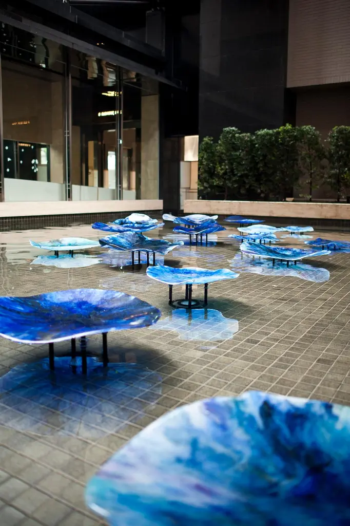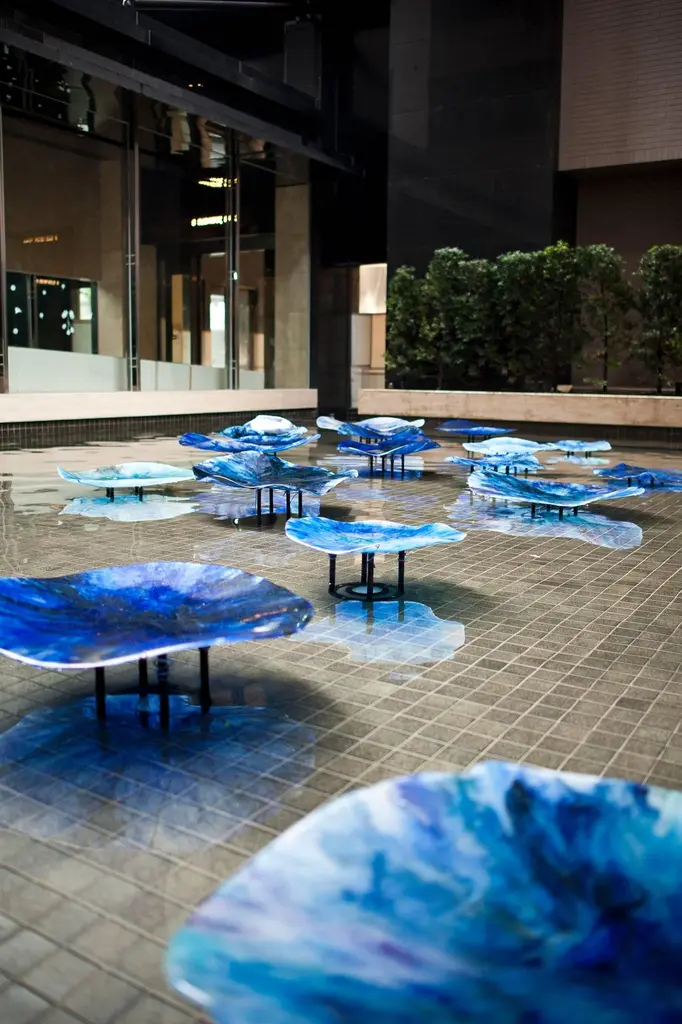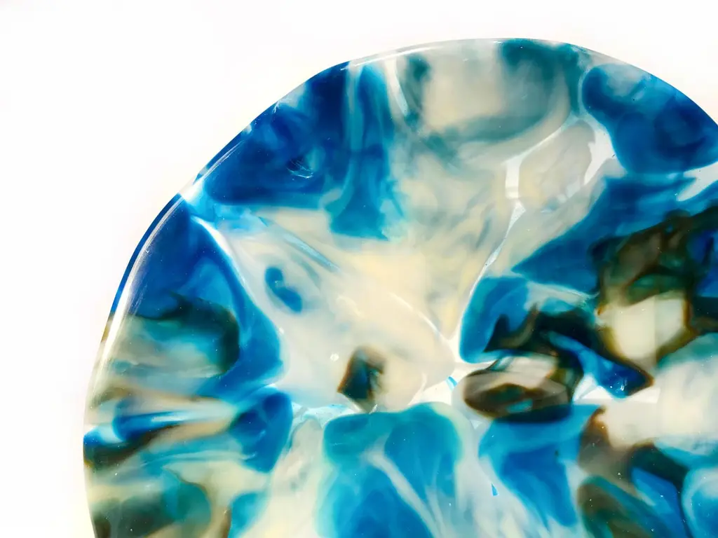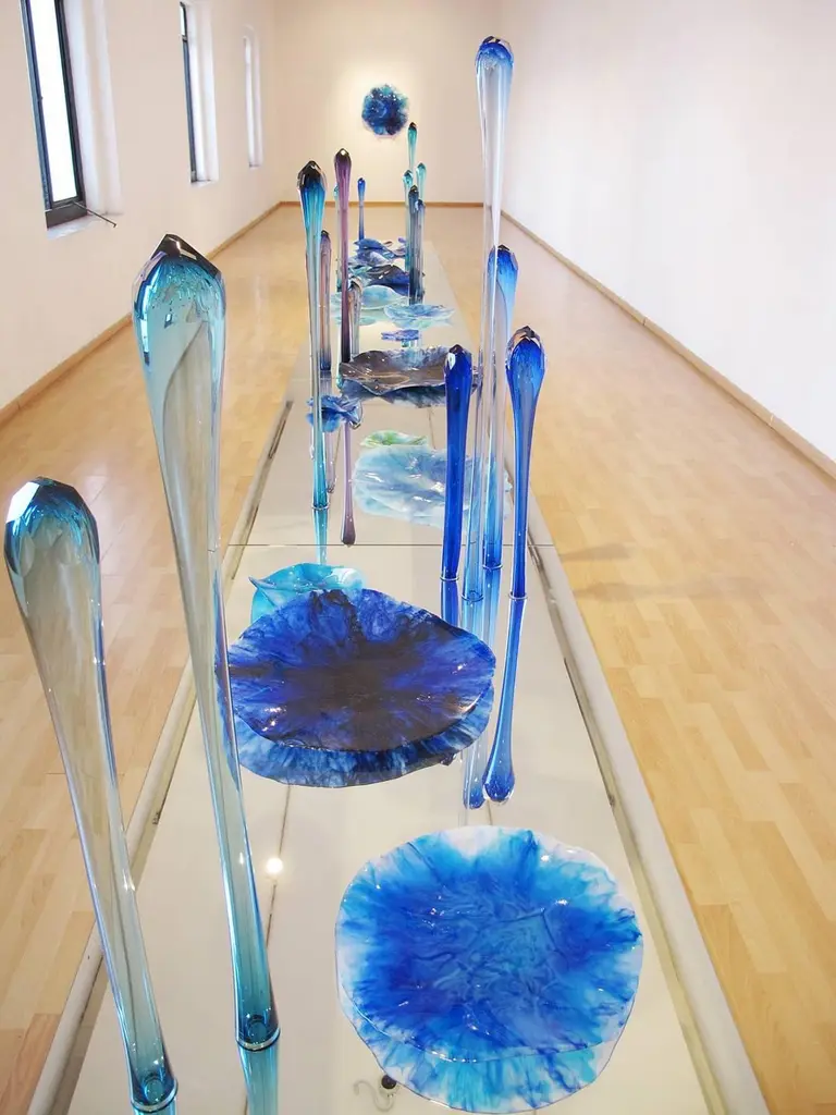 Deep blue hues all-glass organic centerpiece. Ideal to contrast with warm colors, creating a unique atmosphere in any space. Made 100% handmade in Mexico City with best quality materials and exclusive glass techniques like boiled extended and thermoformed glass that highlight the product's value. Designed by Orfeo Quagliata.