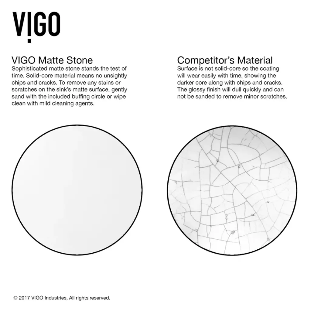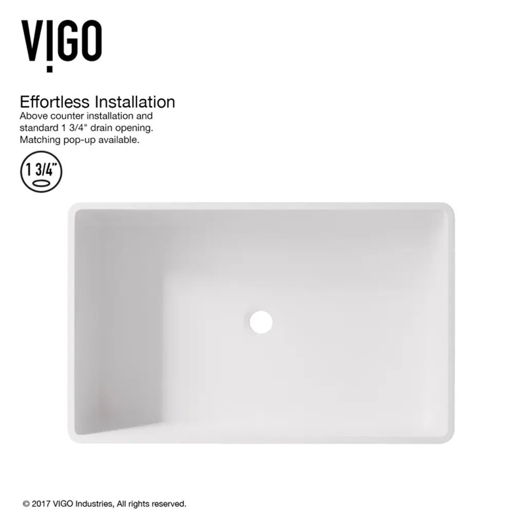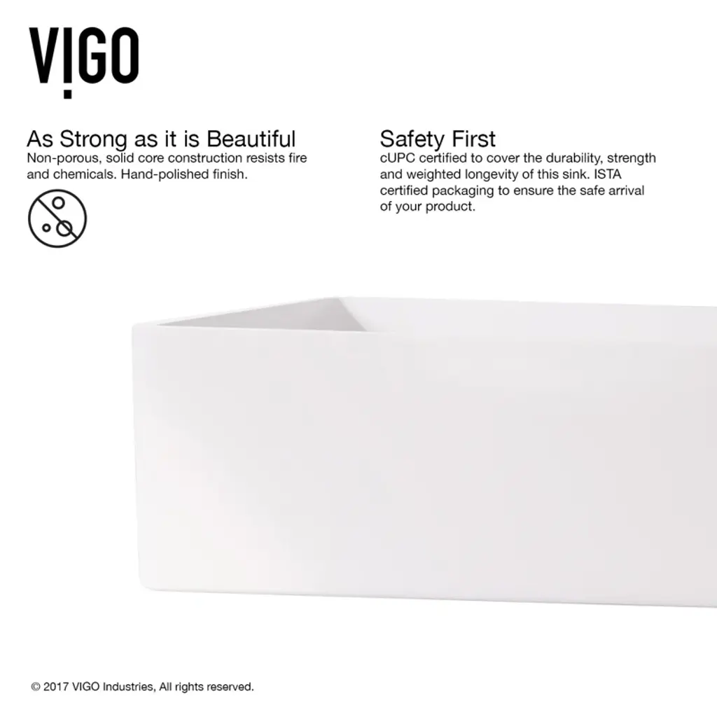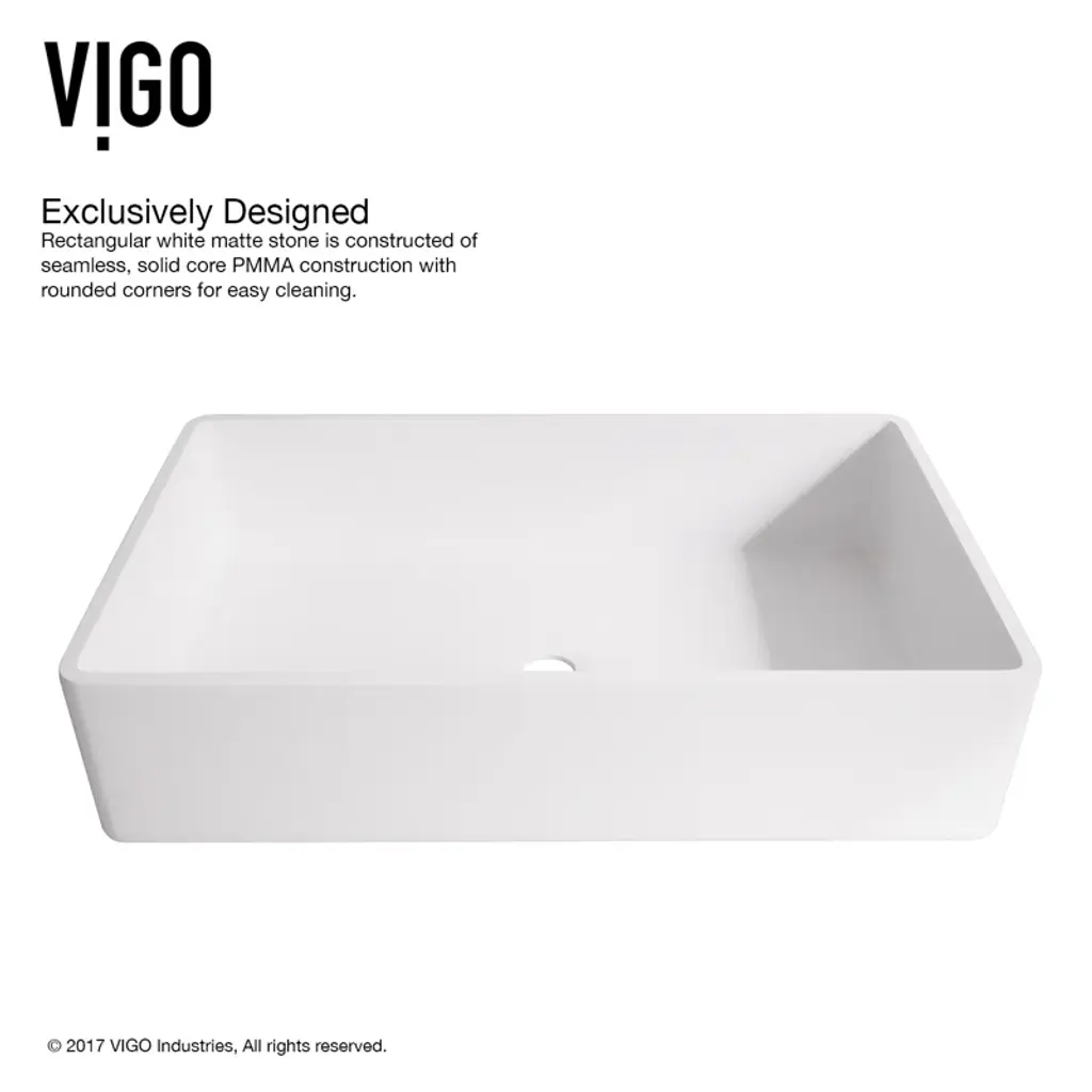 The VIGO Matte Stone Handmade Rectangular Vessel Bathroom Sink combines modern design with practical functionality, perfect for upgrading any contemporary bathroom. This sink features a rectangular shape with gently rounded corners and straight sides, creating a spacious and refined basin that enhances both style and usability. Constructed from VIGO’s proprietary Matte Stone material, it is solid-core and non-porous, providing exceptional resistance to stains, scratches, and impacts. The smooth, matte white finish offers a clean and sophisticated look that integrates effortlessly with various bathroom decors. Designed for easy maintenance and durability, the VIGO Matte Stone sink is a striking centerpiece that adds both elegance and practicality to any vessel sink setup.