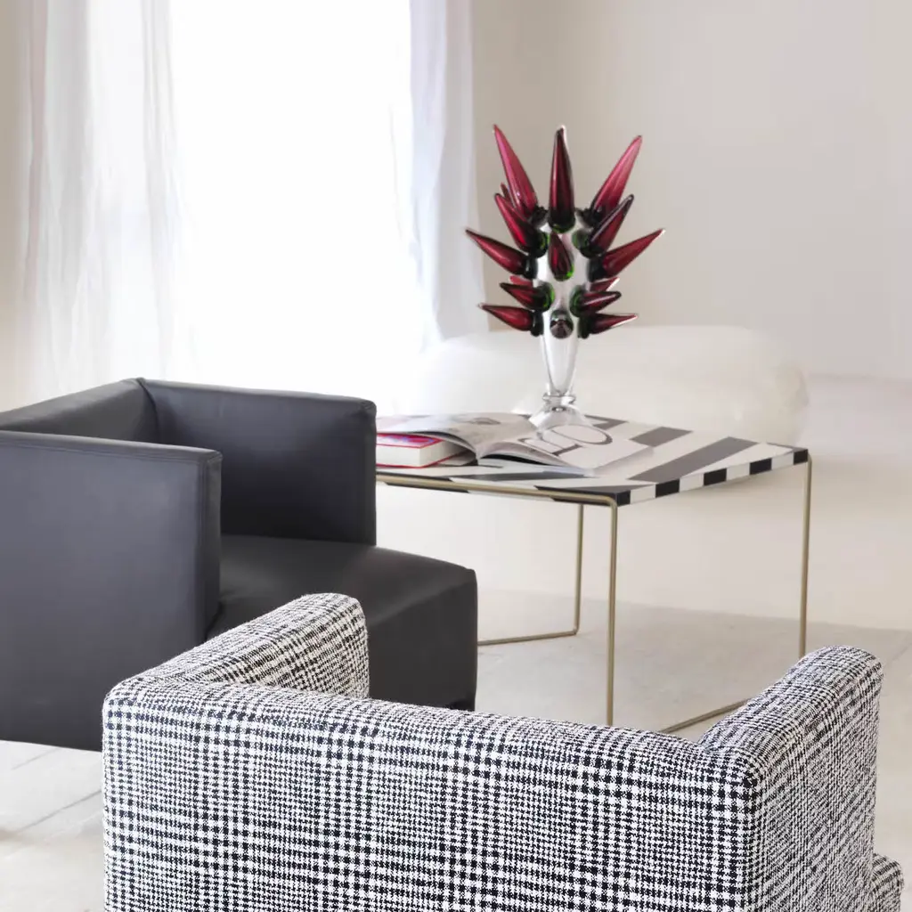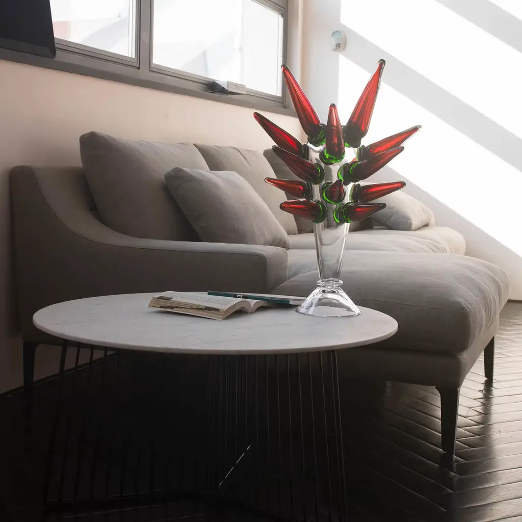 An eccentric design distinguished by thorn-like protuberances in green and red mark this precious glass vase. Brimming with sculptural allure, it is sure to catalyze attention wherever it is placed, thanks to its interplays of dramatic volumes, transparencies, and generous dimensions. A conical base completes this singular glass masterpiece designed by Borek Sipek.