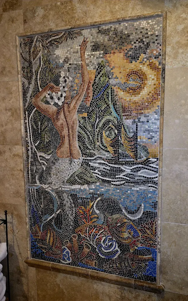 Transform your space into an enchanting underwater escape with our Mermaid Scene Mosaic Mural. This stunning piece of art is meticulously handcrafted using 100% natural stones and decorative tiles, ensuring that each mosaic is unique and full of character. Imagine the beauty of a serene marine landscape captured in exquisite detail. Our mural features the enchanting back of a mermaid gracefully saluting the sun as she sits at the edge of the sea, creating a mesmerizing focal point for any room. Below her, vibrant sea plants and playful fish dance within the waves, bringing to life the richness of the underwater world.The Mermaid Scene Mosaic Mural is not just a decorative piece; it tells a story of beauty and tranquility, evoking the soothing essence of the ocean. Whether you're looking to enhance your living room, bathroom, or any other space, this mural will transport you to a dreamy seaside paradise every time you step into the room.Crafted with care and passion, this mosaic mural is designed to stand the test of time. The natural stones not only provide aesthetic appeal but also ensure durability, making it suitable for both indoor and outdoor settings. Each tile is expertly placed to create a stunning visual experience that will leave your guests in awe.Bring a touch of whimsy and elegance to your home décor with the Mermaid Scene Mosaic Mural. It's a perfect gift for ocean lovers, art enthusiasts, or anyone who appreciates handcrafted art. Elevate your decor with this breathtaking mural that captures the magic of the sea and the beauty of mermaid lore. Embrace the spirit of the ocean and make this unique piece a centerpiece of your home today!