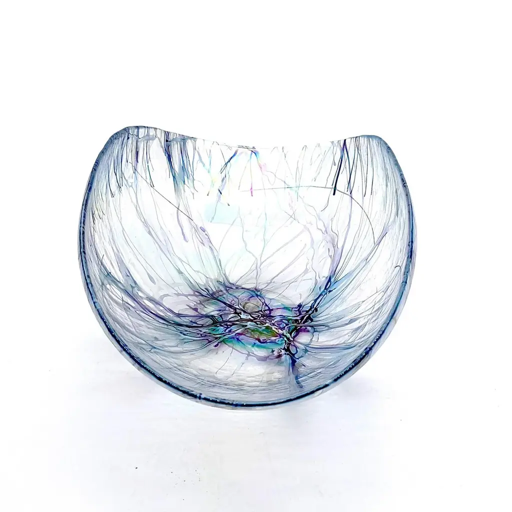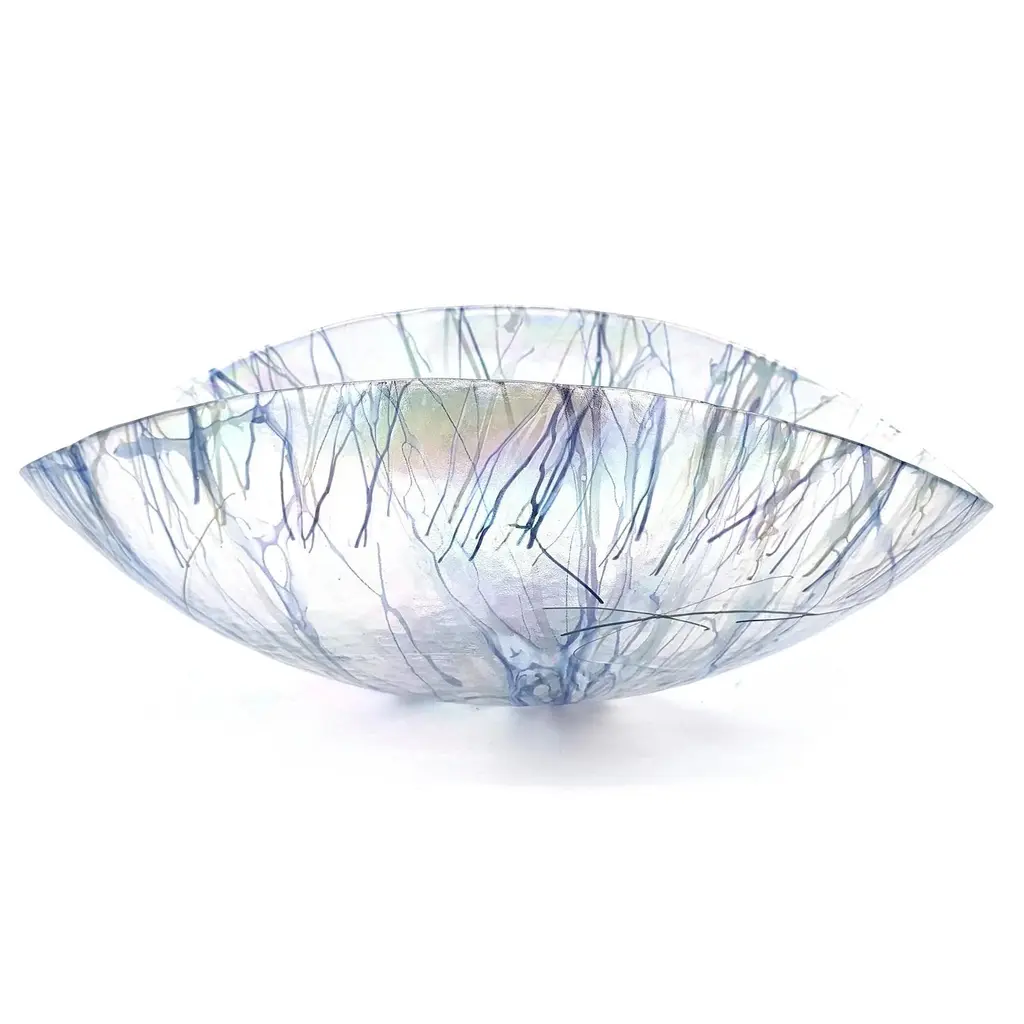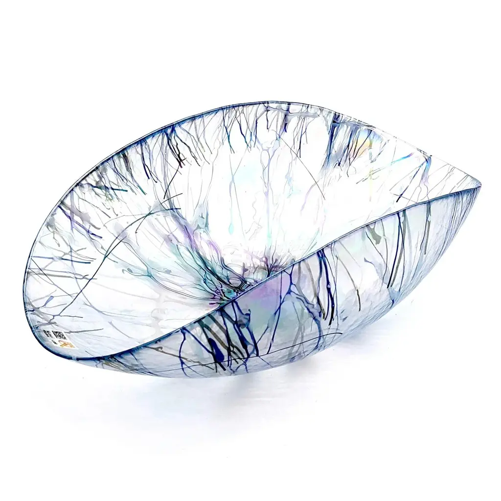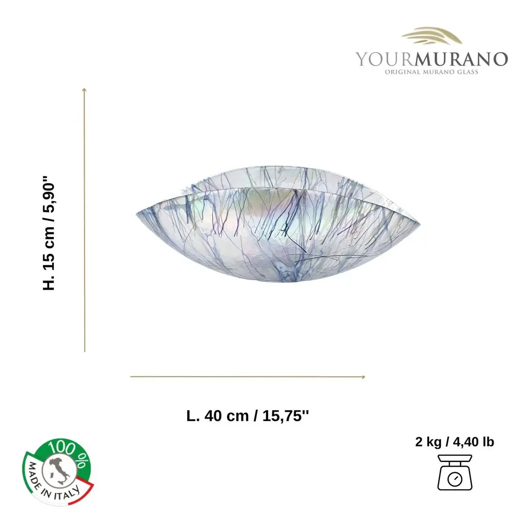 Splendid Murano glass bowl with the characteristic "cartoccio" shape. The purity of Murano crystal, combined with inlays of white, gray and turquoise threads, generates a fascinating luminous effect. The mother-of-pearl finish adds a touch of timeless refinement, enhancing this authentic handcrafted masterpiece. Labeled by Maker