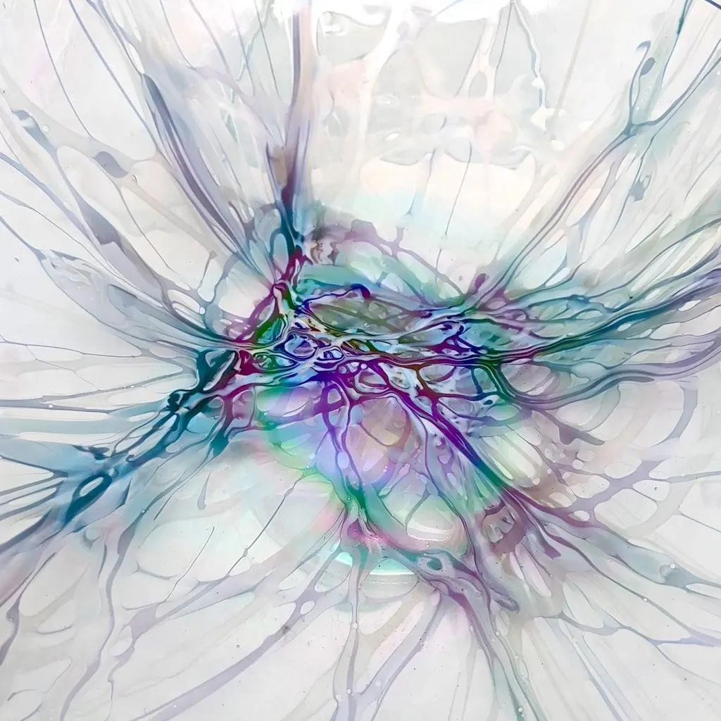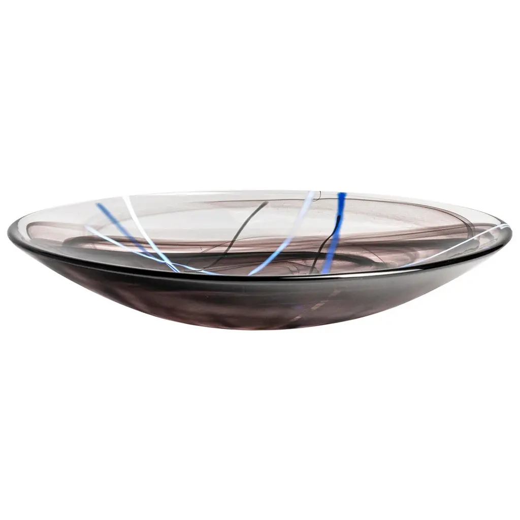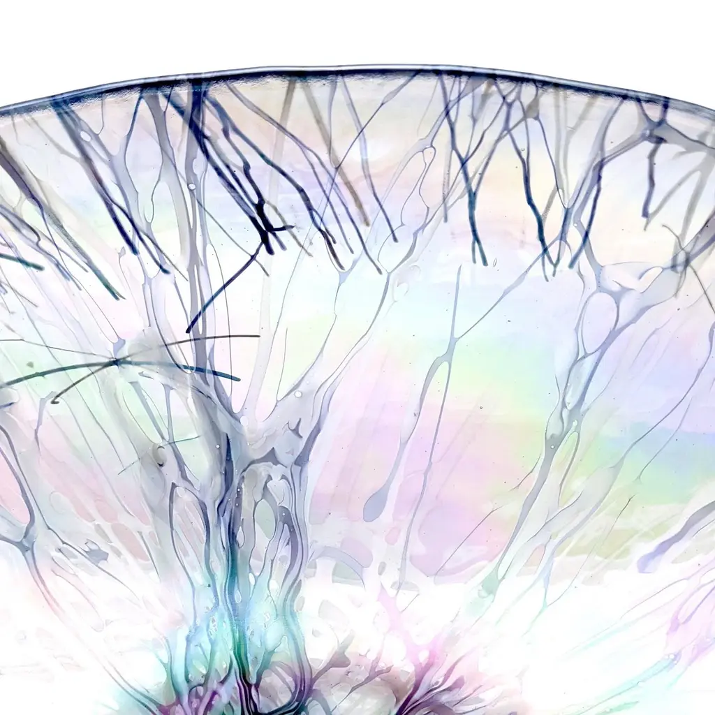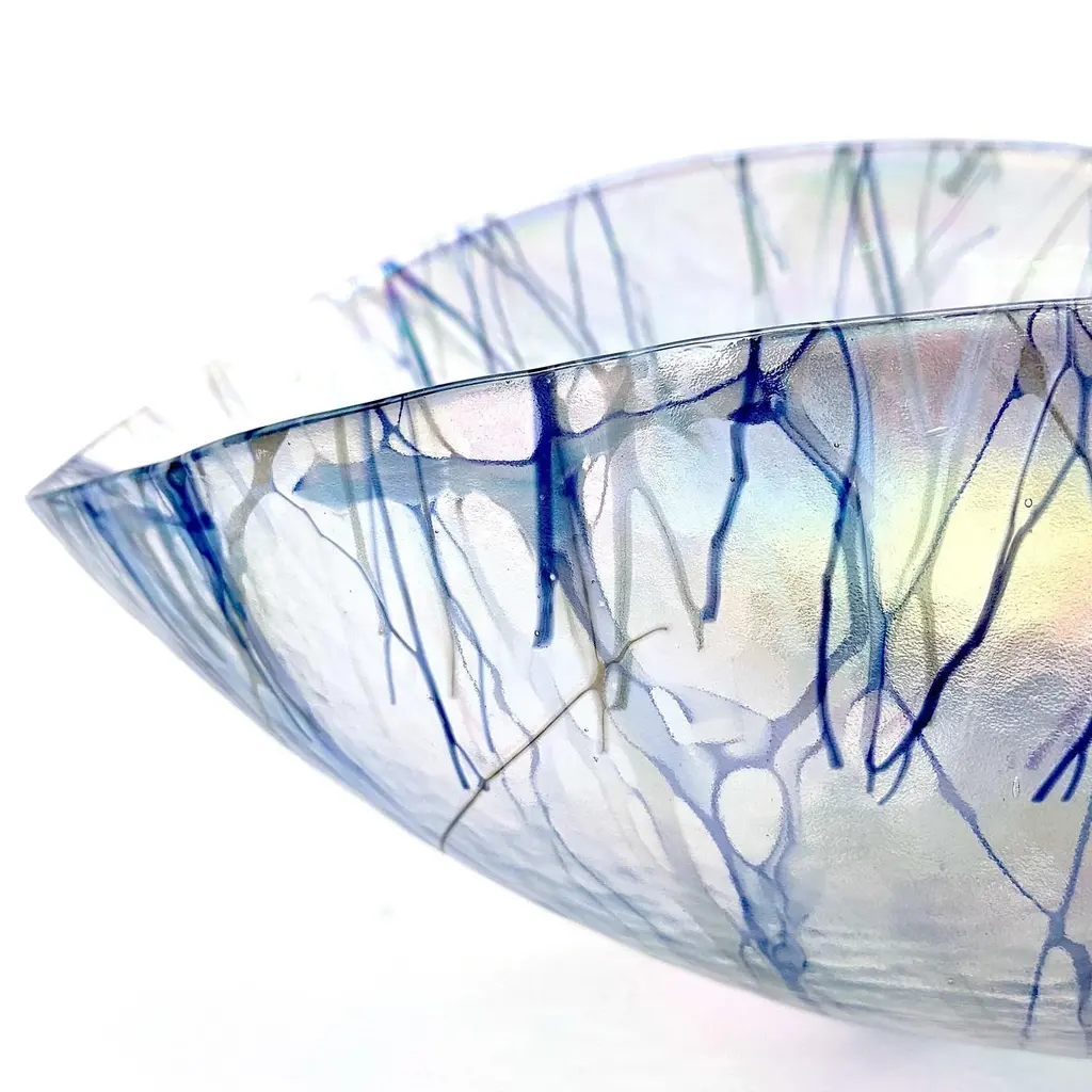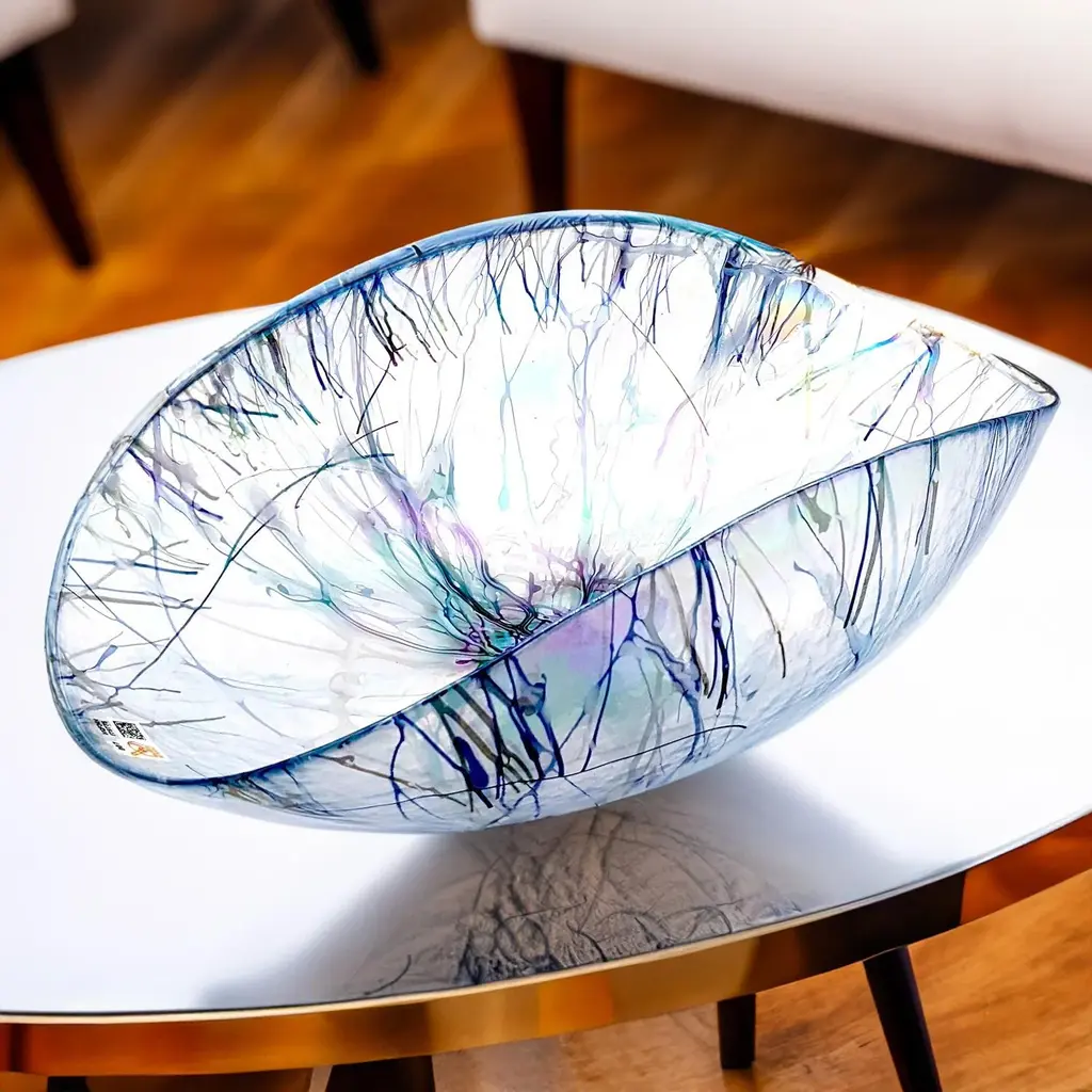 Splendid Murano glass bowl with the characteristic "cartoccio" shape. The purity of Murano crystal, combined with inlays of white, gray and turquoise threads, generates a fascinating luminous effect. The mother-of-pearl finish adds a touch of timeless refinement, enhancing this authentic handcrafted masterpiece. Labeled by Maker