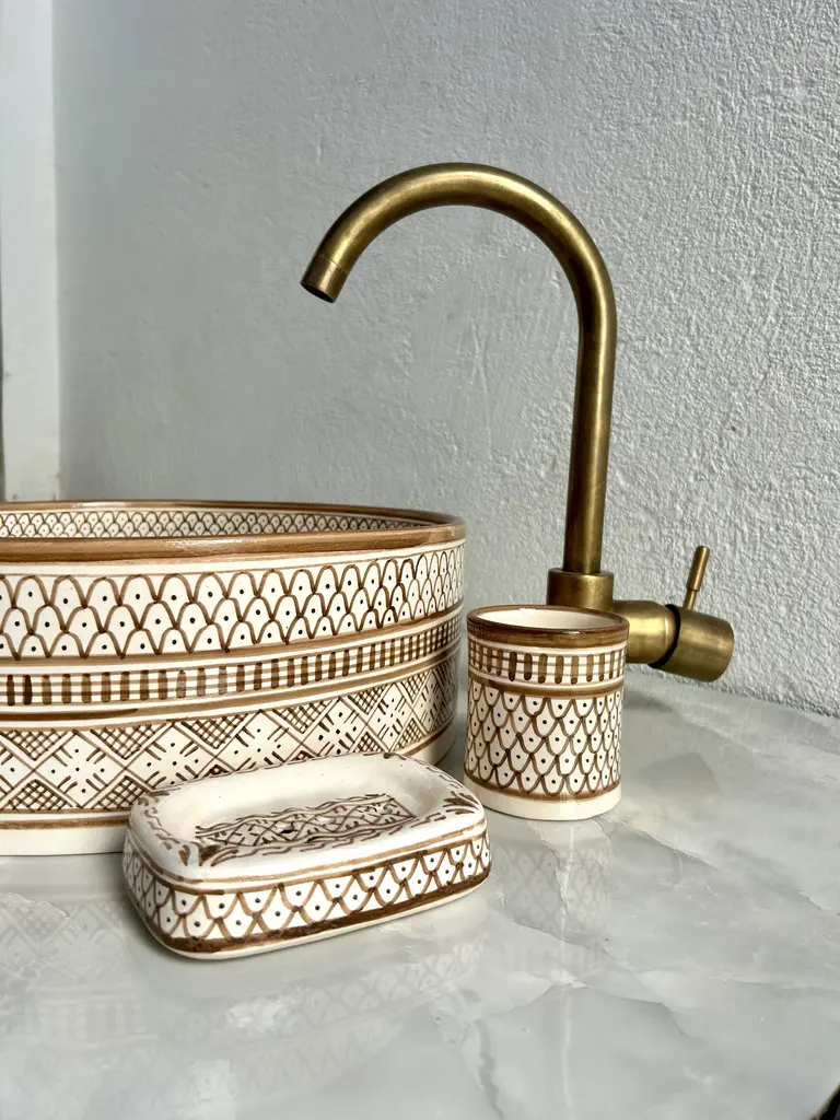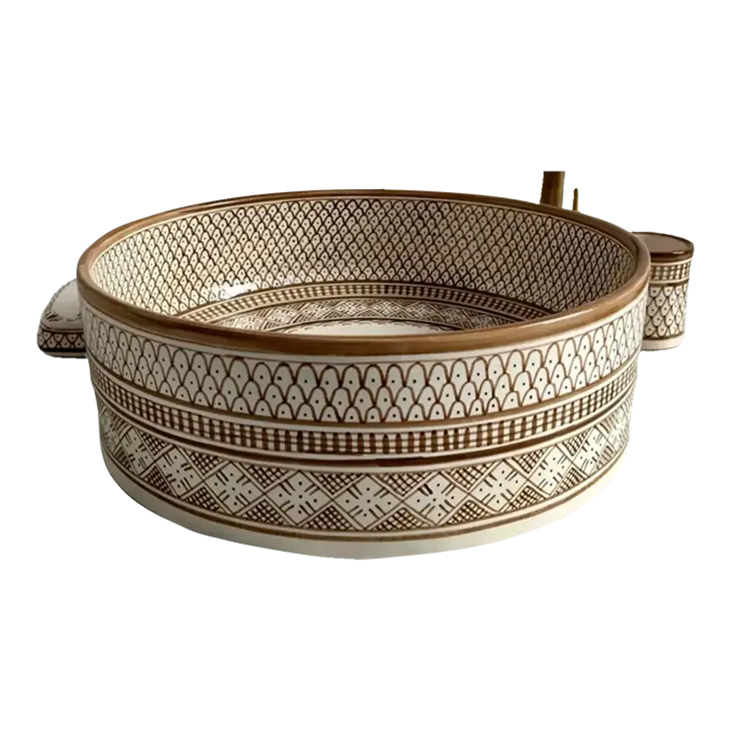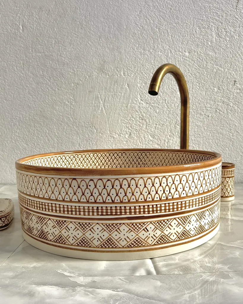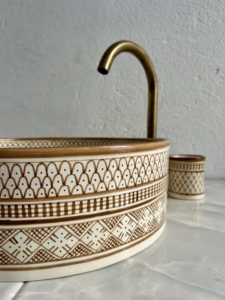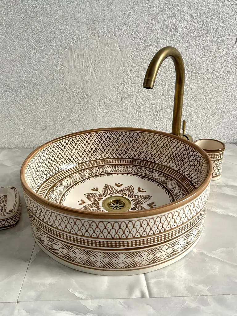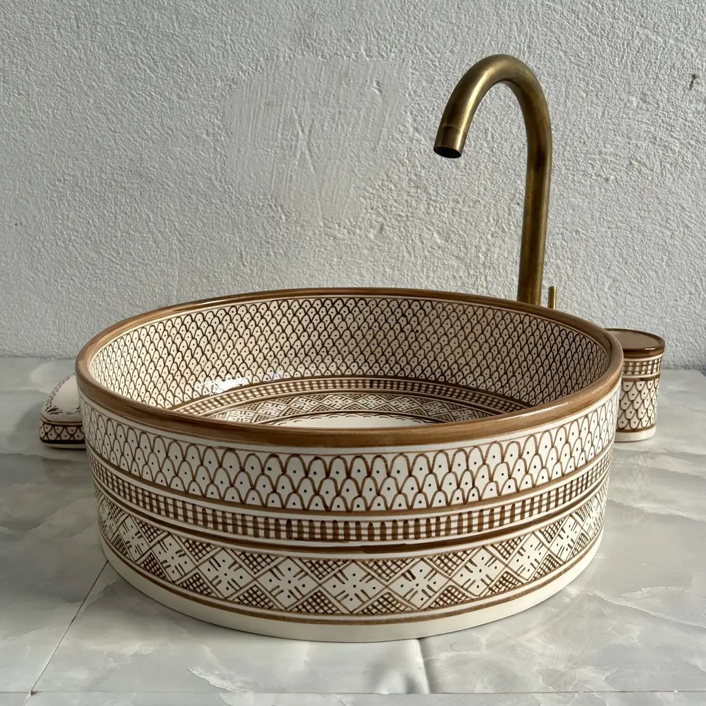 Moroccan Ceramic Caramel Tan Sink For Bathroom, Round Sink Basin With Brass Drain & Soap Holder And Cup - 3 Pieces