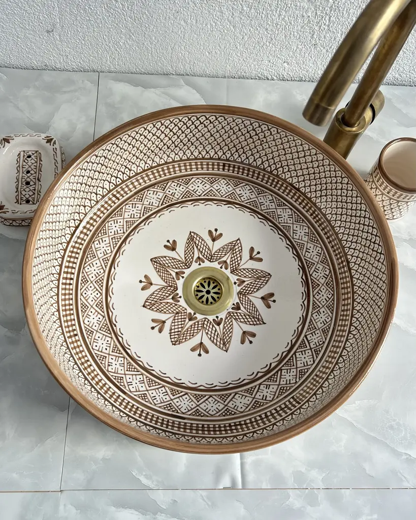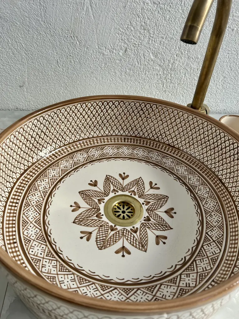 Handcrafted Moroccan 16" Round Caramel Brown Ceramic Sink Bowl Bring a touch of timeless elegance to your bathroom with our 16-inch handcrafted round ceramic sink bowl in a stunning caramel brown. Lovingly crafted by skilled Moroccan artisans, this vessel sink combines durability, artistry, and sophistication to elevate your bathroom decor. The rich caramel brown hand-painted design features a delicate blossom motif at the basin's centerpiece, blending sylvan impressions with authentic Moroccan ceramic aesthetics. Its warm, earthy tones make it a perfect centerpiece for any vanity or countertop, adding character and charm to your space. This contemporary Moroccan washbasin is more than just a functional sink—it's a true work of art. Each basin is meticulously hand-painted with attention to every detail, ensuring a unique and striking addition to your bathroom. The caramel brown hues breathe life into any space, making it ideal for those seeking a bold yet elegant bathroom fixture. Key Features: Authentic Moroccan Craftsmanship: Handcrafted by skilled artisans using time-honored techniques. Warm Caramel Brown Design: A hand-painted blossom motif inspired by Moroccan aesthetics. Durable Ceramic Construction: Built to last with exceptional quality and artistry. Premium Brass Drain Included: Complements the design for a functional and elegant finish. Perfect Size: 16-inch round shape, suitable for modern, rustic, or mid-century bathroom styles. Uniquely Handmade: Each sink is one-of-a-kind, adding authenticity to your space. Note: Due to the handcrafted nature of this product, slight variations in color and pattern may occur, making each piece unique. Transform your bathroom into a sanctuary of beauty and elegance with this Moroccan ceramic sink bowl. Its bold caramel brown finish and intricate hand-painted design make it a statement of tradition, artistry, and style that is sure to impress.