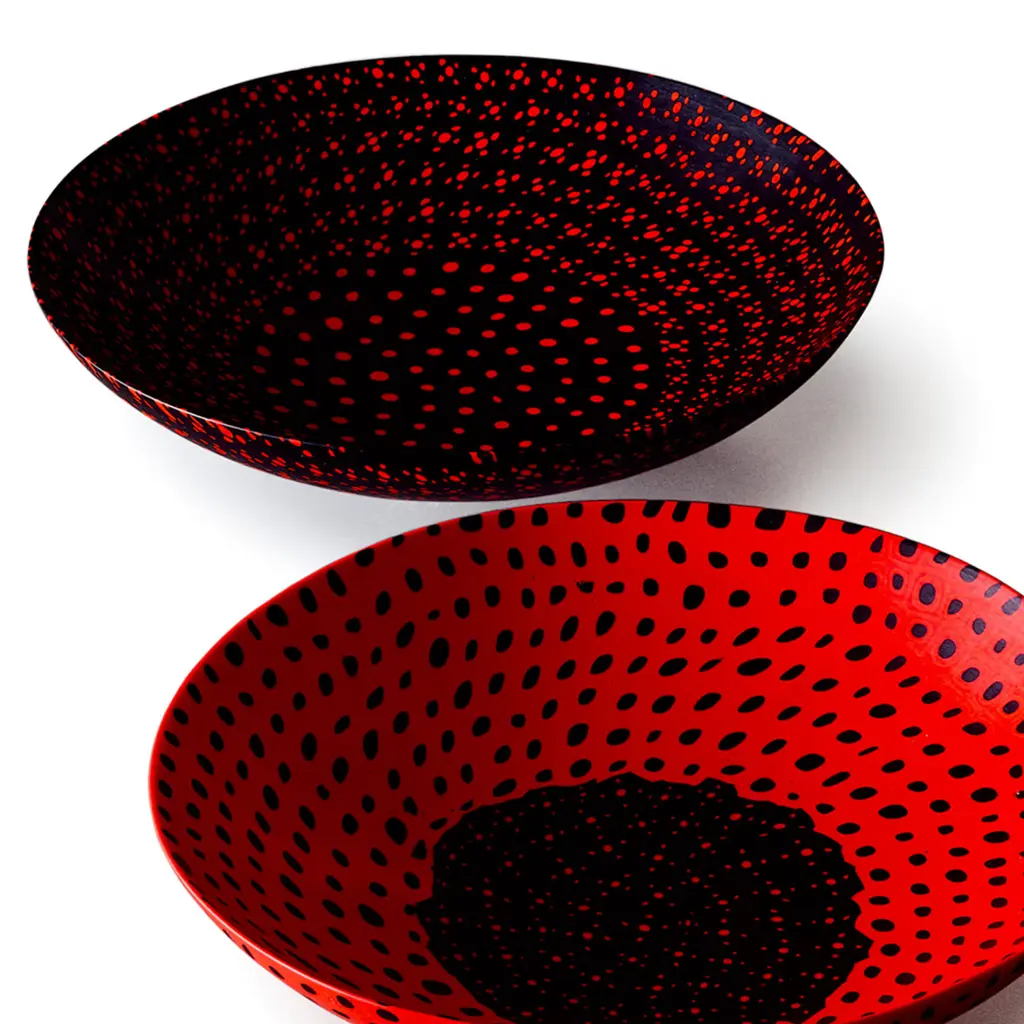 Painstakingly created by hand using the "murrine" technique, this round centerpiece of blown glass is part of a numbered edition of a collection originally designed by Carlo Scarpa in 1940. It features a black and red color combination of striking visual effect created by the graphic signs floating inside the gentle curves and flowing edges of the piece.