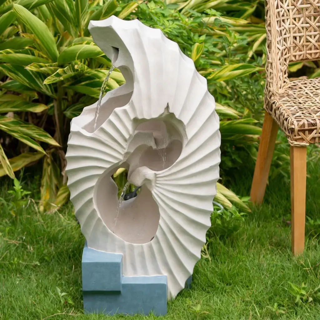 NAYSAYE adds contemporary elegance to indoor and outdoor spaces with this abstract white fountain featuring a blue base and gentle cascading water. Crafted from durable weather resistant polyresin this fountain maintains smooth surfaces and stable construction for long lasting use. The flowing water creates a soothing and peaceful ambiance perfect for gardens patios or indoor areas while its neutral white and blue tones complement modern coastal and transitional decor, serving as an eye catching centerpiece.