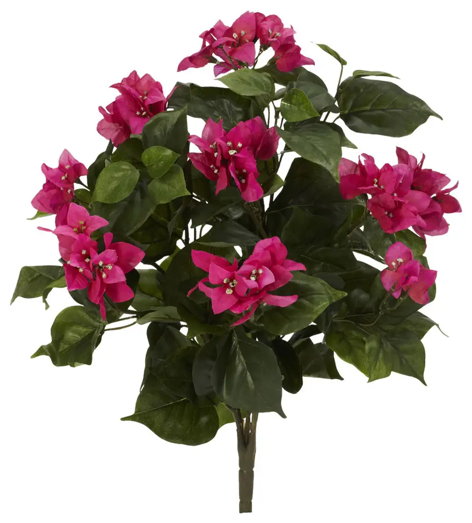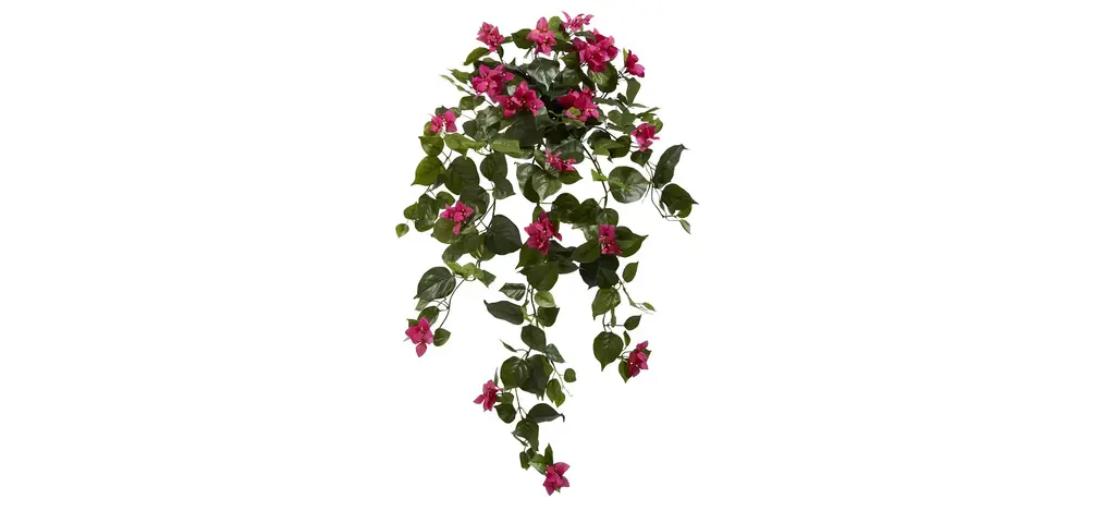 Small, delicate green leaves spill downward and complement the bright, pure blooms of this artificial bougainvillea hanging bush. The combined flowers and green coloring of this plant makes it easy to blend into your wedding reception''s decor. Or, you can place it in a silver vase and use it as a centerpiece alongside other silverware, white napkins, and artificial greenery for a polished look.