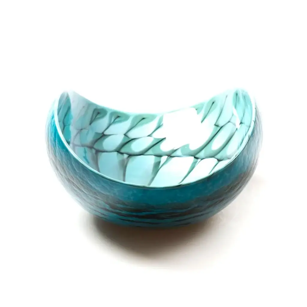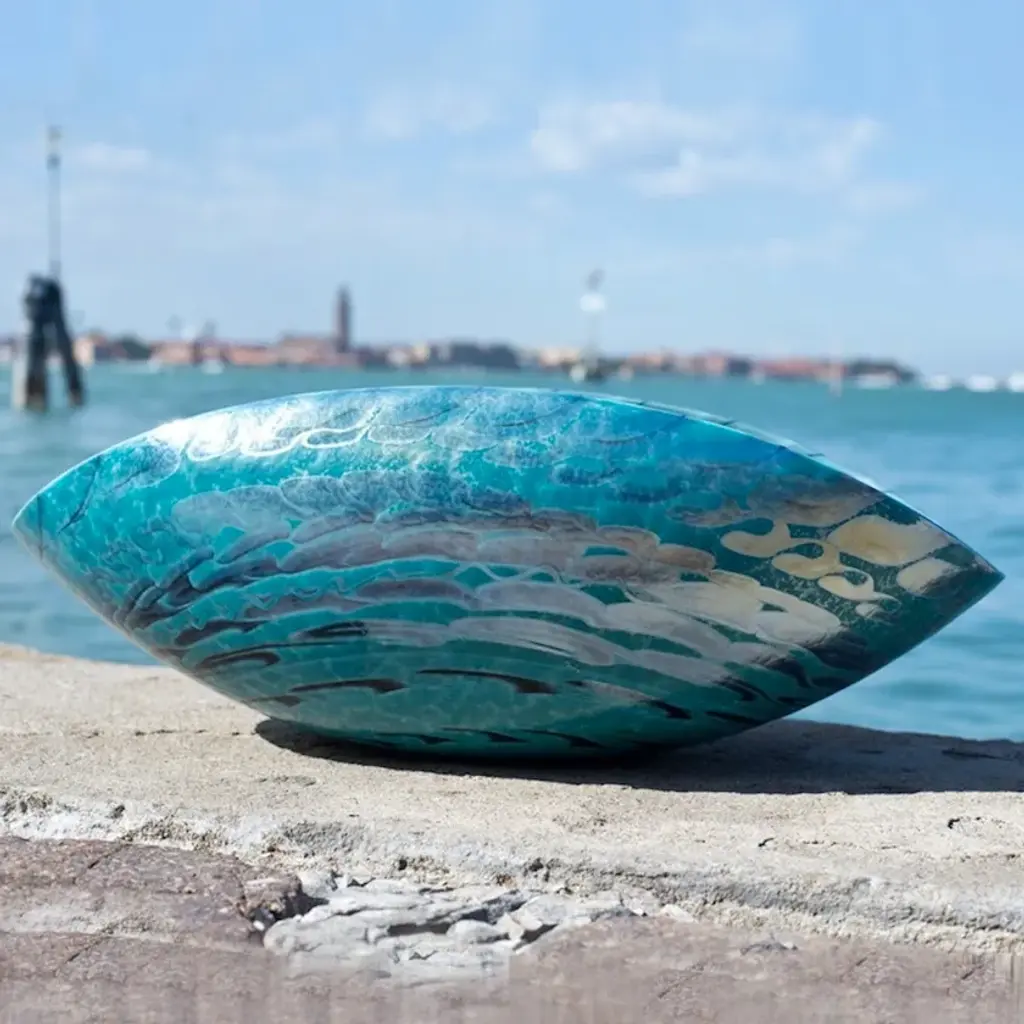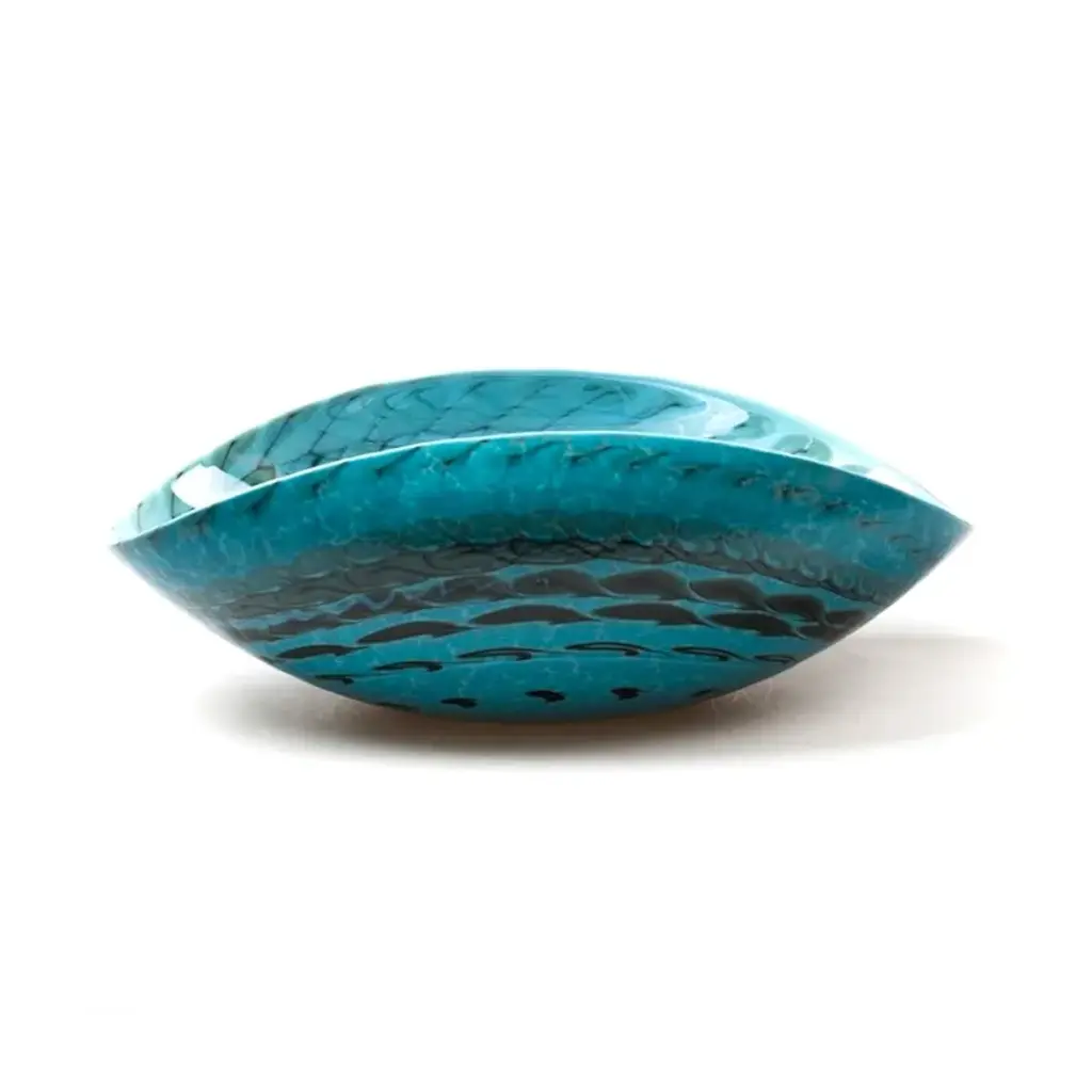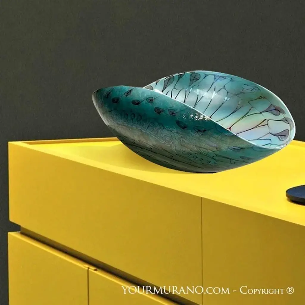 NIZIOLETO is an elegant Murano glass decorative bowl in turquoise color with black threads. This unique creation is perfect to decorate any home space you want.Whether you are looking for an elegant object to decorate your dining room or for an original glass gift idea to impress someone, these decorative bowls in Venetian glass are an ideal solution. Find the perfect match for your home to create a one-of-a-kind interior design style to let anyone speechless! All products are handcrafted and prime production quality. Insubstantial variations in shape, size, colour, small imperfections and/or tiny air bubbles in the glass are not considered defects; they are inevitable and are typical of manual production of the glass and characterize handcrafted production.