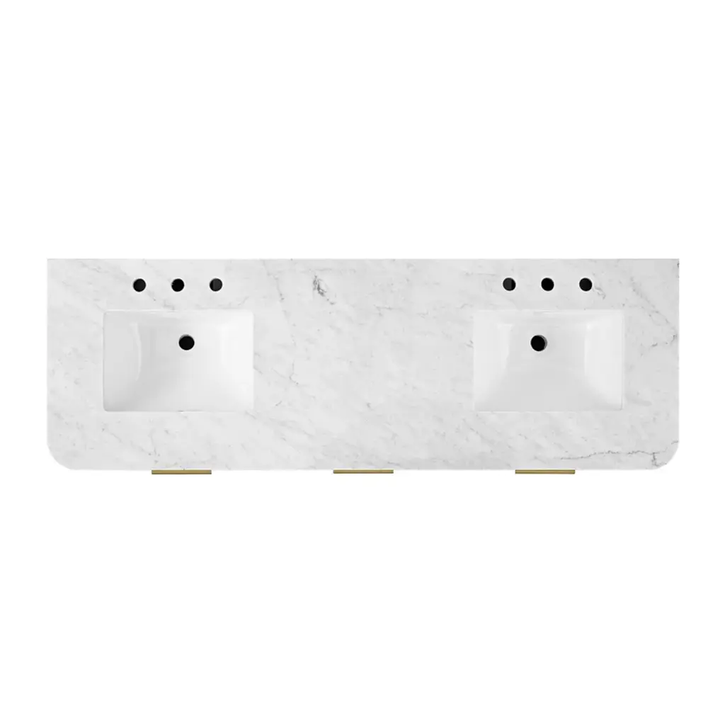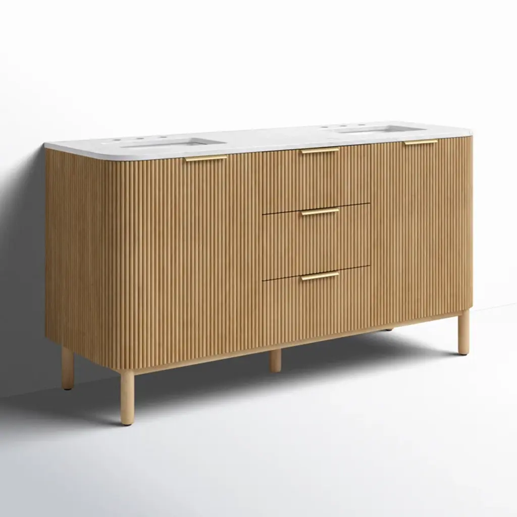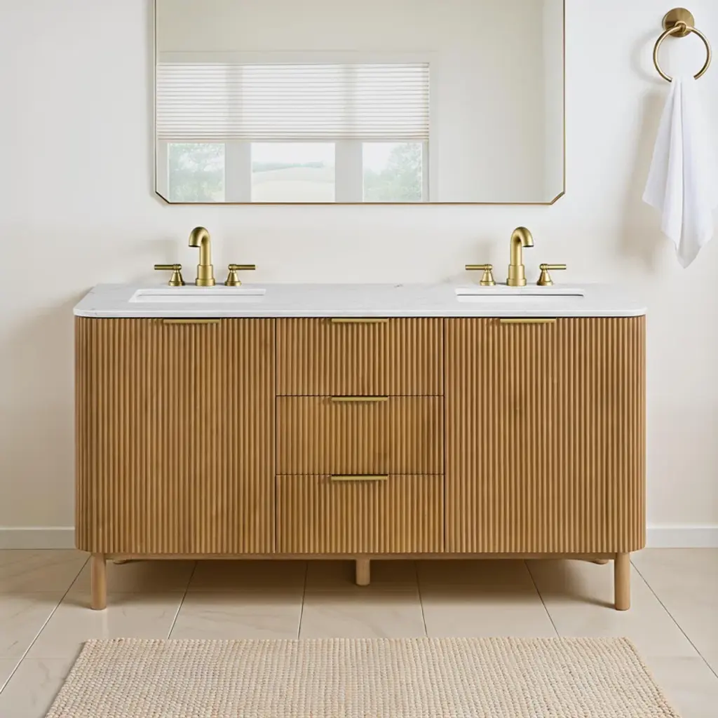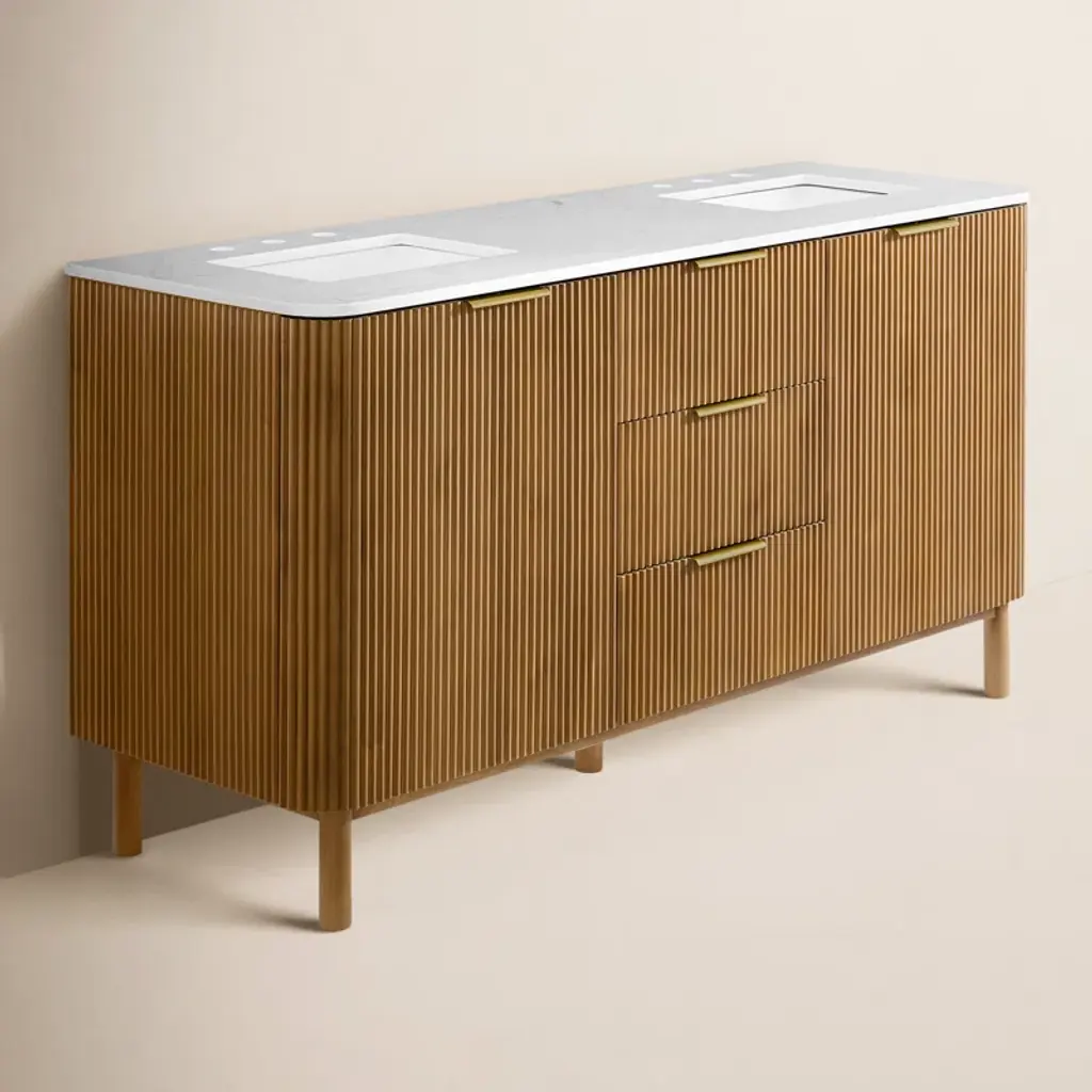 Create a stunning focal point in your master bathroom with our 66 inch double vanity, expertly crafted with Carrara marble countertops and sophisticated reeded cabinetry. This luxury freestanding vanity offers ample storage with multiple soft-close drawers and spacious cabinets, making it perfect for both daily use and high-end bathroom renovations. Designed to blend timeless elegance with modern functionality, it features premium gold hardware and a durable marble surface that adds both beauty and resilience. Available in two designer finishes, each brings its own unique character: Reeded Birch offers a warm golden peanut tone that brightens the space with natural radiance, and Brown Reeded delivers rich, classic warmth for a traditional feel. This designer double vanity transforms any bathroom into a refined sanctuary, combining upscale aesthetics with practical organization. Note: Compatible faucets are sold separately.