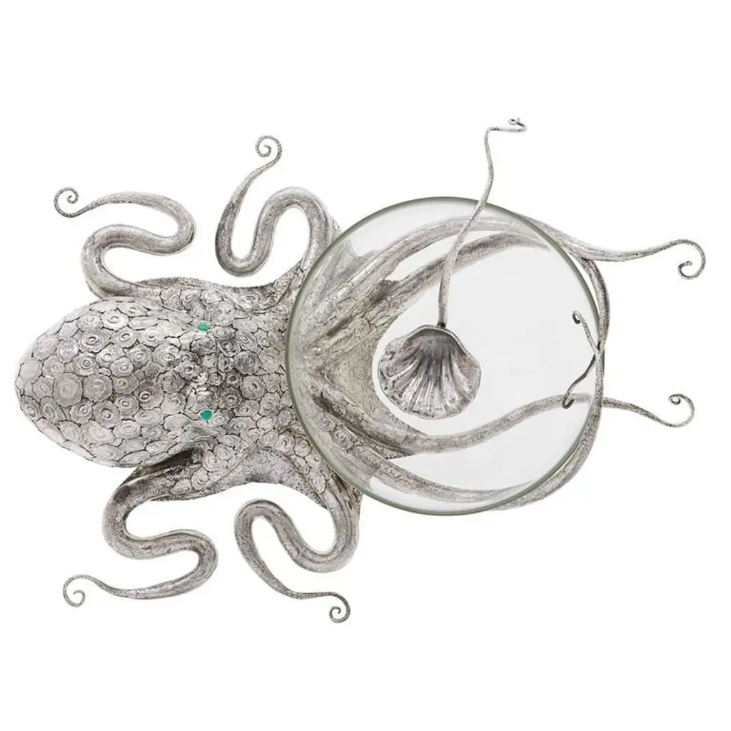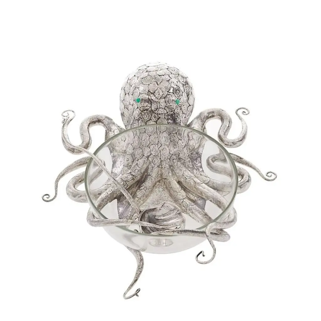 Original octopus tureen in crystal and silver, handmade by Florentine silversmiths, the Lisi Brothers. The hyper realistic centerpiece is transformed into a tureen by adding a detachable bowl. The tureen comes with a bespoke silver spoon. Due to its importance, the piece is made to order.