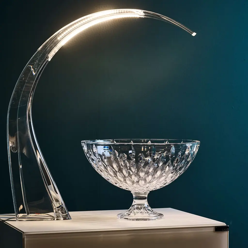 Centrepiece of emotional design available in clear and amber crystal. The engraving, completely made by hand, enhance the brightness of the crystal lightning up any space.