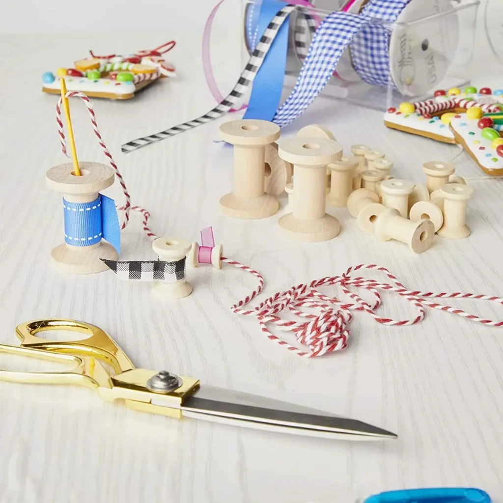Use these empty wood spools to conveniently organize extra ribbon, twine, string, yarn, cord, or wire. Each sanded has a smooth, unfinished surface that can easily be embellished using paint, markers, and glue. Each spool comes in 3 different sizes: small 0.5 x 0.5 x 0.6 inches, medium 0.8 x 0.8 x 1 inches, and large 1.4 x 1.4 x 2 inches. Use them when you create custom flower arrangements, centerpieces, or party decor for a wedding reception, Easter, Valentine's, or holiday celebration.