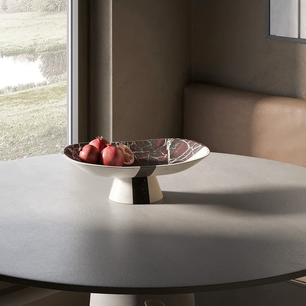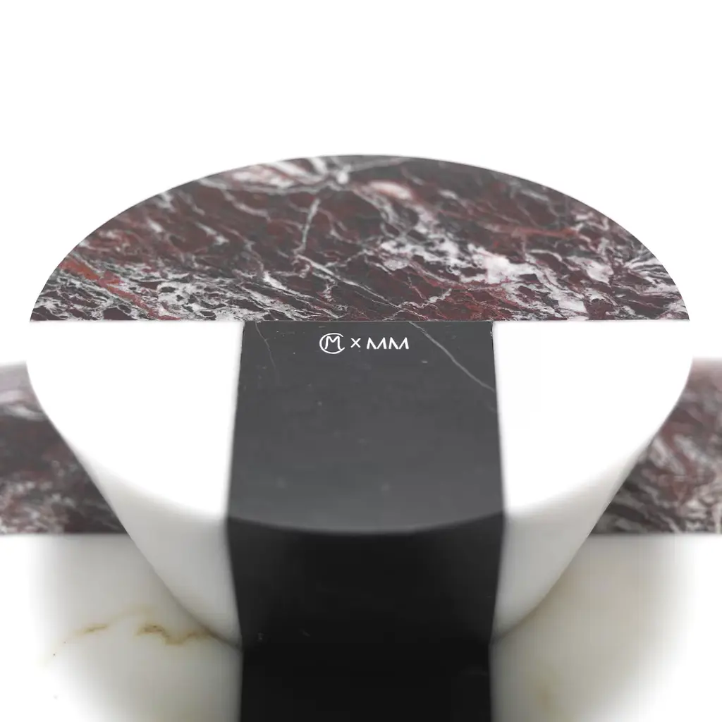 The evocative design of this centerpiece was inspired by the sharp and intense traits of tribal masks. The combination of prized black Marquina, white Michelangelo, and red Levanto marbles creates a flattering contrast of shades and veining, from which emerges the seductive and intricate veining of the red marble. With its original marble designs, Matteo Cibic seeks to celebrate the century-old sculptural tradition of Carrara quarries. Please note that marbles and stones are natural materials and they can differ also if coming from the same quarry or the same block. The product shown may differ from purchased items. Every piece is unique. Please read carefully the unpacking and handling instructions. This item has been part of the exhibition MARMO on display at Artemest Galleria until May 2023.